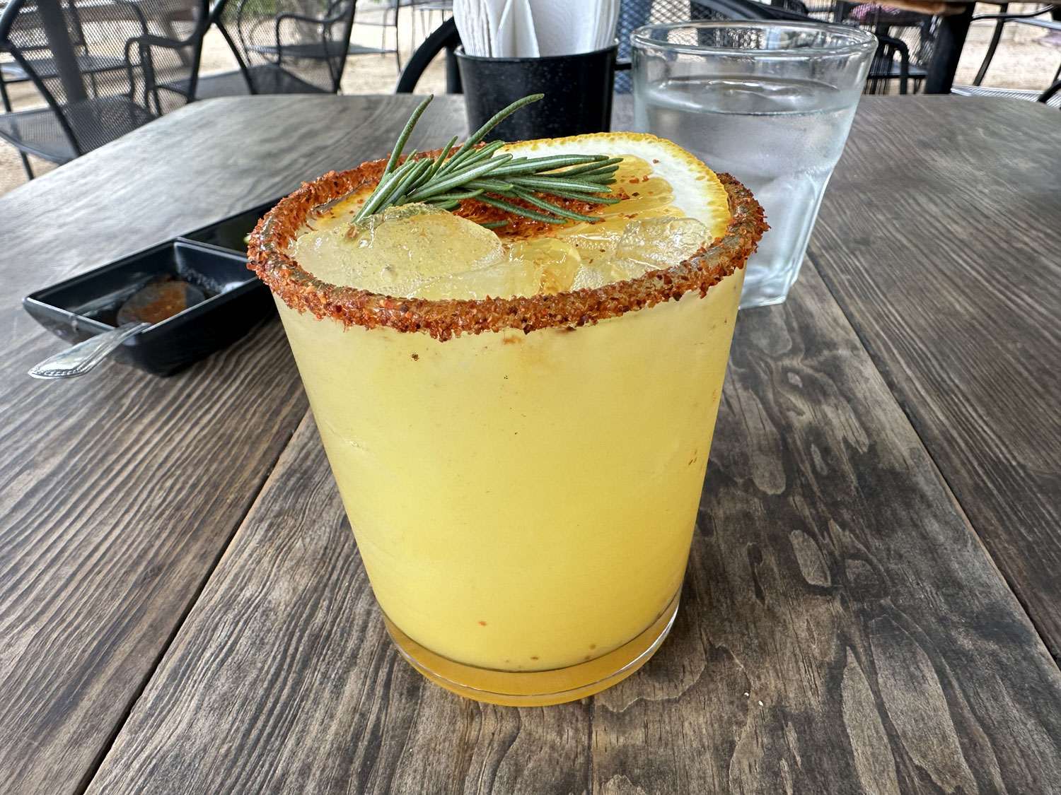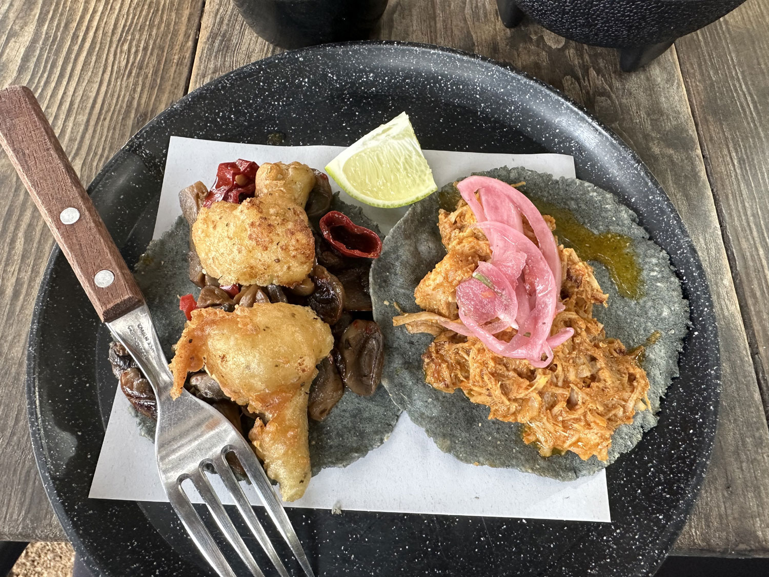 I recently visited just after they had opened to try the restaurant. I decided to start with a Mezcalita, one of their specials, which came with chili salt on the rim. I watched the bartender shake the drink to mix all the ingredients together. Looking at the menu, I decided to try two of the tacos from the seven offered that were different than the traditional beef, el pastor or chicken. So, I ordered the pull pork and the vegan taco that came with mushrooms and tempura cauliflower. The tacos were served on blue corn tortillas and came with a few salsas to add spice if you liked. While I waited for the tacos, I enjoyed some guacamole along with my Mezcalita.