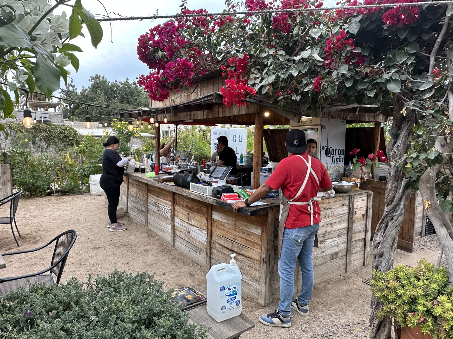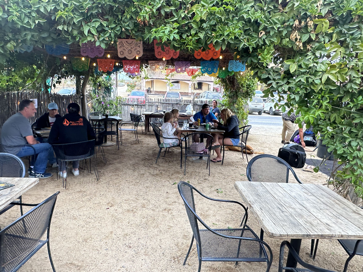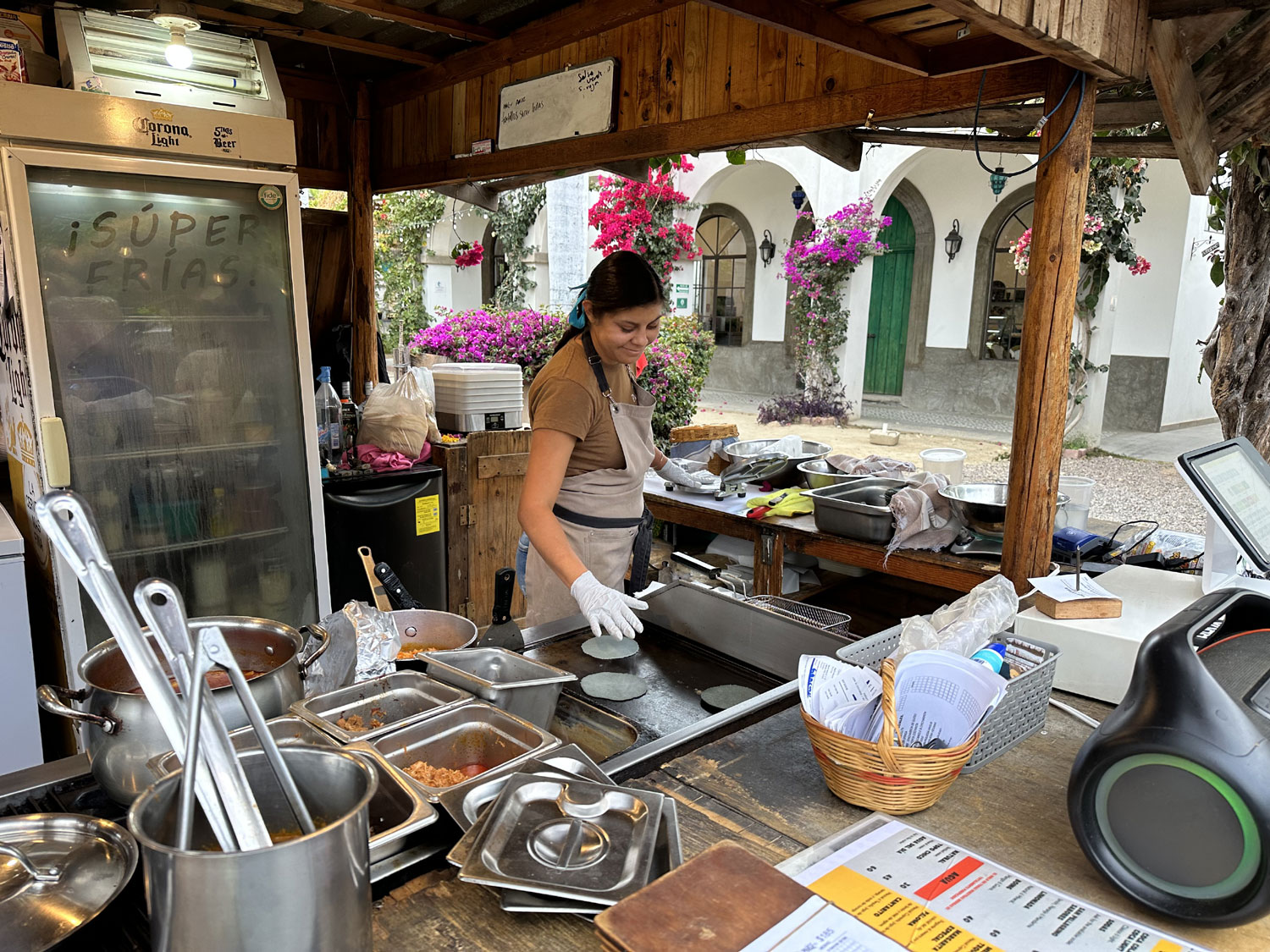 Plaza Victoria on Camino Las Playitas in Las Tunas on the north side of Todos Santos is the home to several different restaurants including Bonjour Madame, Bajavaria and 5 Tacos & a Beer. Open from 4:00 to 10:00 pm everyday but Wednesday, 5 Tacos & a Beer are on the menu for $195 pesos. This small garden restaurant offers outdoor seating and fresh food at a reasonable price. Taco Tuesday includes specials and live music.