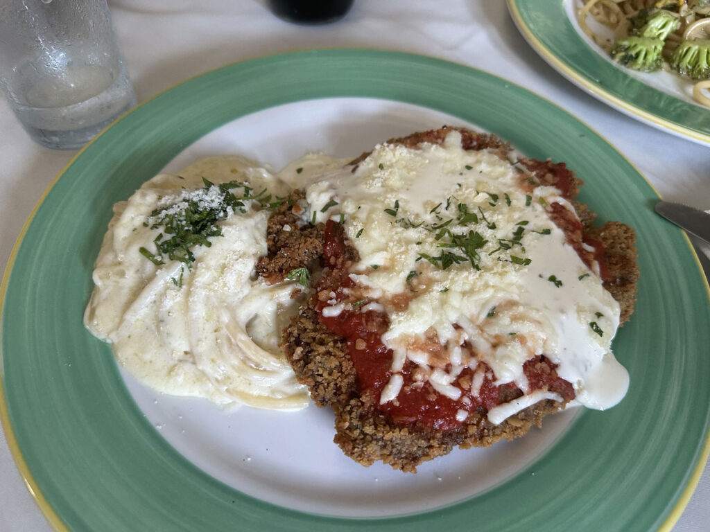 The daily menu offers and appetizer, choice of entrée, and dessert. Chef Enrique came to our table to describe each of the courses and dishes available. Unlike many other Los Cabos restaurants that offer less expensive daily menus and reduce the size of the portions, Alcaravea Gourmet provides an amazing choice of meal. The meal starts with grilled garlic bread, with olive oil and balsamic vinegar. There was a choice of soup or salad as an appetizer – Beth chose the salad and I ordered the minestrone soup. The soup was full of chopped potatoes, mushrooms, carrots, and more – very good. The salad had lettuce, tomatoes, onions, and carrots in an Italian dressing. The entrée choices included veal parmegiana, chicken breast with mushrooms in a marsala sauce, fish in a lemon white wine sauce, and a pasta with butter, garlic and fresh vegetables. Beth selected the pasta, which was an al dente thick spaghetti with broccoli, zucchini, and cauliflower. She said it was very good. I chose the breaded veal with a choice of salad or pasta. The pasta with a white sauce sounded great. The veal was huge and thickly breaded covered with tomato sauce and cheese. There was so much that I took more than half home for another meal. It was delicious. The final course was a small lemon dessert, covered with chocolate and a scoop of whipped cream.