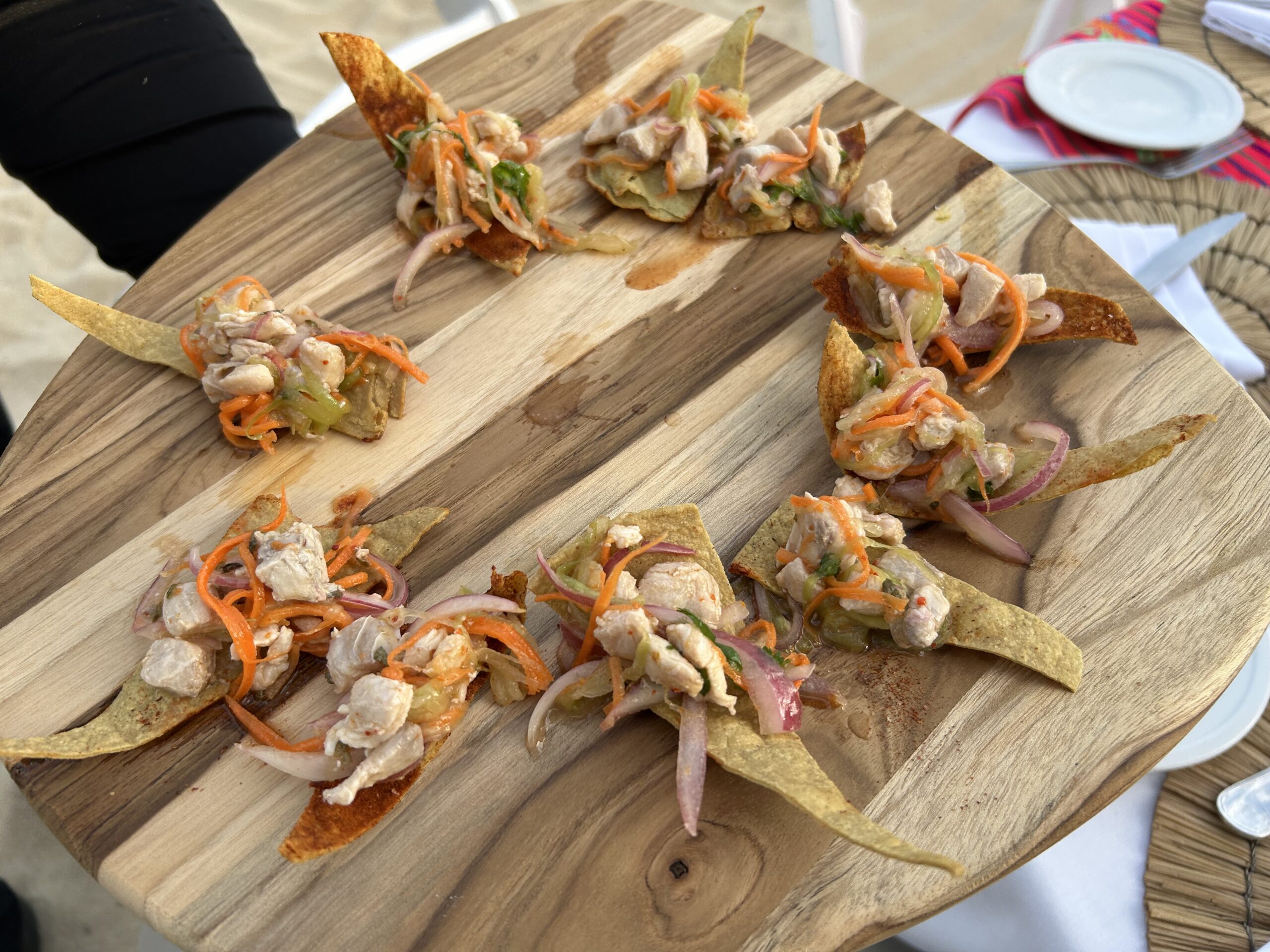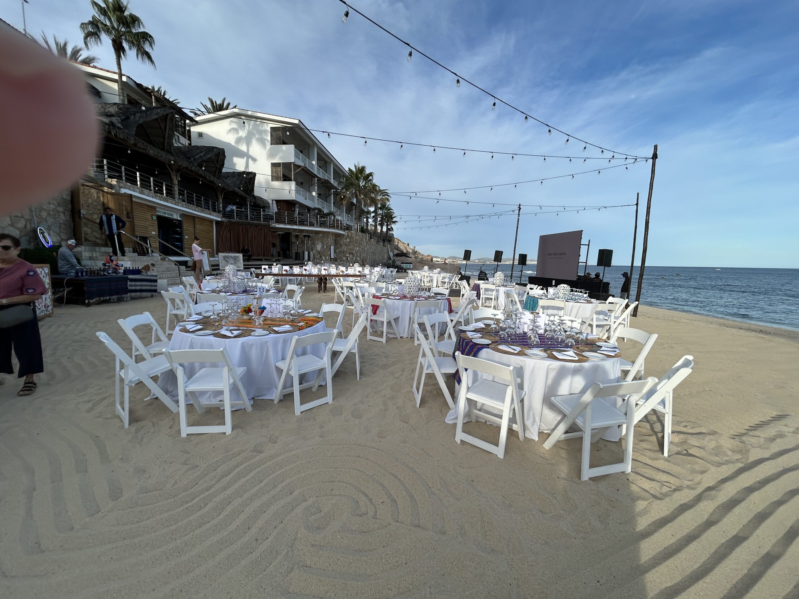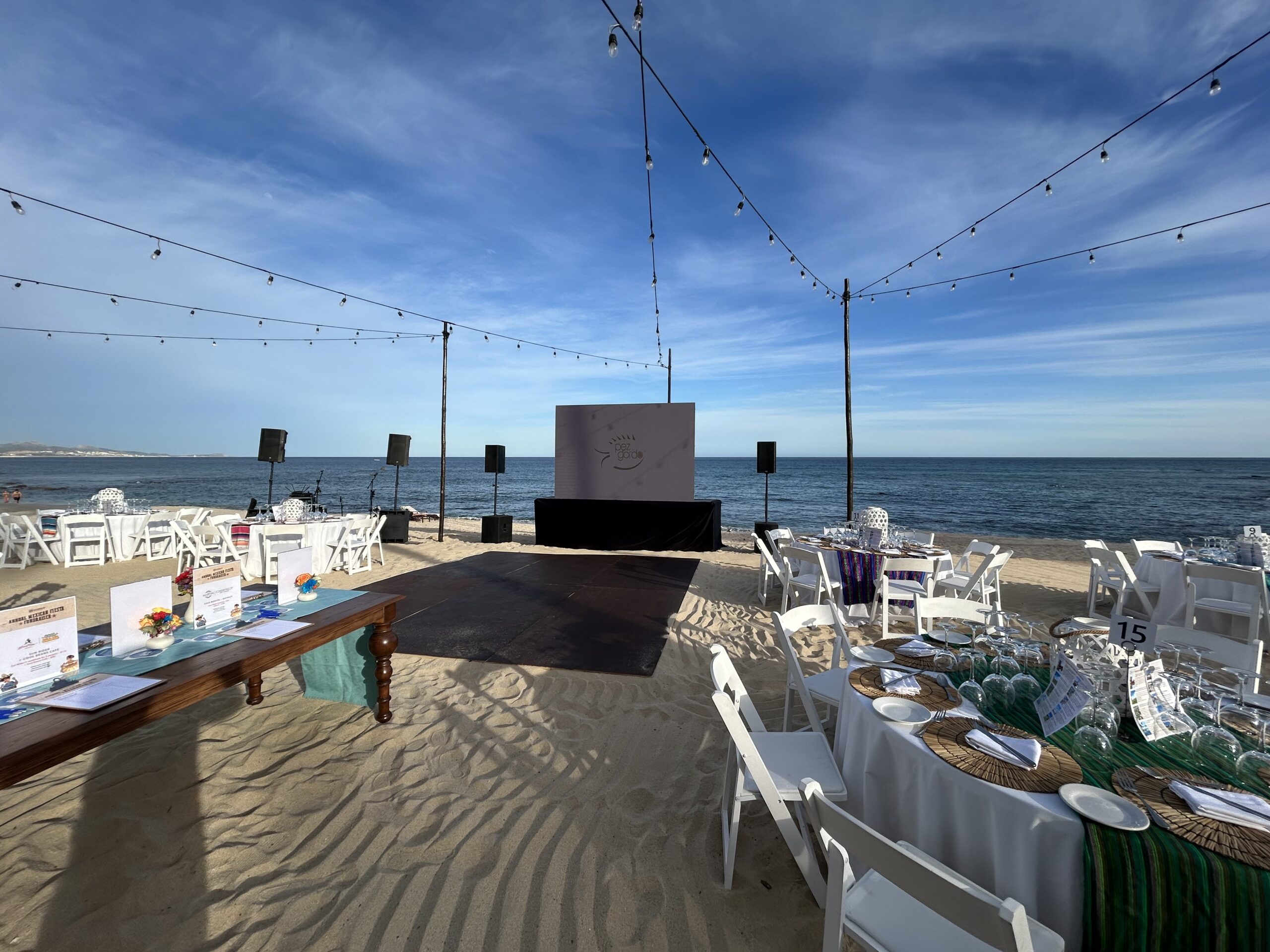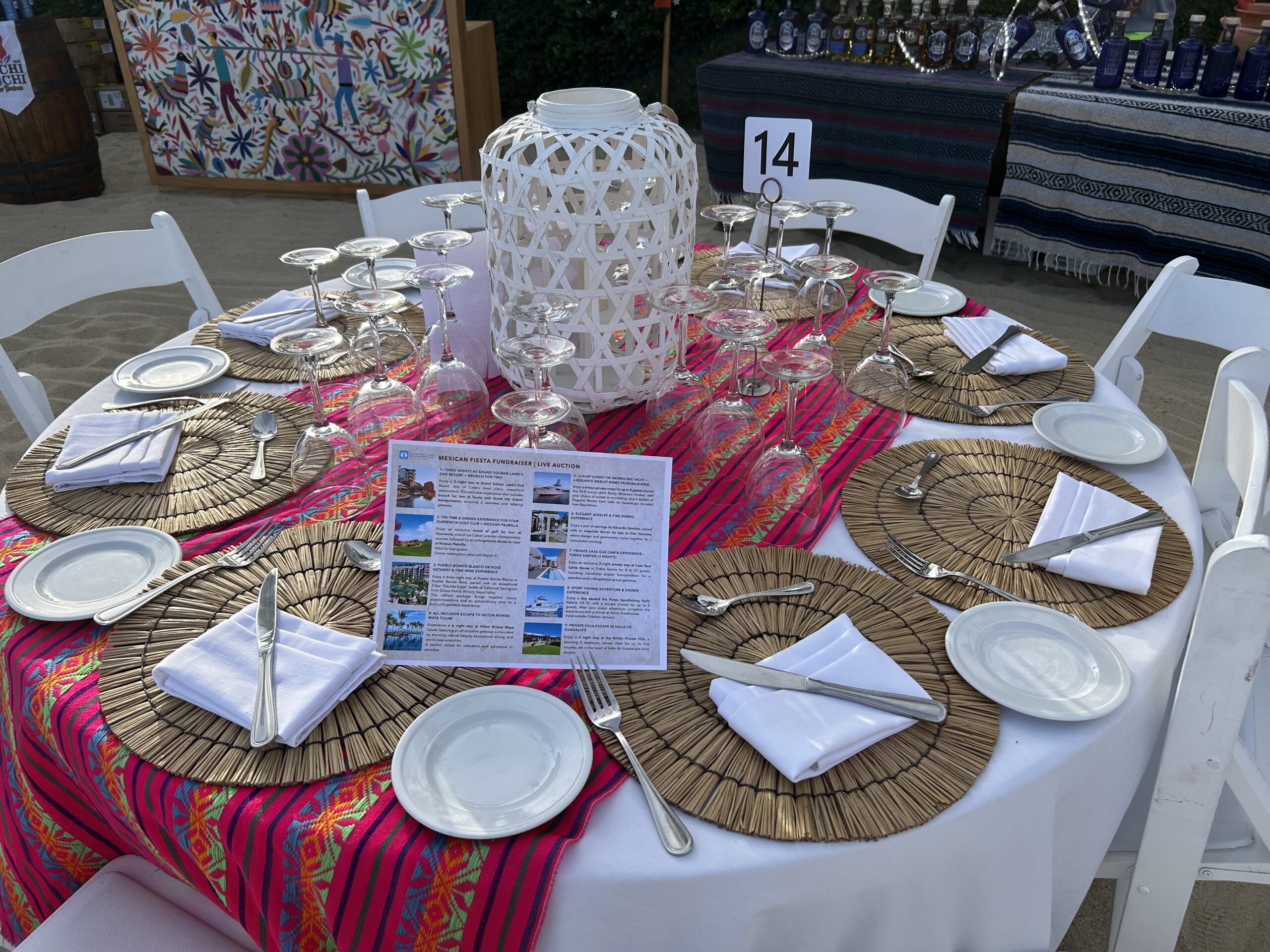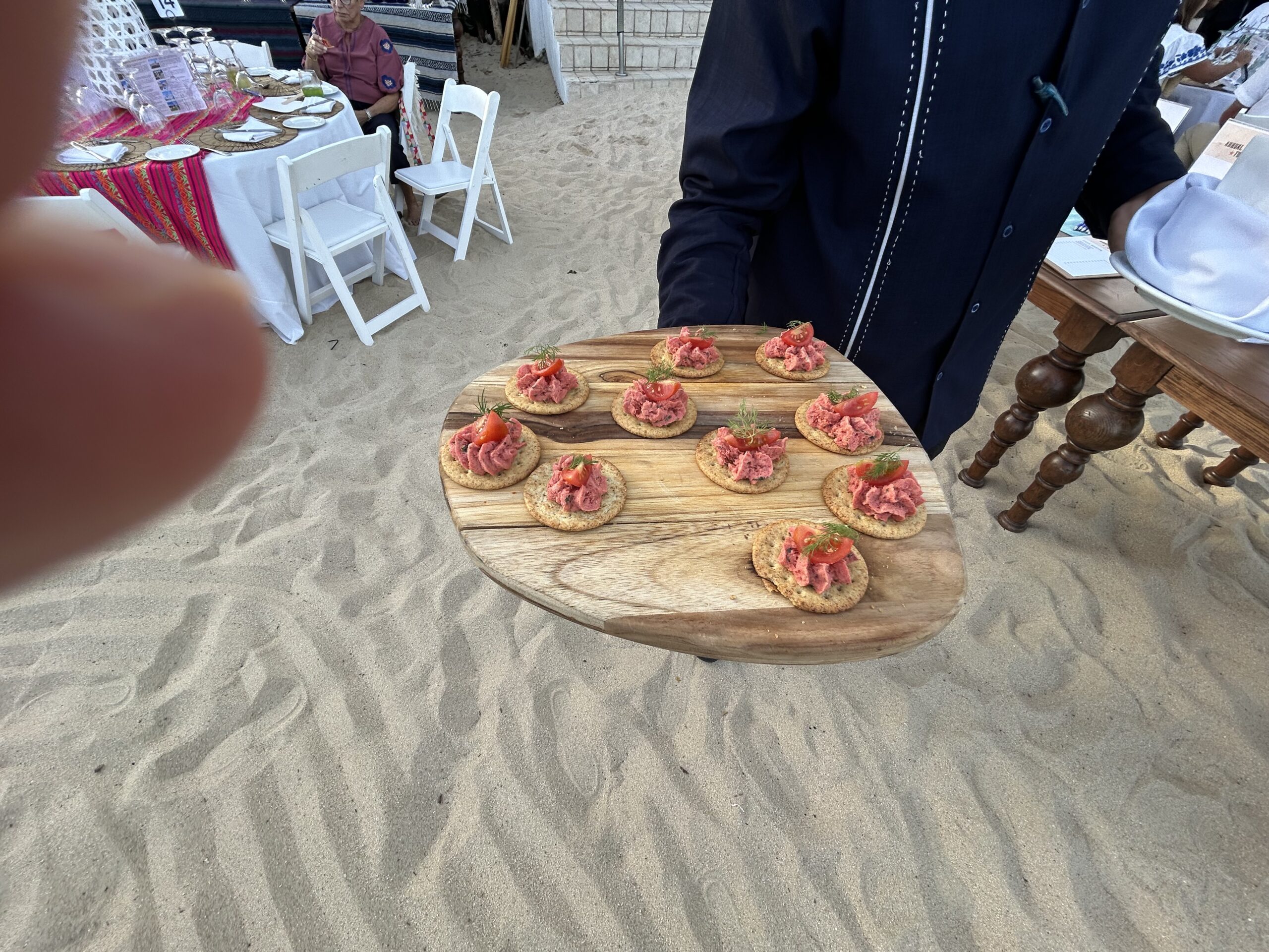 One of the ways that they support their programs is through an annual fundraiser featuring a silent auction, live entertainment and a live auction. This year (2026), it was held on the beach in front of the Cabo Surf hotel and 7 Seas Restaurant. We arrived and received our paddle for the live auction at the entrance to the hotel. Walking through the restaurant and taking the stairs down to the beach, we were welcomed and offered a cocktail. Tables were pre-assigned and we were informed that during the first hour, cocktails would be available at the bar set up by Tequila Cabo Unico and Cincos Perro Tequila. We had a very interesting fruity cocktail. Soon, servers started to walk through the attendees and the tables and offer a number of different small appetizers on trays – buschetta, mini-fish tacos, tuna crackers. Down the center of the area, a series of tables were set up for the silent auction that had about a dozen interesting items and experiences donated by supporters of the Boys & Girls Club. On each table was a card outlining the eight items that would be sold at the live auction.