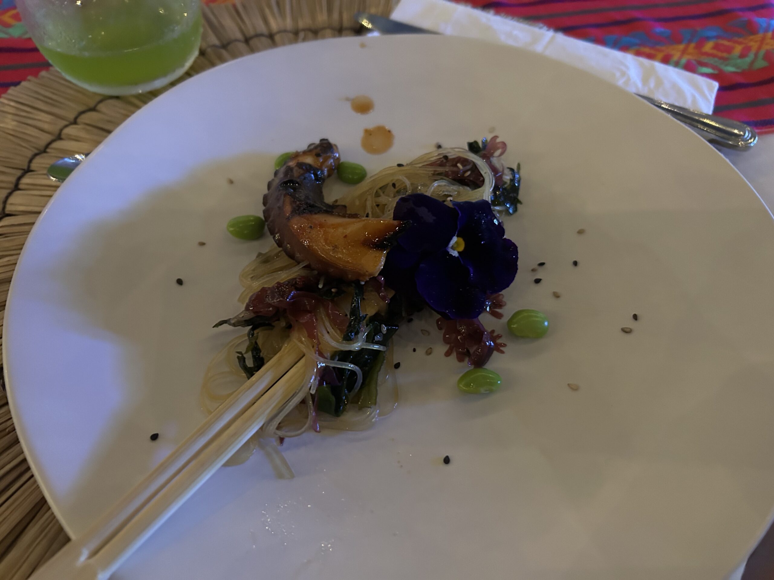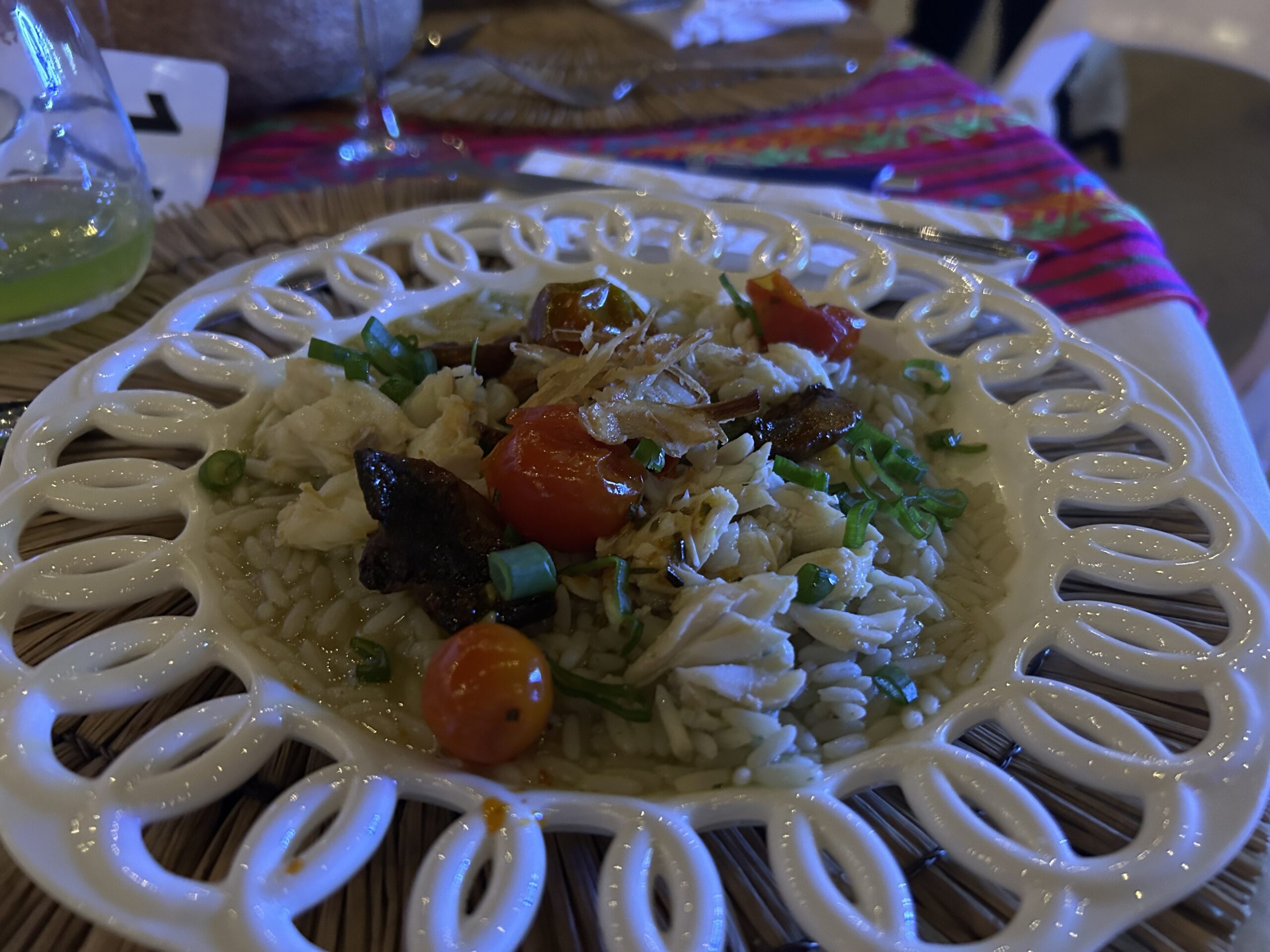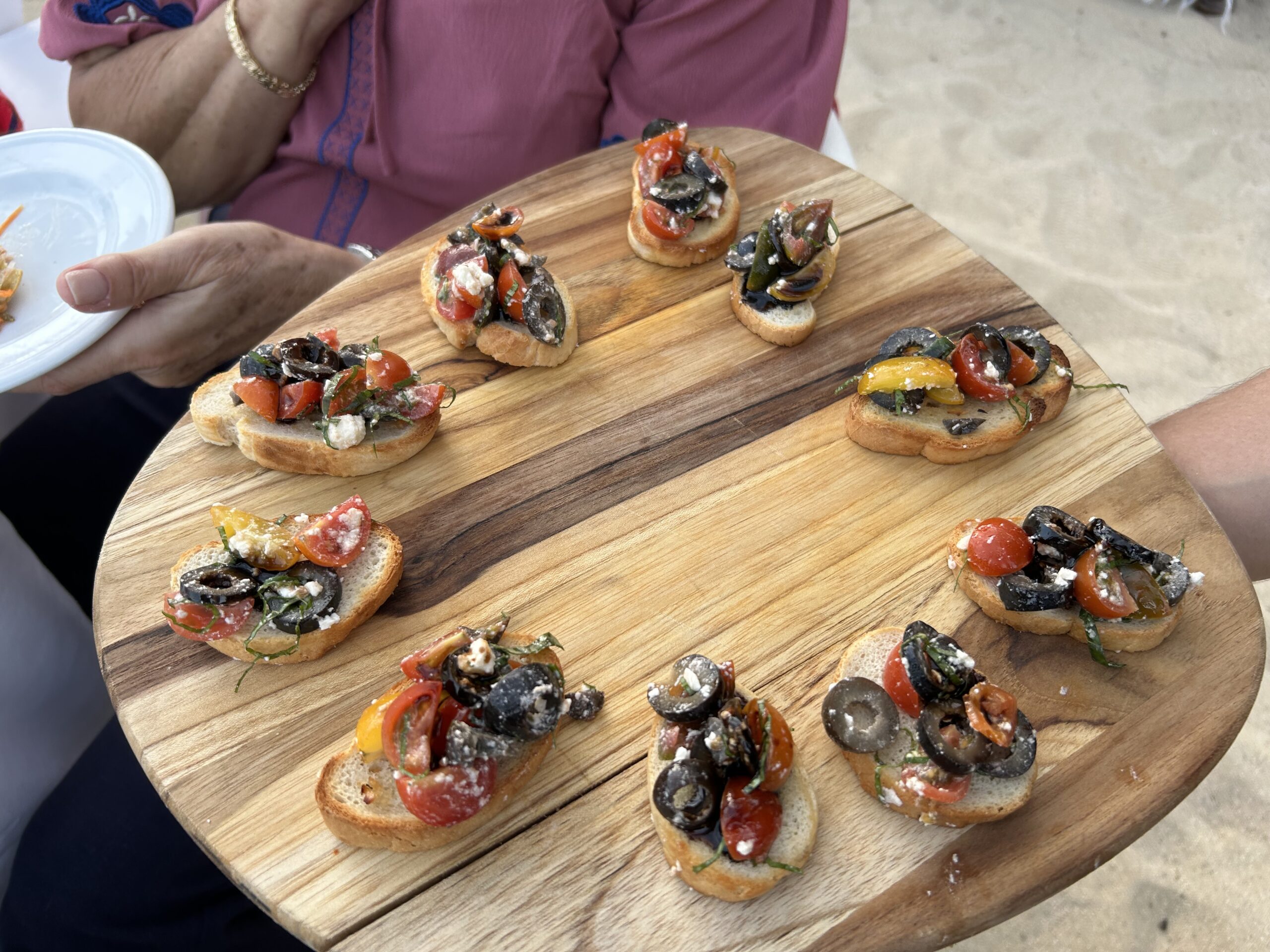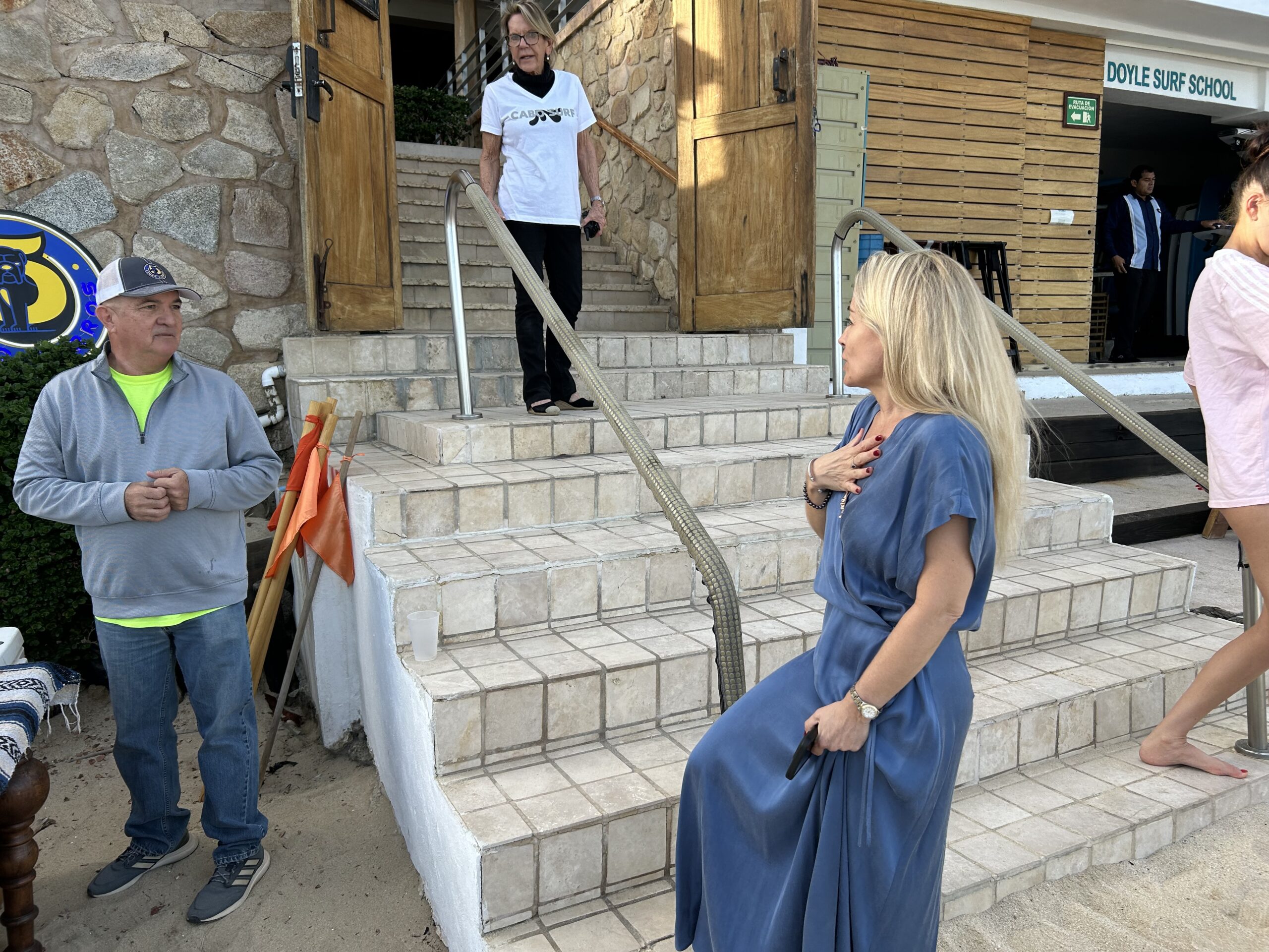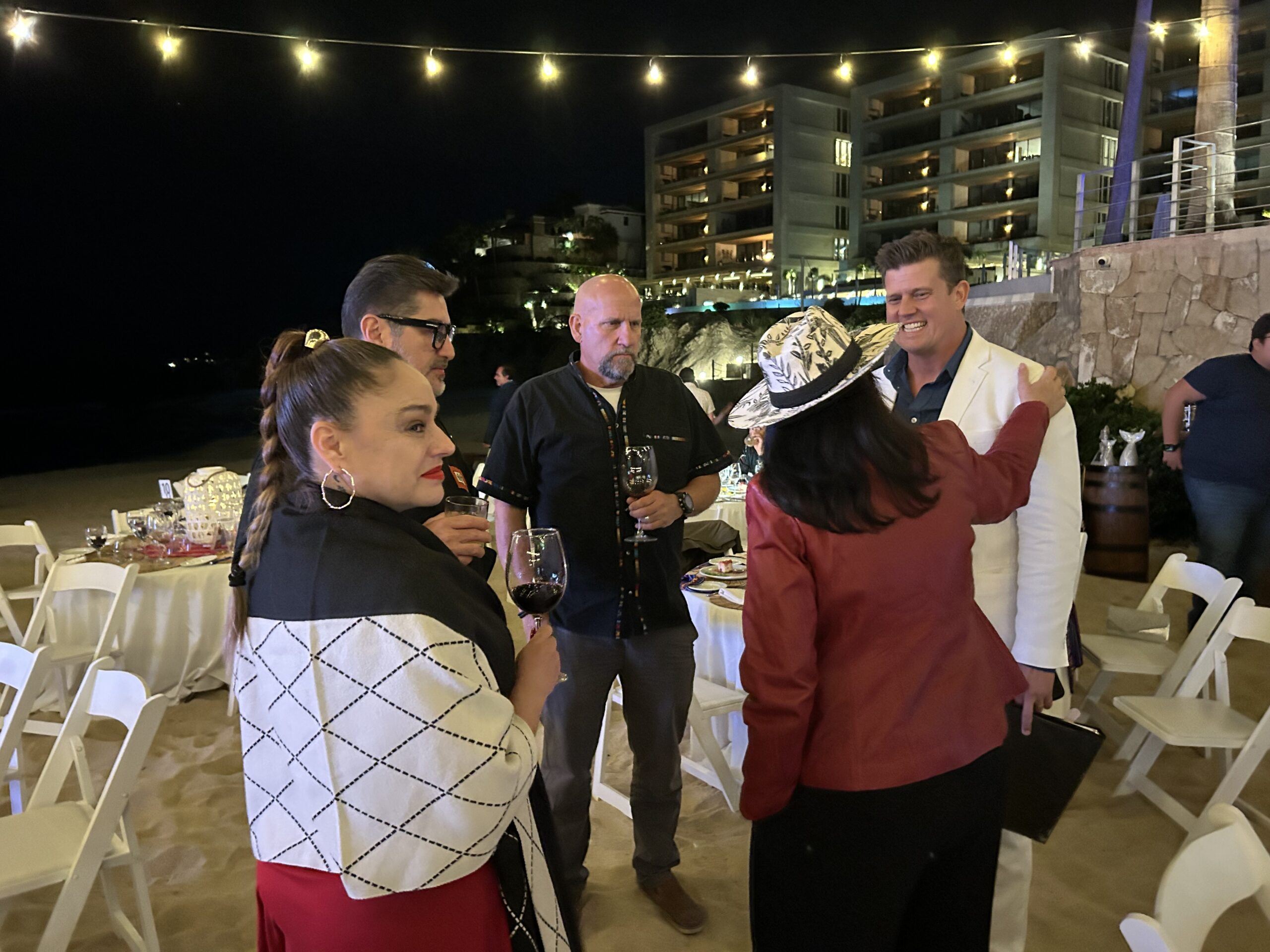 One of the ways that they support their programs is through an annual fundraiser featuring a silent auction, live entertainment and a live auction. This year (2026), it was held on the beach in front of the Cabo Surf hotel and 7 Seas Restaurant. We arrived and received our paddle for the live auction at the entrance to the hotel. Walking through the restaurant and taking the stairs down to the beach, we were welcomed and offered a cocktail. Tables were pre-assigned and we were informed that during the first hour, cocktails would be available at the bar set up by Tequila Cabo Unico and Cincos Perro Tequila. We had a very interesting fruity cocktail. Soon, servers started to walk through the attendees and the tables and offer a number of different small appetizers on trays – buschetta, mini-fish tacos, tuna crackers. Down the center of the area, a series of tables were set up for the silent auction that had about a dozen interesting items and experiences donated by supporters of the Boys & Girls Club. On each table was a card outlining the eight items that would be sold at the live auction.