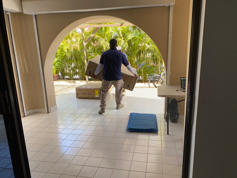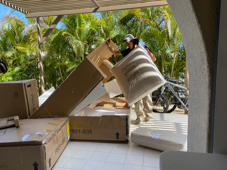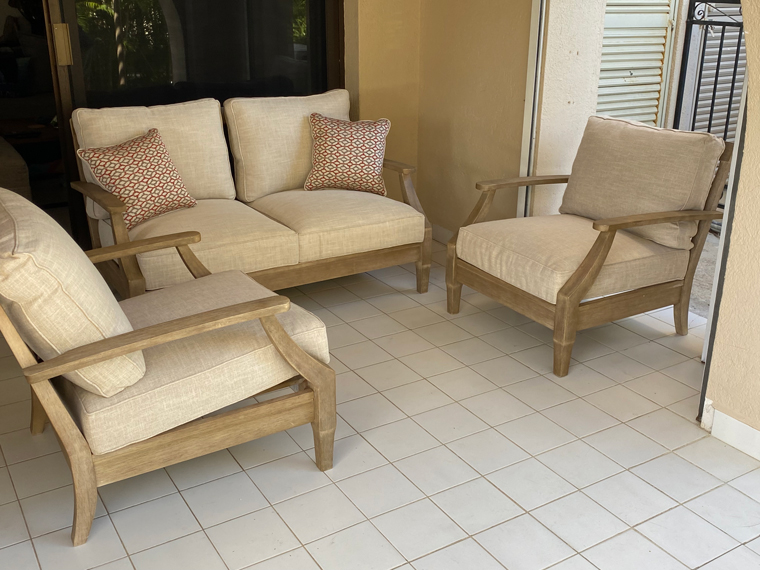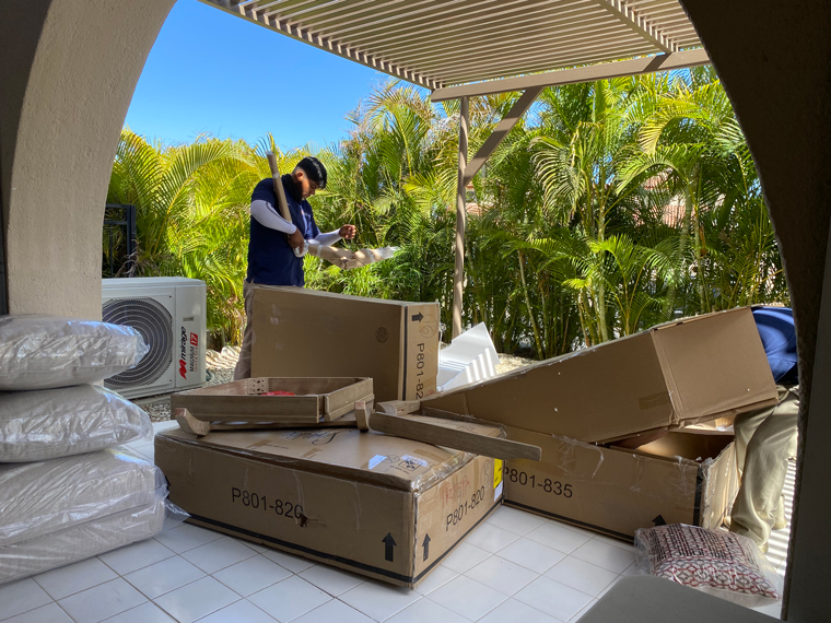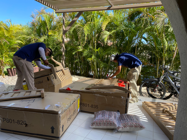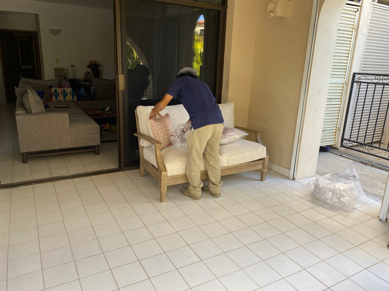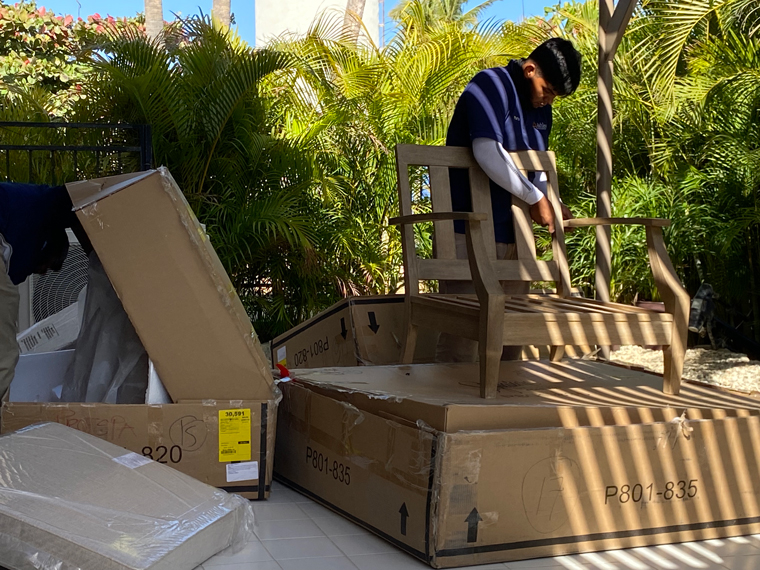 As we are temporarily in our original condo, El Conquistador near Plaza Pescador until our townhouse is finished being built, we needed some outdoor furniture quickly. We were lucky that Ashley’s actually was running a 20% off sale on outdoor furniture (Ends April 15, 2022). We ordered an outdoor furniture set – loveseat and two chairs (the coffee table was not in stock) on Saturday, February 26th. On Friday, March 18, Franck sent me a WhatsApp saying the furniture was in and ready for delivery. We set up the delivery for Monday, March 21st in the afternoon. The timing was achieved!