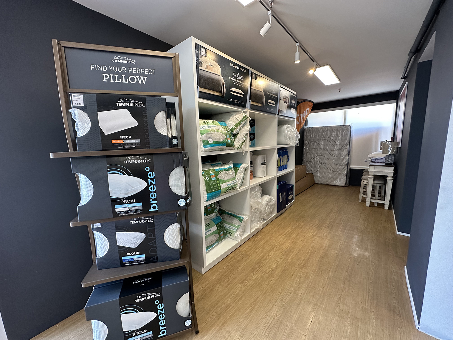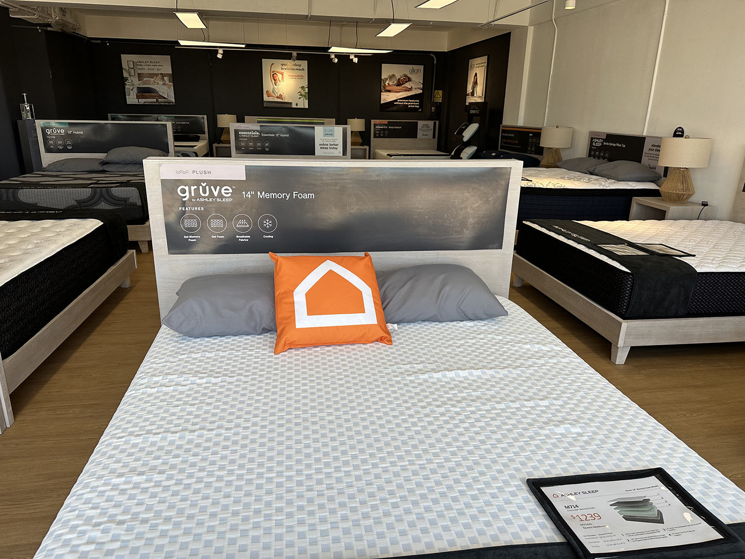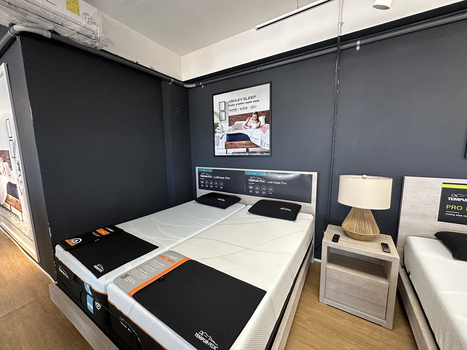 The selection was quite amazing in terms of both size, thickness and type of type of mattress. Ashley had everything from 6″ to 12″ mattresses good in single, double, queen, king and California king sizes. The type of mattresses included memory foam, inner spring and hybrid mattresses that included springs and memory foam. Their brand selection included Chime, Gruve and Essentials by Ashley Sleep, Align to Tempur-Pedic and Stearns and Foster. With more than a dozen different beds set up on the floor, it gave us a chance to try out each one to see what made the most sense for our new condo. The even had 6″ foam mattresses appropriate for a sleeper bed to upgrade for the basic mattress included with them. There was also a good selection of Tempur-Pedic pillows from which to choose.