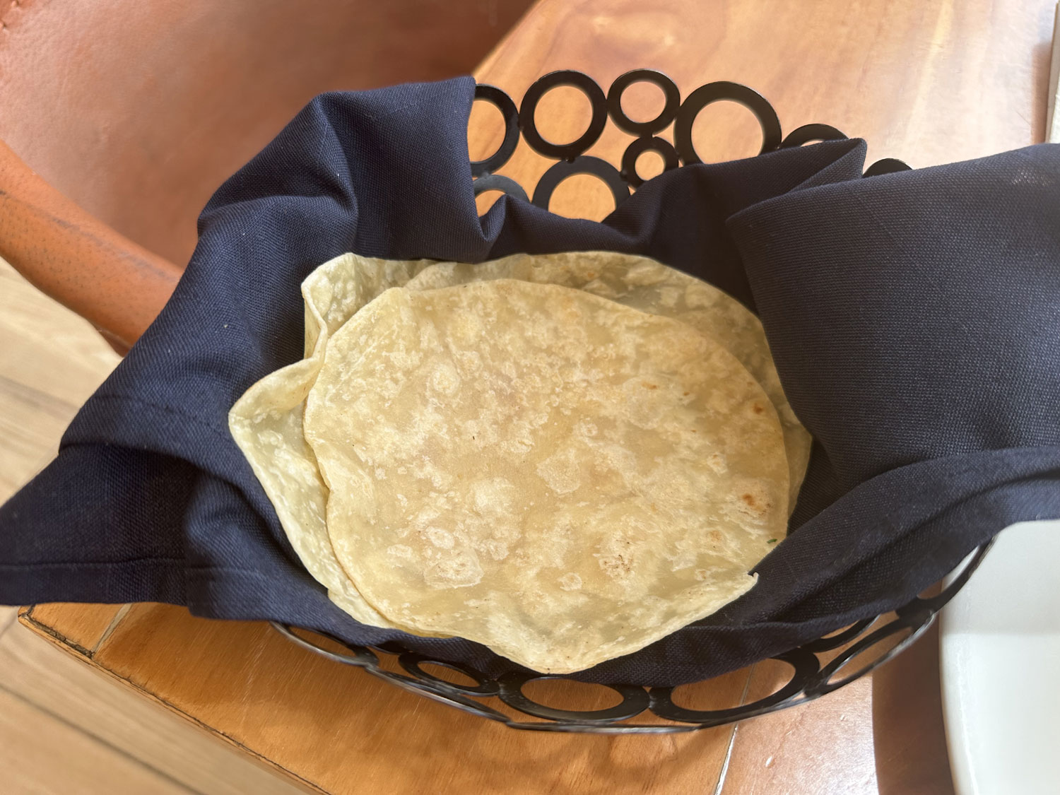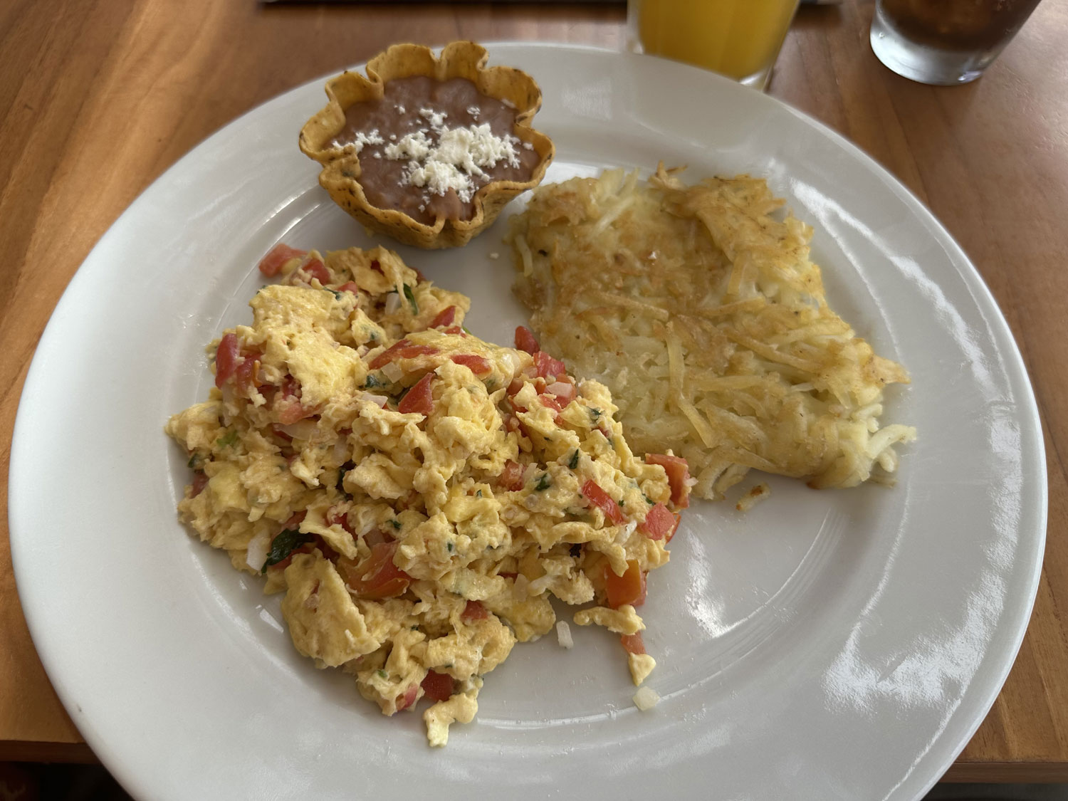 I recently stopped for breakfast. The menu offers Fit and Healthy Choices – tofu, fruit, parfait – waffles and pancakes, all types of egg dishes, Favorites – chilaquiles, Steak Benedict, French Toast, breakfast sandwich, enchiladas – and lots of Extras. I ordered my favorite, Huevos a la Mexican, a fresh squeezed orange juice, and a diet Coke. The scrambled eggs with veggies were served with hash browns, refried beans in a pasty cup, and flour tortillas.
