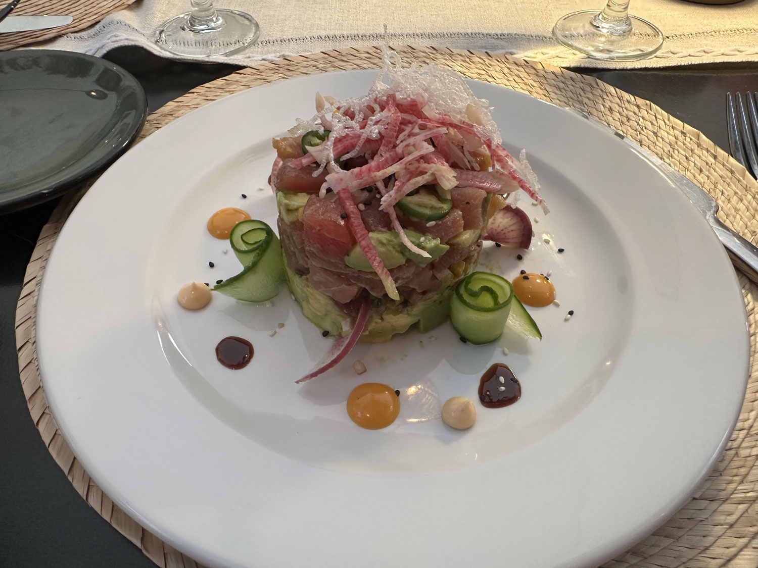 For appetizers, several people chose the Butternut Squash soup with shrimp (Chava had hers without shrimp). The soup was poured into the bowl at the table. Tracy and Leann shared a Caesar Salad. I asked for the Tuna Tartar, which was served with onions, avocado and tomato. The appetizers were delicious. After the appetizers, everyone was served an amuse – a four-cheese ravioli, which is a signature at Casa Martin.