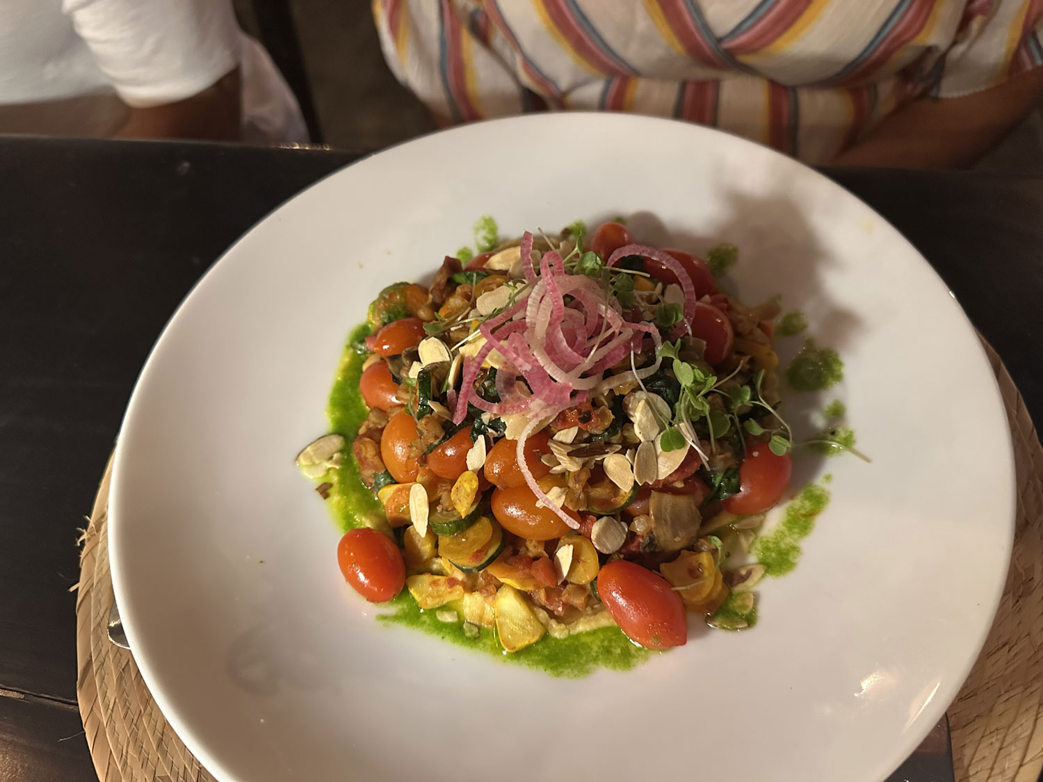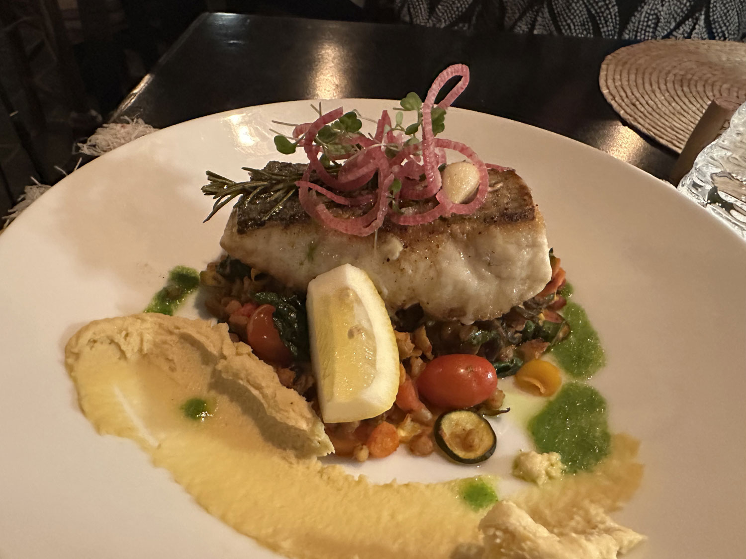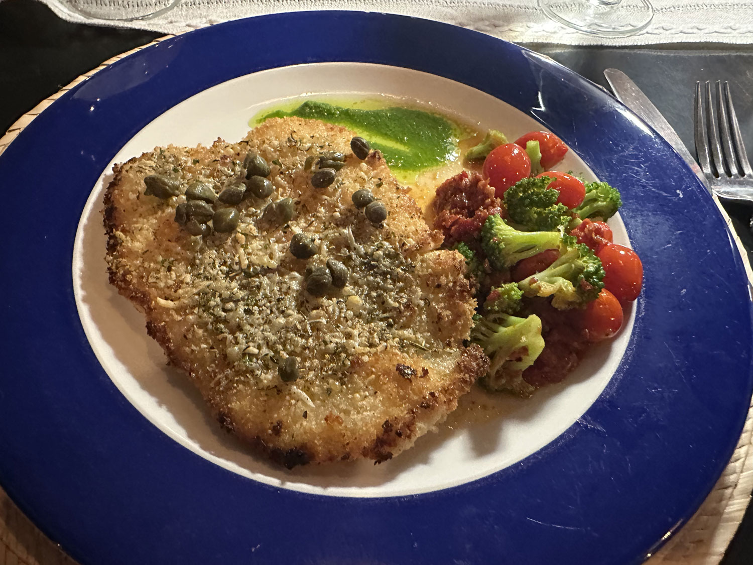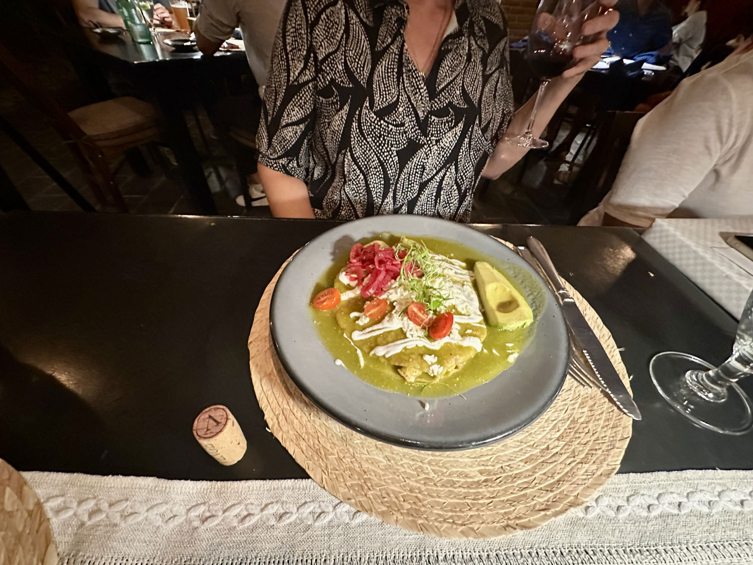 For a main course, lots of different selections from the menu were chosen. Leann chose the Totoaba served with cauliflower hummus and organic vegetables. Tracy went for the Chicken Enchiladas. Beth and I both ordered the Breaded Chicken, which comes with angel hair pasta (which I didn’t have because of my high protein diet) and broccoli and tomatoes. Chava, a vegetarian ordered the Vegan dinner, a combination of hummus, farro, organic vegetables and nuts. Bill chose the Linguine Habanero with shrimp – he loves spicy food. Tanya decided on the Cowboy, a beef tenderloin with roasted potatoes and vegetables and a chimichurri sauce. Everyone was quite for a while as they devoured their entrées. While enjoying our food we listened to the excellent vocalist sing popular songs. A few drinks were refilled. The special device for aerating and measuring the glass of wine was very interesting.