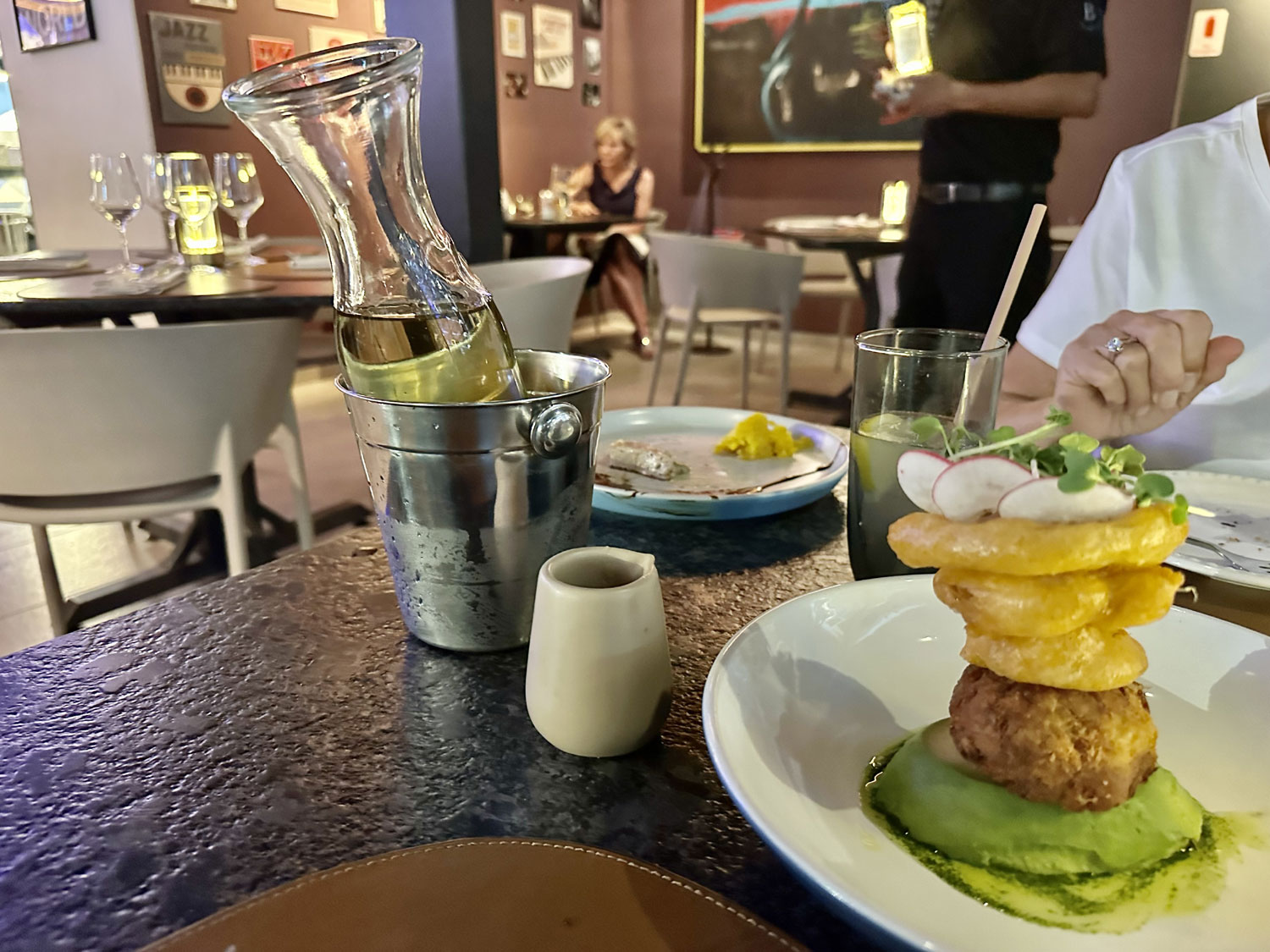 We were offered a table either outside on the plaza of Plaza del Pescador or inside in the restaurant. We chose a table for two inside. It is very nicely decorated with a long bar on the back of the restaurant, jazz posters on one wall and a very interesting large painting on the other. Our meal started with an amuse of foie gras with crushed pineapple that was absolutely amazing. For an appetizer, we shared the crab cake siting on half an avocado with onion rings and a ginger sauce. Another winner. For a main course, Beth chose the Seared Seabass Pierade style with peppers, onions and potatoes. I selected the seven-hour roasted lamb with a unique layered potato in a great sauce. Both dishes had excellent flavor and the portions were large enough that each of us took half home (we also wanted to save room for dessert). Our dessert choices allowed us to taste the warm chocolate cake with vanilla ice cream and the French Apple Tart. As Beth exclaimed, she would return to the restaurant just for the French Apple Tart and its perfect combination of cinnamon, butter and pastry, along with the vanilla ice cream.