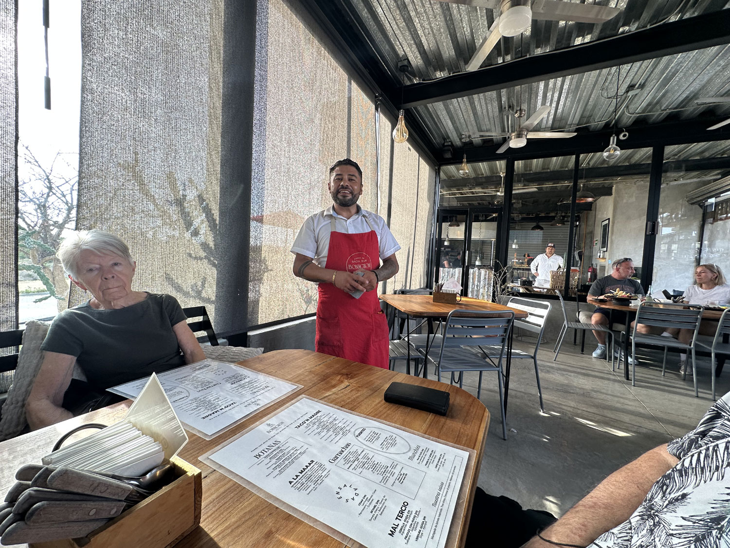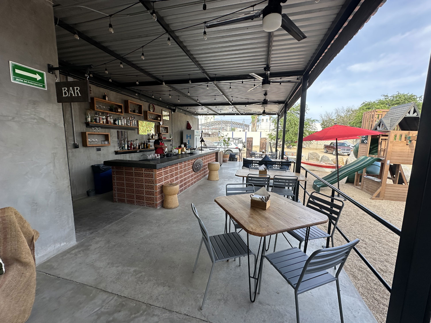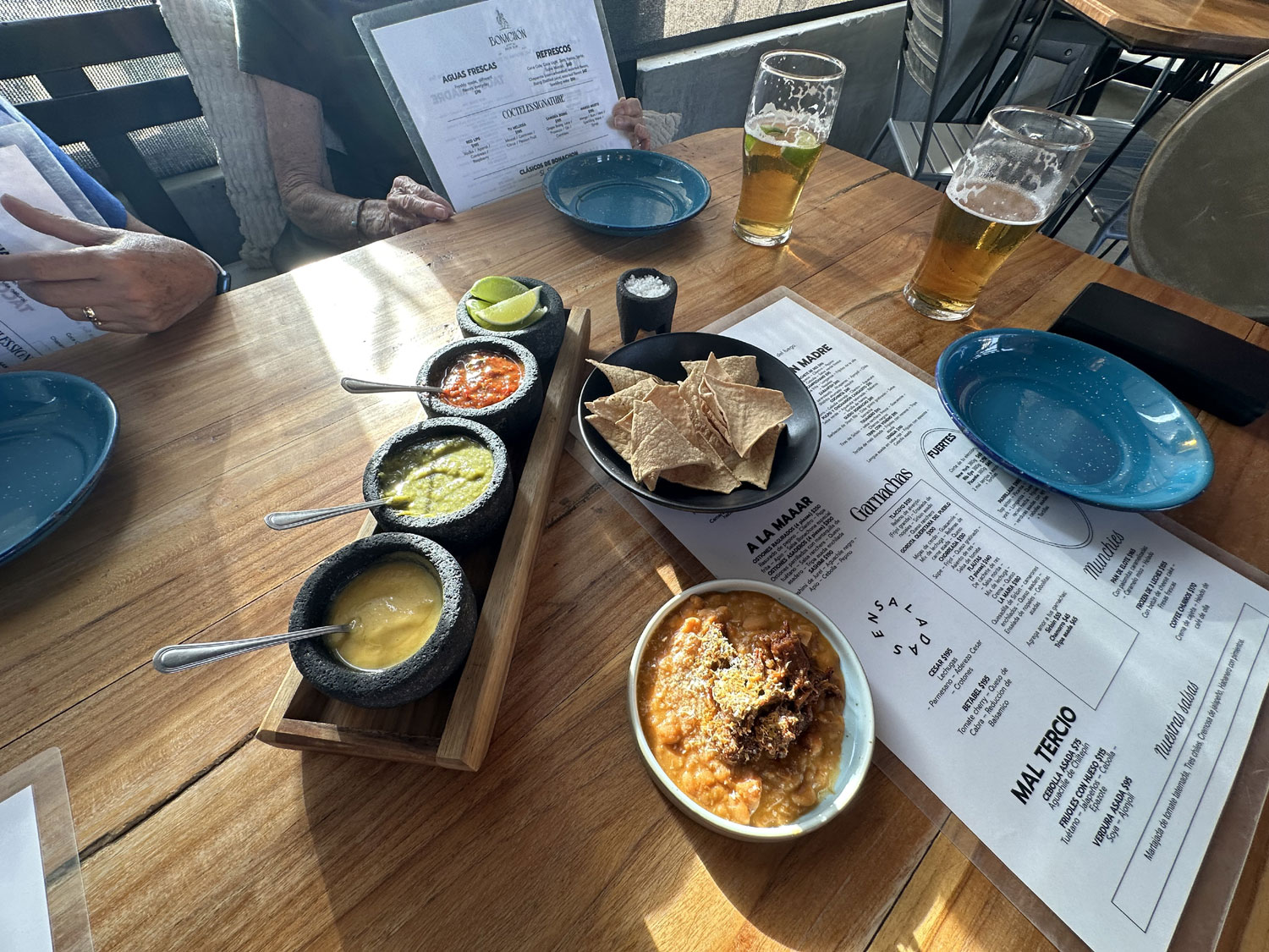 Located on the paved road to El Huerto Farm-to-Table off the frontage road from Costco is an interesting restaurant named Bonachon Asado de Baja Sur. The restaurant has parking in the back and both indoor and outdoor dining areas. The outdoor dining areas are both a patio at the front and in the bar area at the back. There is also a children’s playground set up in the back. I was greeted at the front door and led to an inside table where our friends Bill and Dianne were already seated.