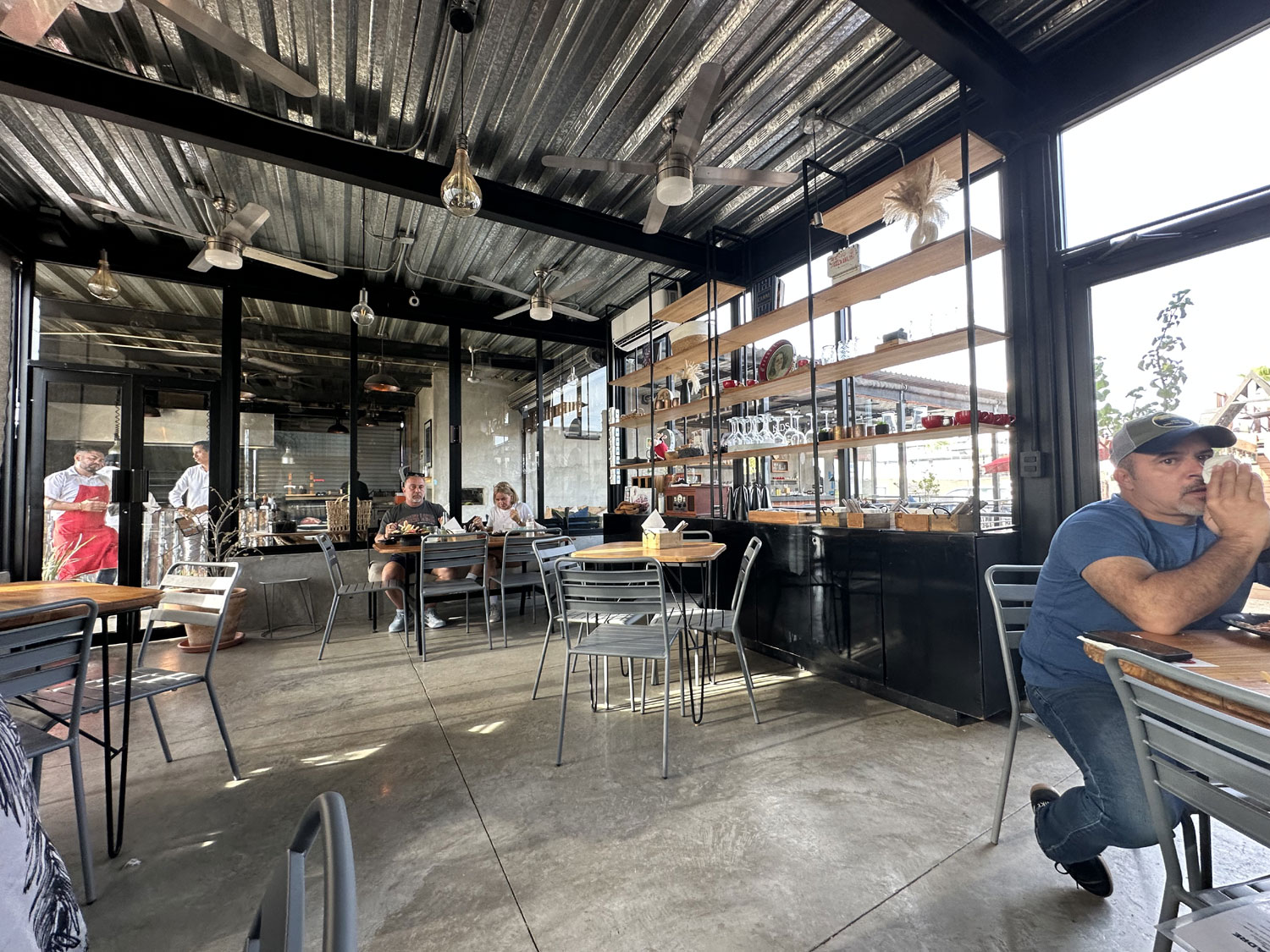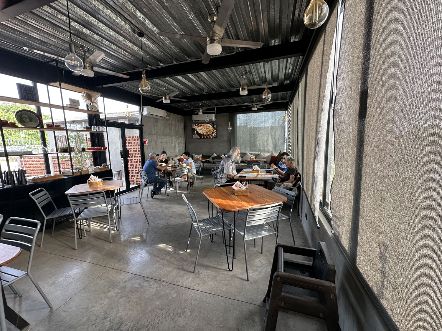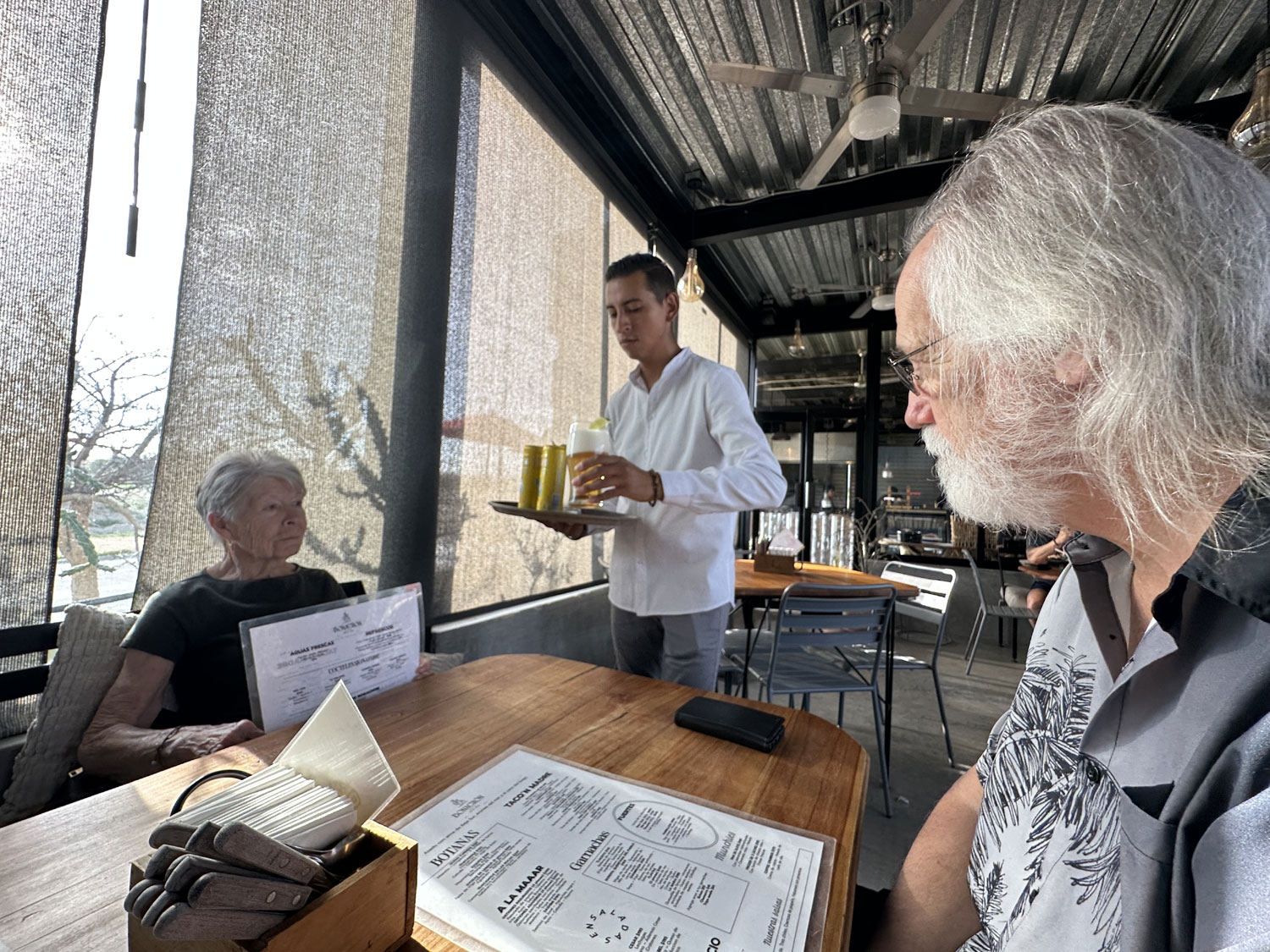 Located on the paved road to El Huerto Farm-to-Table off the frontage road from Costco is an interesting restaurant named Bonachon Asado de Baja Sur. The restaurant has parking in the back and both indoor and outdoor dining areas. The outdoor dining areas are both a patio at the front and in the bar area at the back. There is also a children’s playground set up in the back. I was greeted at the front door and led to an inside table where our friends Bill and Dianne were already seated.