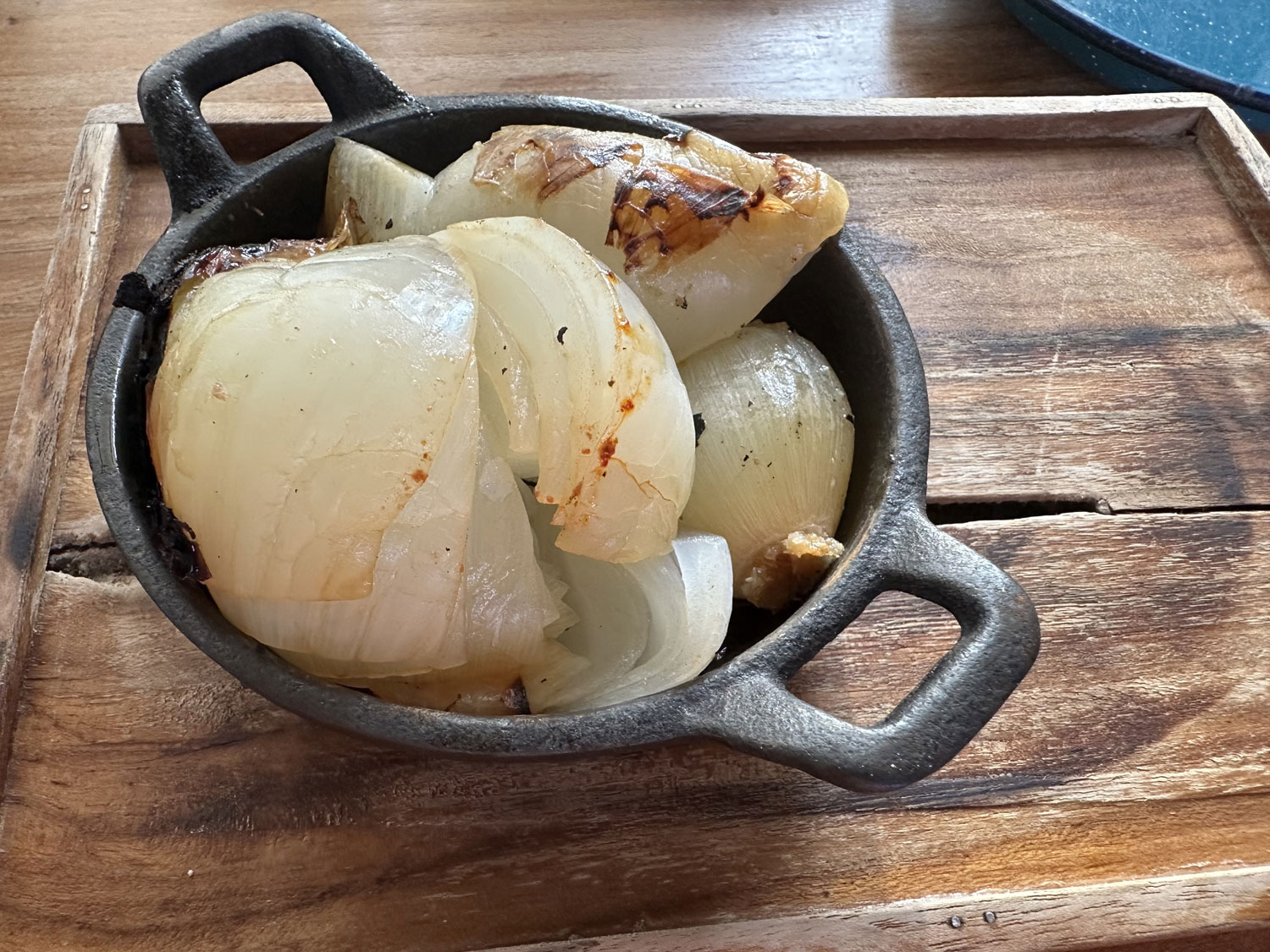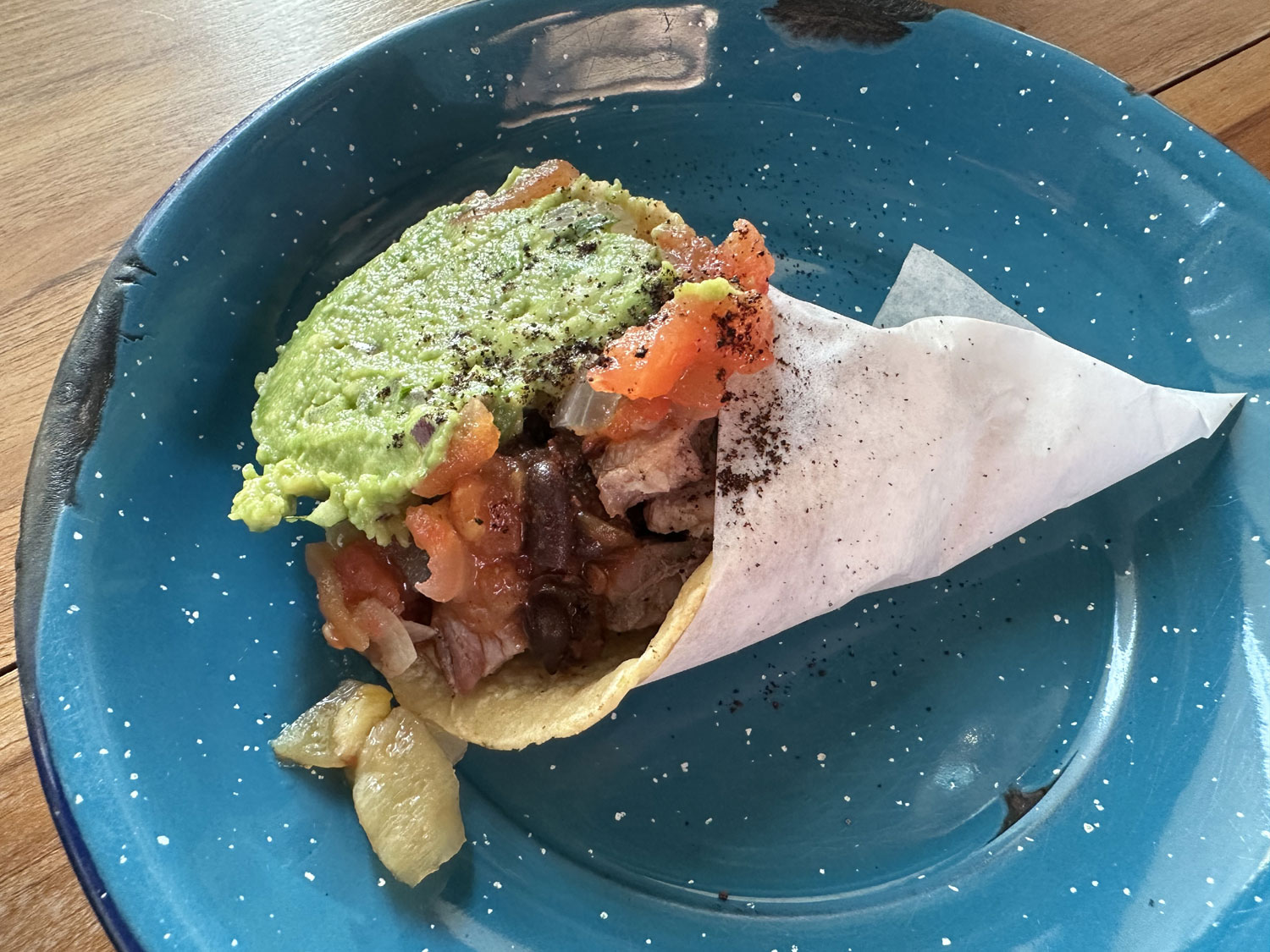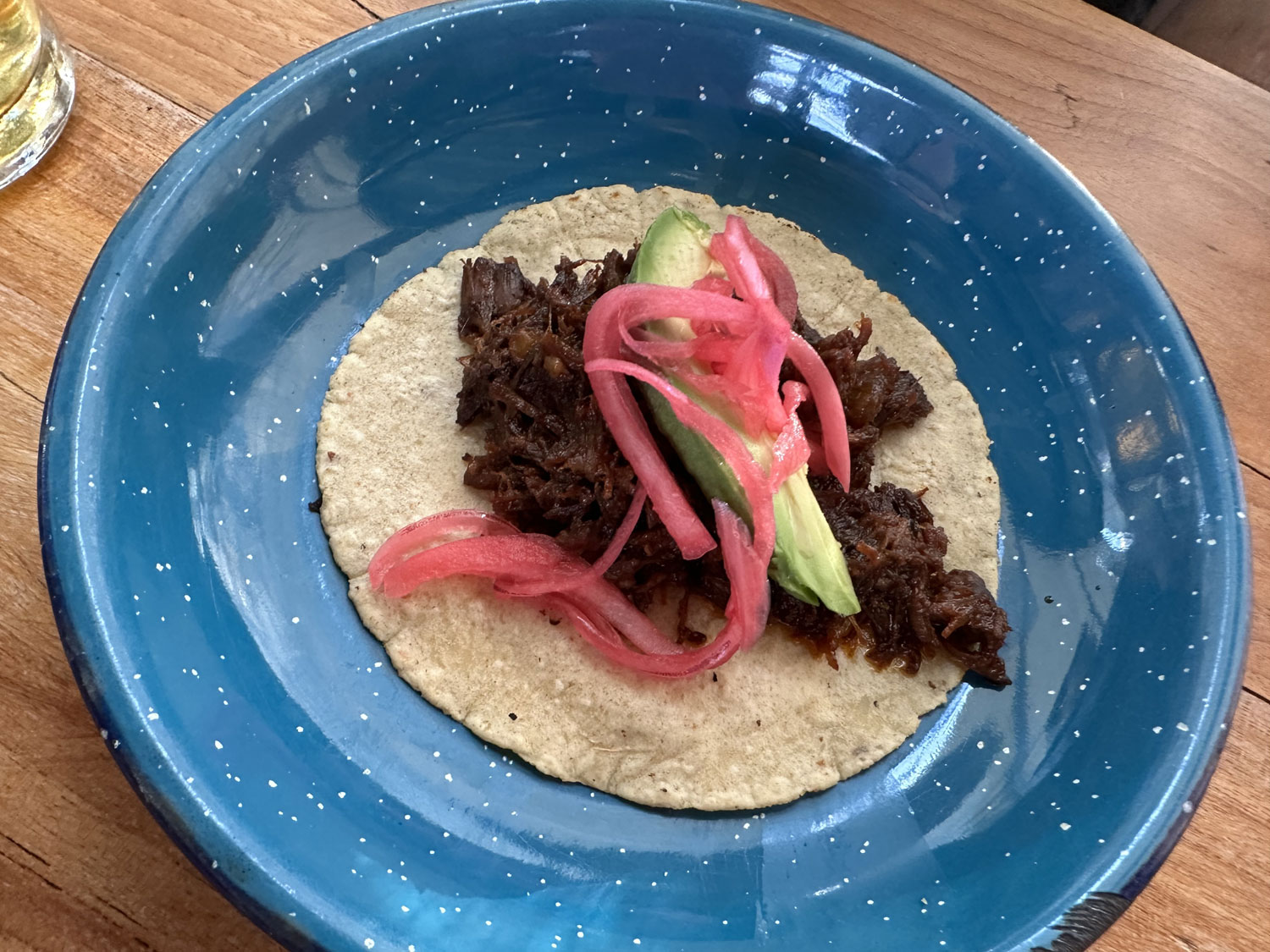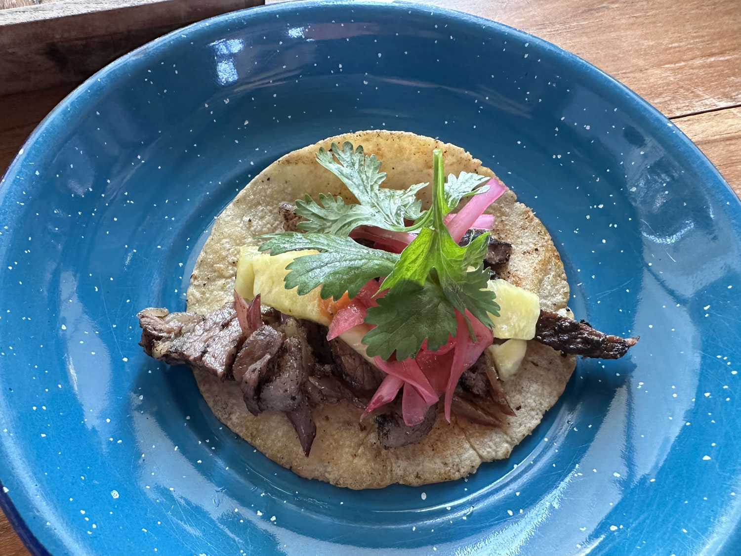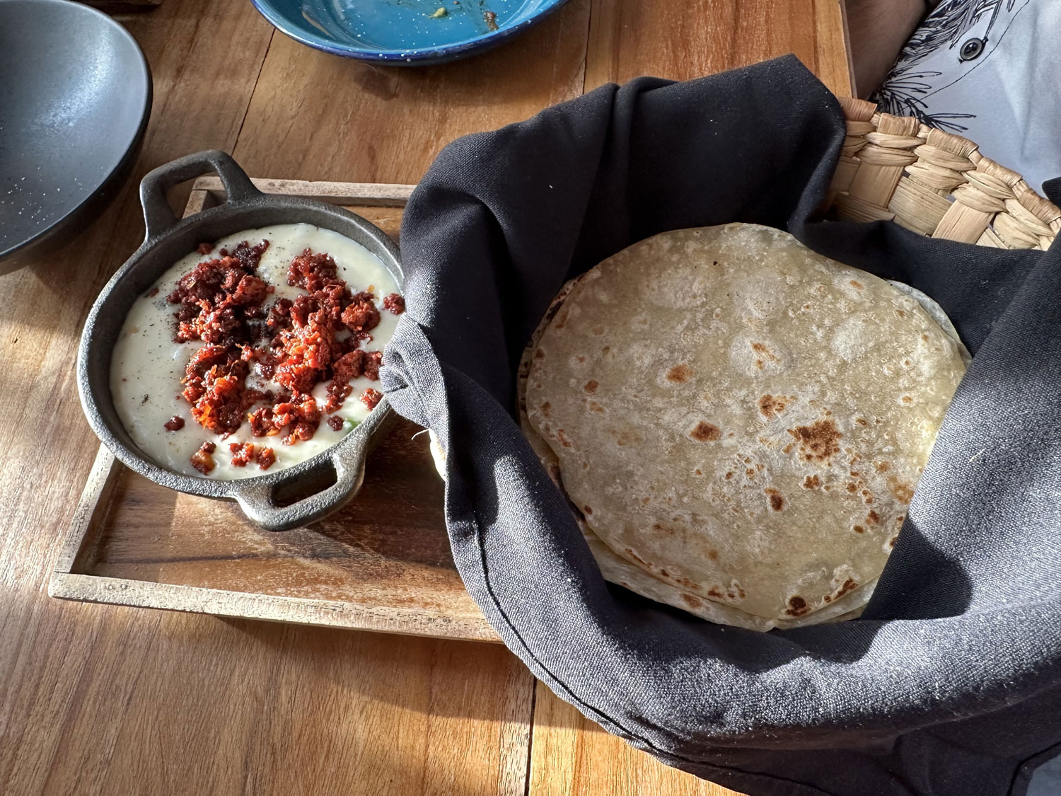 Our server handed out the menu that had food on one side and drinks on the other. The menu is a very interesting and eclectic selection of the dishes. Botanas (appetizers included melted cheese, guacamole, gyozas stuffed with beef tongue and shrimp in dark beer and serrano pepper ponzu. There is also fresh oysters or sashimi to start as well as salads – Caesar and Betabel. For a main course, you can choose from tacos of all kinds o grilled steaks. There were also Garnachas – flautas, quesadillas, and other stuffed tortilla choices. Sides included grilled onion, beans, and grilled veggies. The server also let us know that they had a special for the table to share of six small al pastor tacos with guacamole all on a large tray.