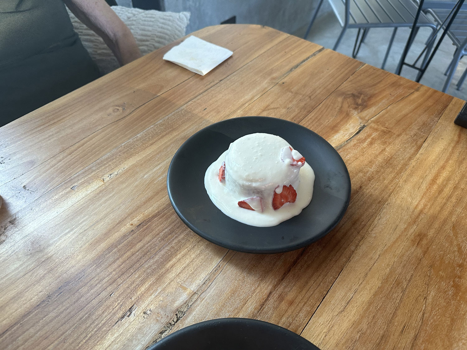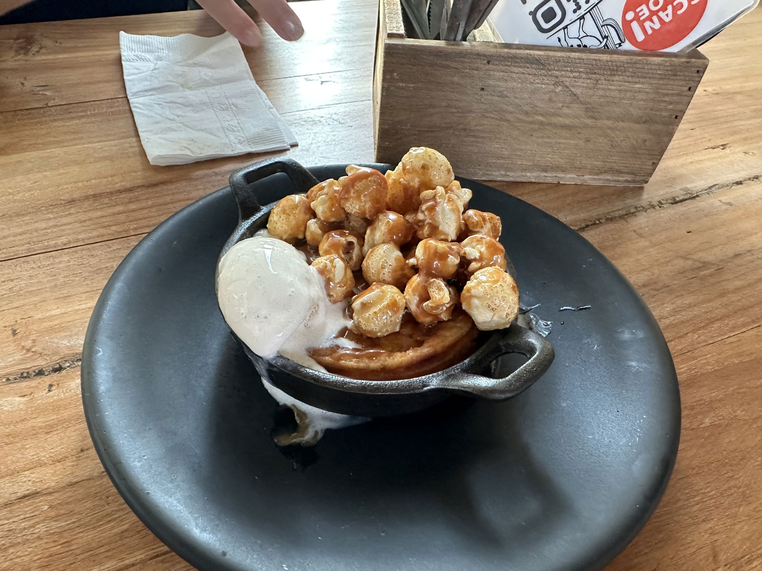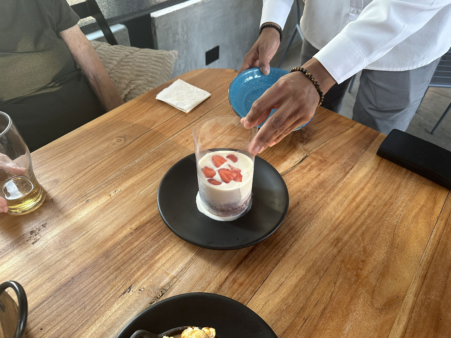 Bill and Dianne decided to have dessert. Dianne chose the carrot cake with popcorn cornbread and ice cream and Bill asked for the Tres Leche, which was served in a cylinder, which when removed the sauce flowed over the cake.