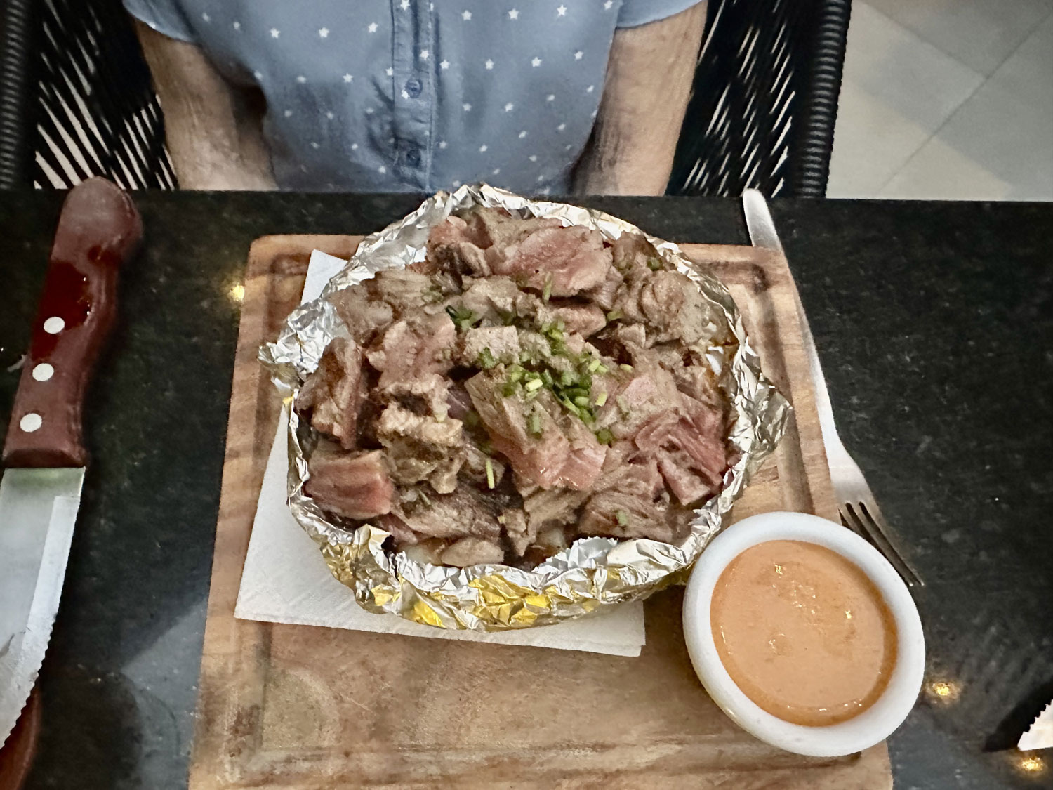 Pepe, our server brought a small block with a QR code to scan to access the menu for the restaurant. Online, the menu was about 12 screens, not counting the drink menus. The menu offered a number of different empanadas, salads, appetizers like melted cheese and stuffed mushrooms, skewers, steaks and sausages, pizza and pasta, as well as stuffed baked potatoes, salmon and chicken dishes. Pepe brought us a basket of fresh bread with a chimichurri sauce and a chili sauce to add to the bread. We started with appetizers. Beth and Dianne each ordered an empanada (arrachera and mushroom, respectively) and Bill chose the melted cheese with chorizo that was served with fresh bread. The empanadas were large and the ladies loved them. Bill devoured the melted cheese and sausage.