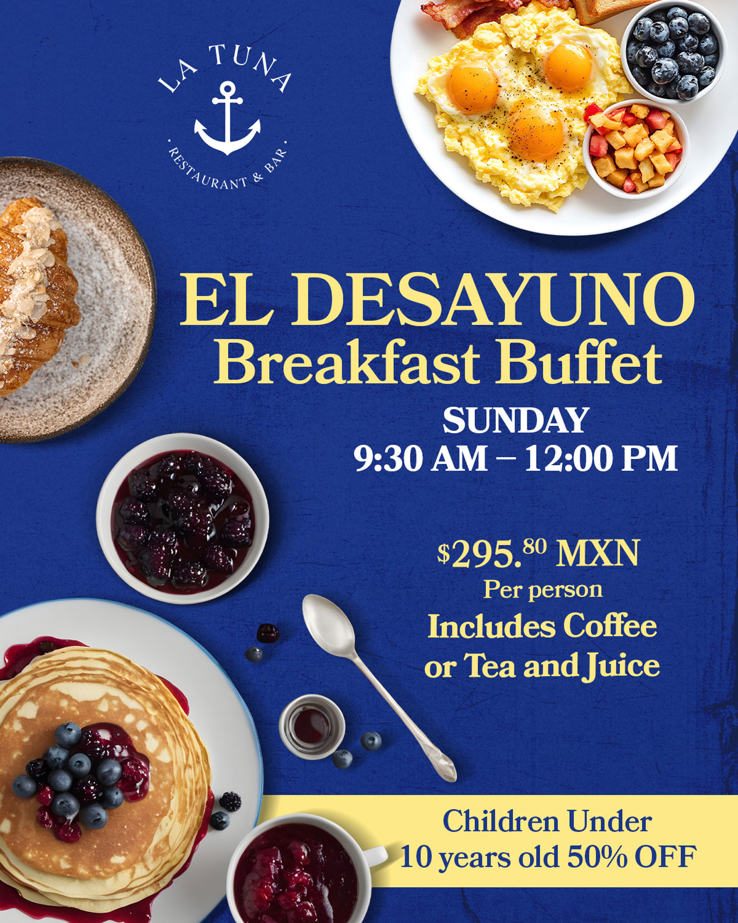 Join us for the breakfast buffet each Sunday from 9:30 am to 12:00 pm. While you share breakfast with your family, your children can enjoy the kid’s room with games, toys and children’s movies. And, live music from Juan Jose Herrera Torres will make your experience even more enjoyable.