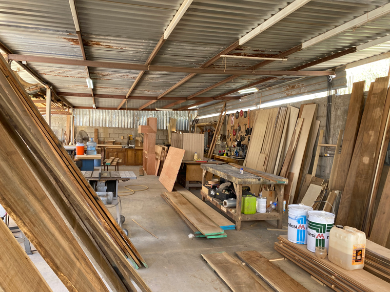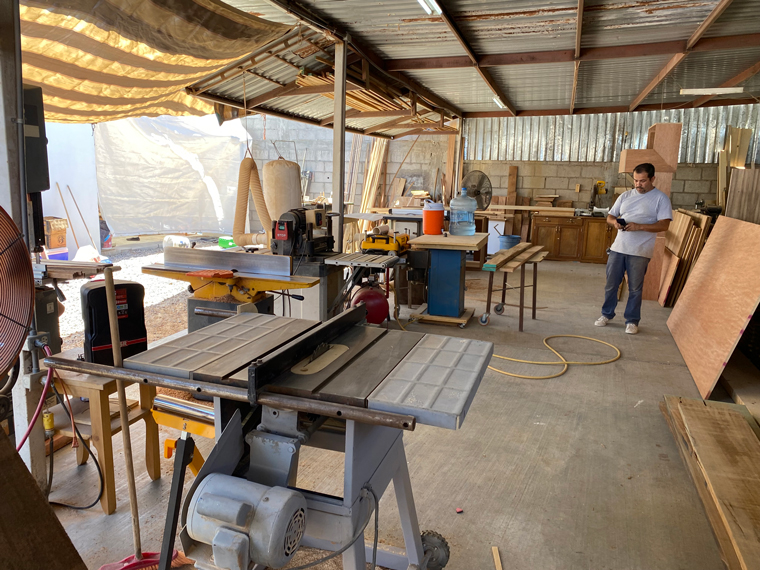 Furnishing our new townhouse in Pueblo Campestre Phase 2, we learned that we couldn’t find everything we wanted at furniture stores. This was especially true when talking about items like an entertainment center wall unit or a small island for the kitchen. With a recommendation from someone in Todos Santos, we explored the Facebook page of Carmat Carpinteria, based in La Paz. The range of work in parota was quite incredible. However, because the carpenter was from La Paz, we were nervous and decided to visit his shop in La Paz. We knew that many custom builders worked out of a small garage or open area. We met Carlos Ochoa at his shop, which turned out to be very large with staff working and quite a few very large projects underway.