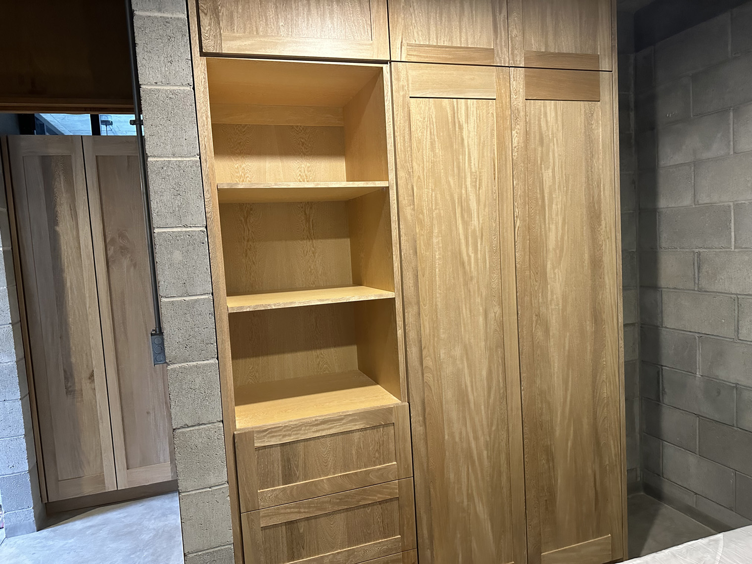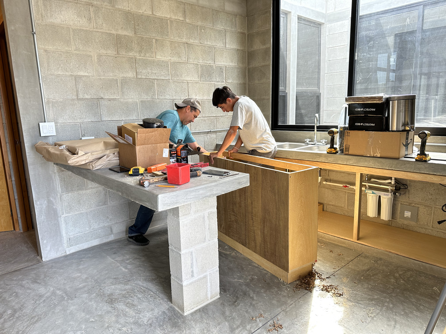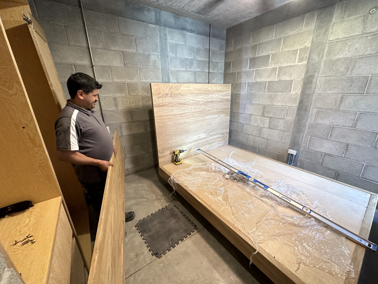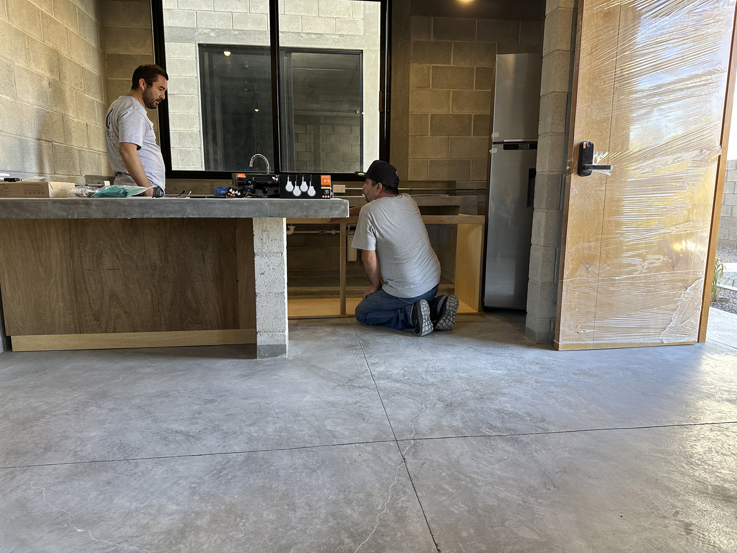 Carmat Carpinteria has a large shop in La Paz. The first step was to build the cabinets, doors and furniture in their shop. When they were ready to install (about three weeks later), the first day was dedicated to placing the inserts under the kitchen counter, the peninsula, the linen closet, and the bedroom. These inserts had to be slightly adjusted in each unit because the concrete countertops and not perfectly level on the underside. Once they were in the Carmat Carpinteria team also carefully put clear caulking between the cabinets and the concrete where necessary. The second day of the installation focused on placing the door on the cabinets and the shelves and clothes bars in the closets as well as the drawer fronts on the drawers in the both the kitchen and the bathroom. The third day of the installed included placing the queen-size beds and headboards in each of the units, adding the desk into the bedroom closet and placing the shelves in the bedroom, kitchen and living room.