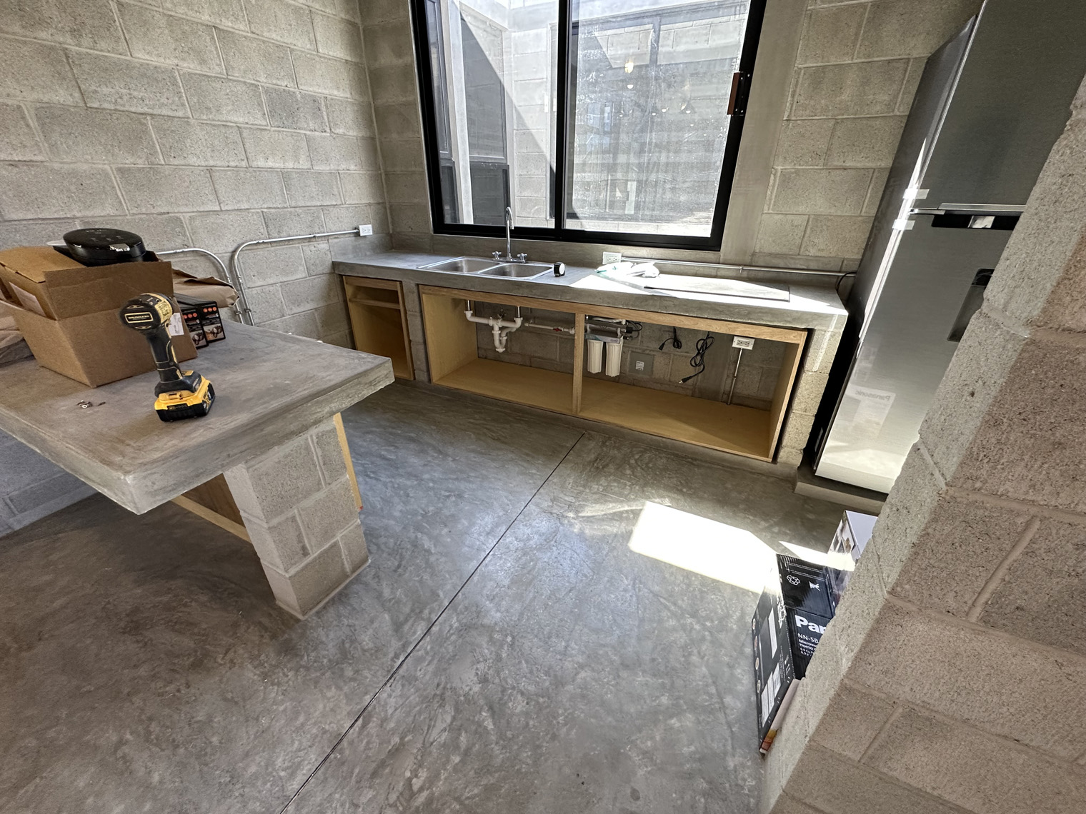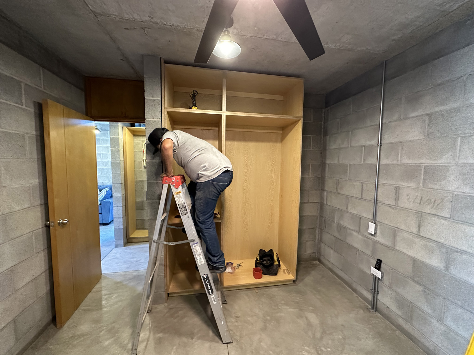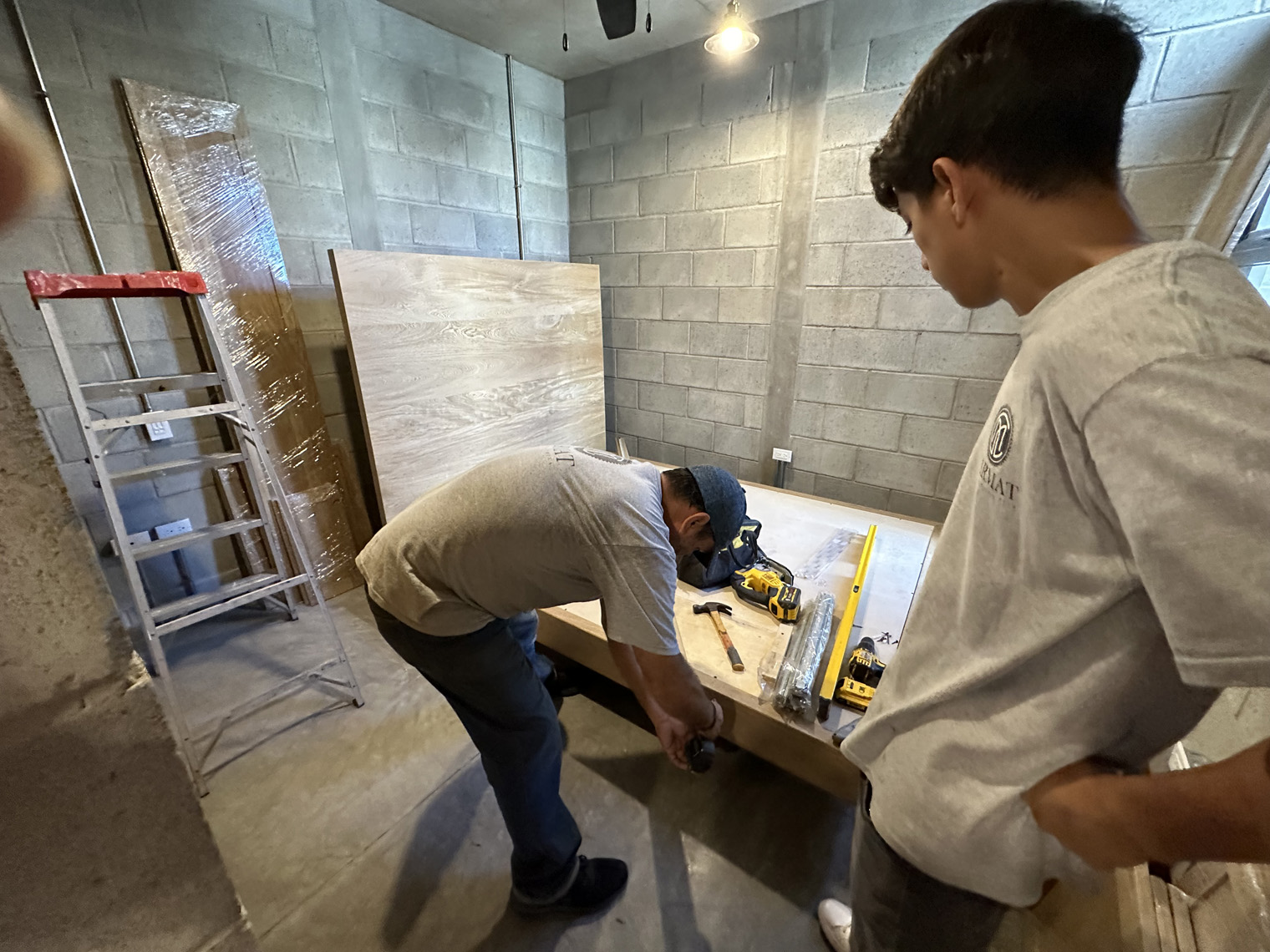 Carmat Carpinteria has a large shop in La Paz. The first step was to build the cabinets, doors and furniture in their shop. When they were ready to install (about three weeks later), the first day was dedicated to placing the inserts under the kitchen counter, the peninsula, the linen closet, and the bedroom. These inserts had to be slightly adjusted in each unit because the concrete countertops and not perfectly level on the underside. Once they were in the Carmat Carpinteria team also carefully put clear caulking between the cabinets and the concrete where necessary. The second day of the installation focused on placing the door on the cabinets and the shelves and clothes bars in the closets as well as the drawer fronts on the drawers in the both the kitchen and the bathroom. The third day of the installed included placing the queen-size beds and headboards in each of the units, adding the desk into the bedroom closet and placing the shelves in the bedroom, kitchen and living room.