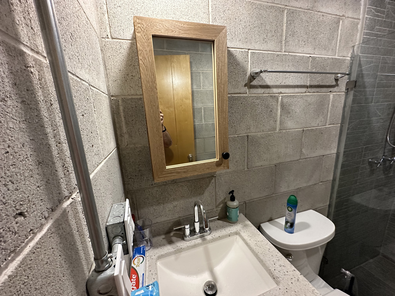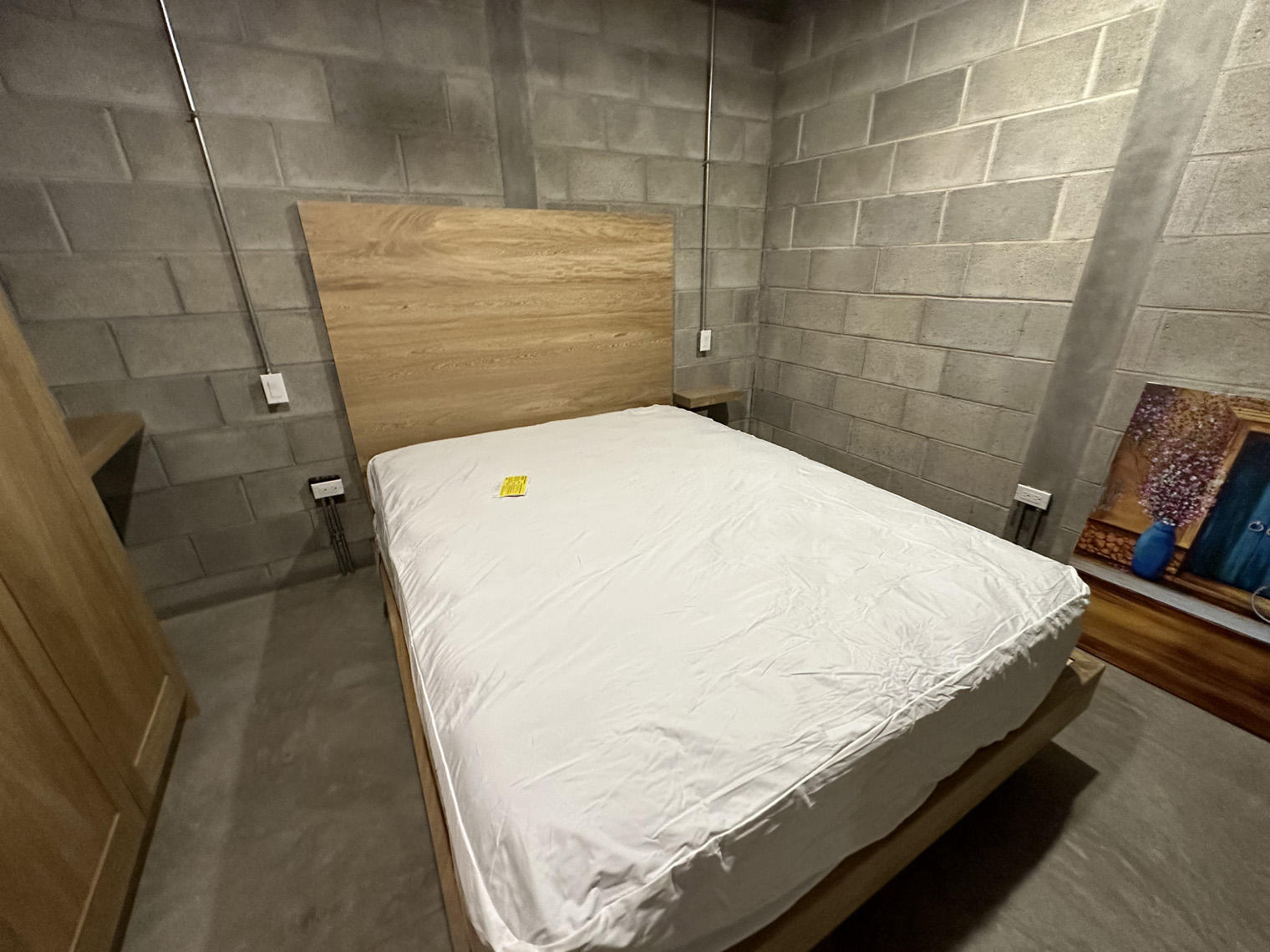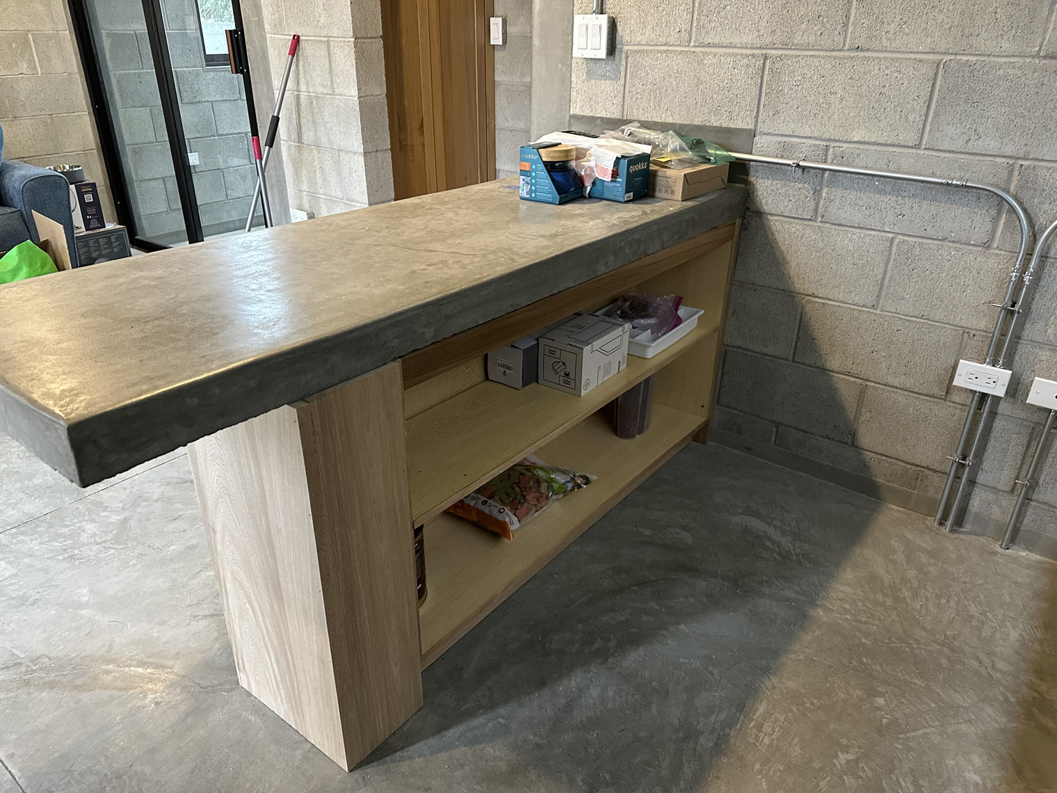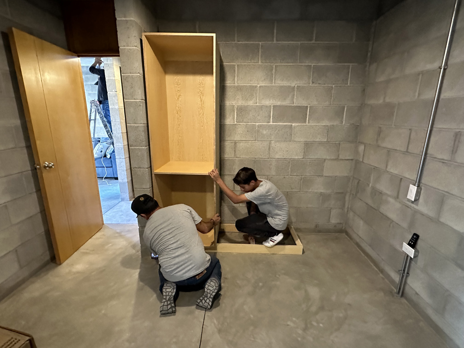 Carmat Carpinteria has a large shop in La Paz. The first step was to build the cabinets, doors and furniture in their shop. When they were ready to install (about three weeks later), the first day was dedicated to placing the inserts under the kitchen counter, the peninsula, the linen closet, and the bedroom. These inserts had to be slightly adjusted in each unit because the concrete countertops and not perfectly level on the underside. Once they were in the Carmat Carpinteria team also carefully put clear caulking between the cabinets and the concrete where necessary. The second day of the installation focused on placing the door on the cabinets and the shelves and clothes bars in the closets as well as the drawer fronts on the drawers in the both the kitchen and the bathroom. The third day of the installed included placing the queen-size beds and headboards in each of the units, adding the desk into the bedroom closet and placing the shelves in the bedroom, kitchen and living room.