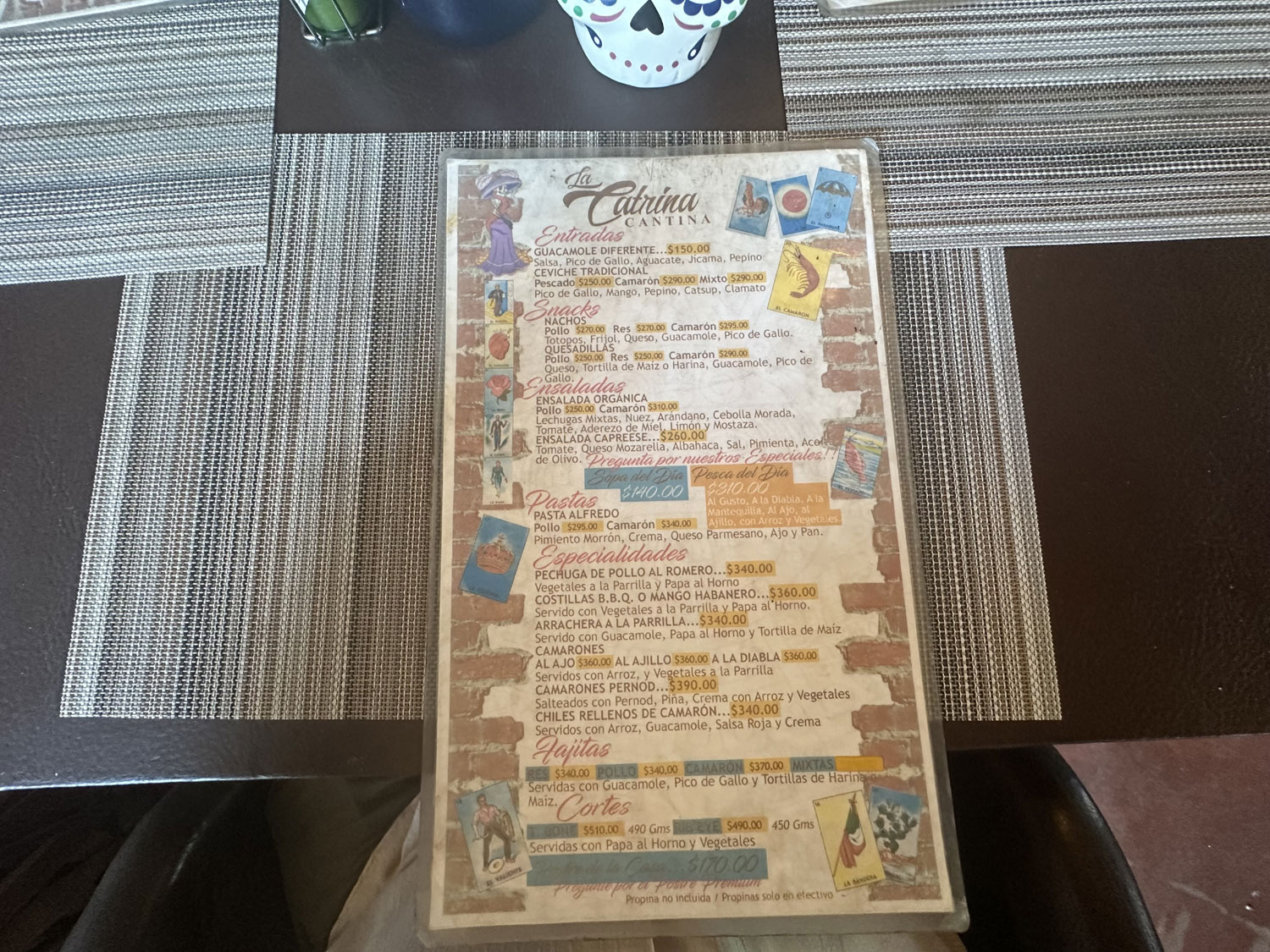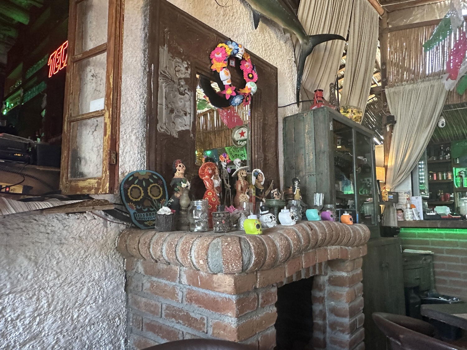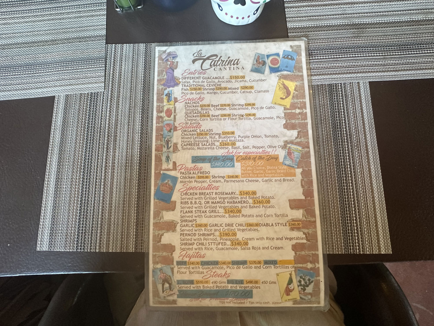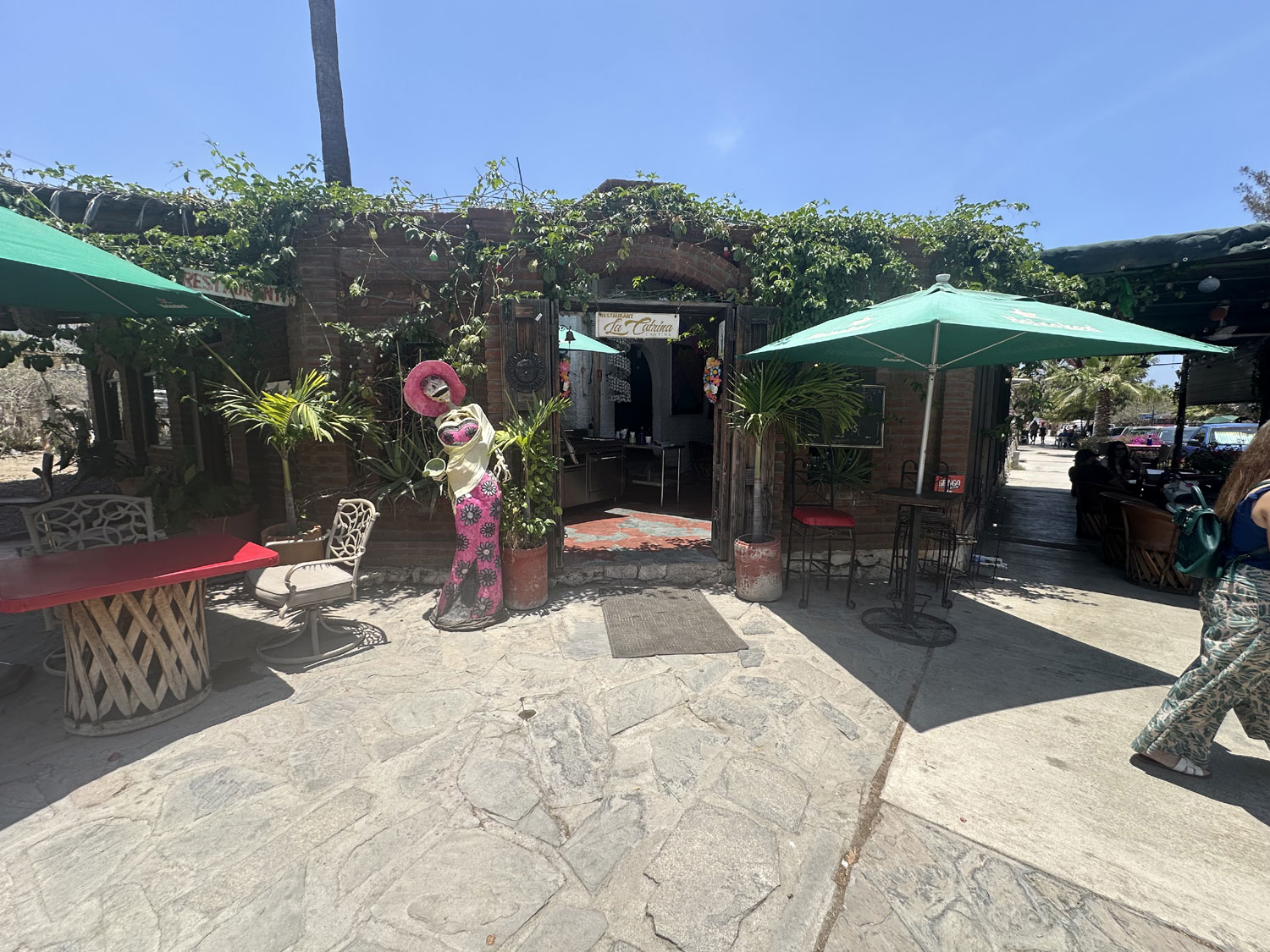 Located on Colegio Militar across from the park and Pizzeria Romantica in Todos Santos is The Catrina Cantina. This small Mexican restaurant has seating both inside and outside. There is a side room in what appears to be the original space that includes a couch and table and a bar. The inside is decorated with colorful banners, Mexican artwork, and small Day of the Dead sculptures. There are a number of small TVs to show sports. The menu has appetizers, snacks, salads, fajitas, steaks, pasta and specialties – shrimp, ribs, chicken.