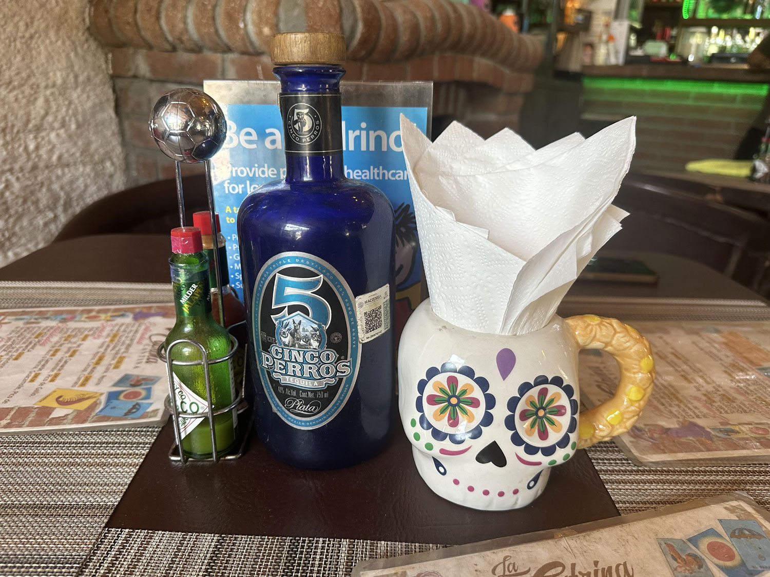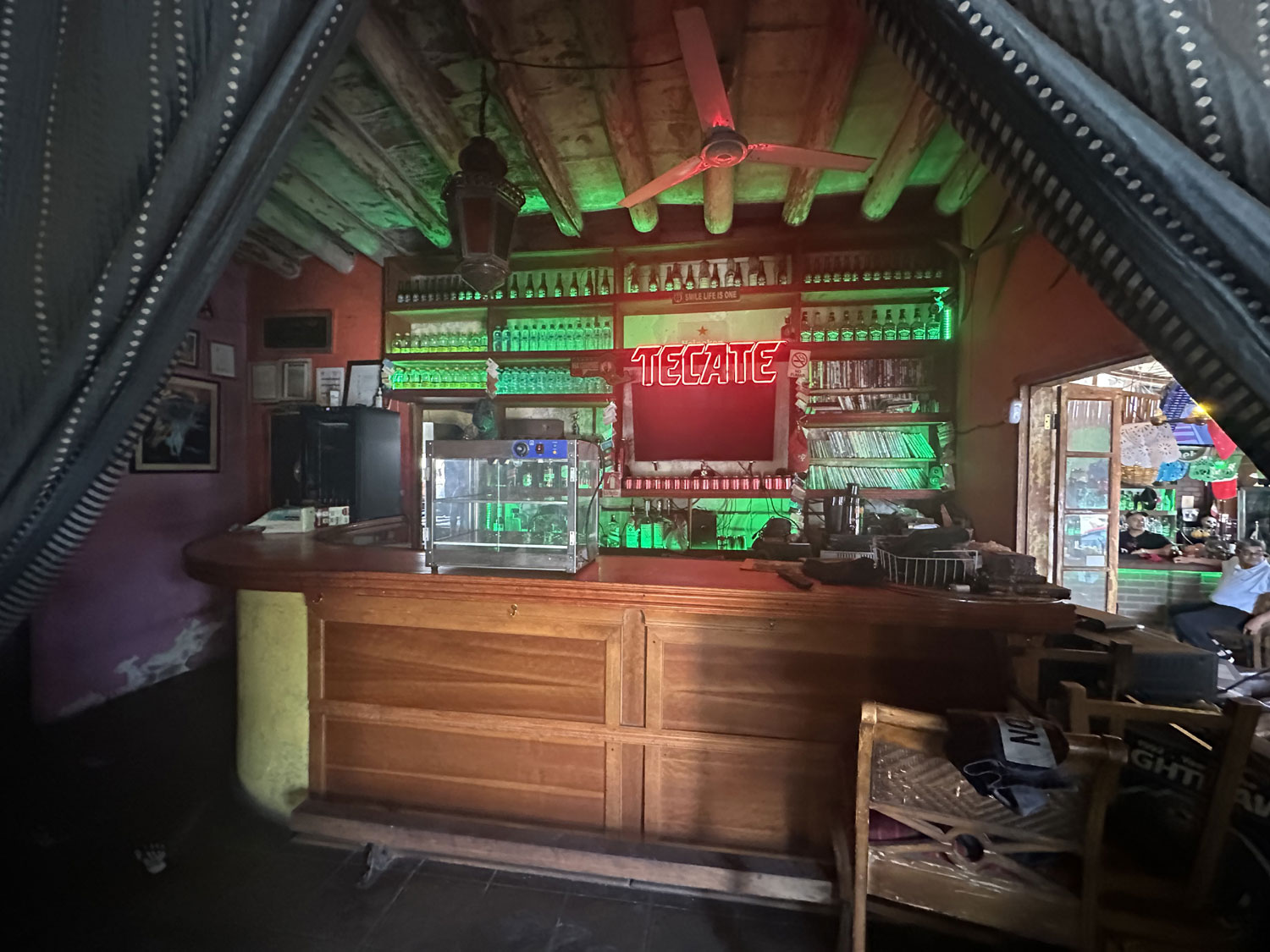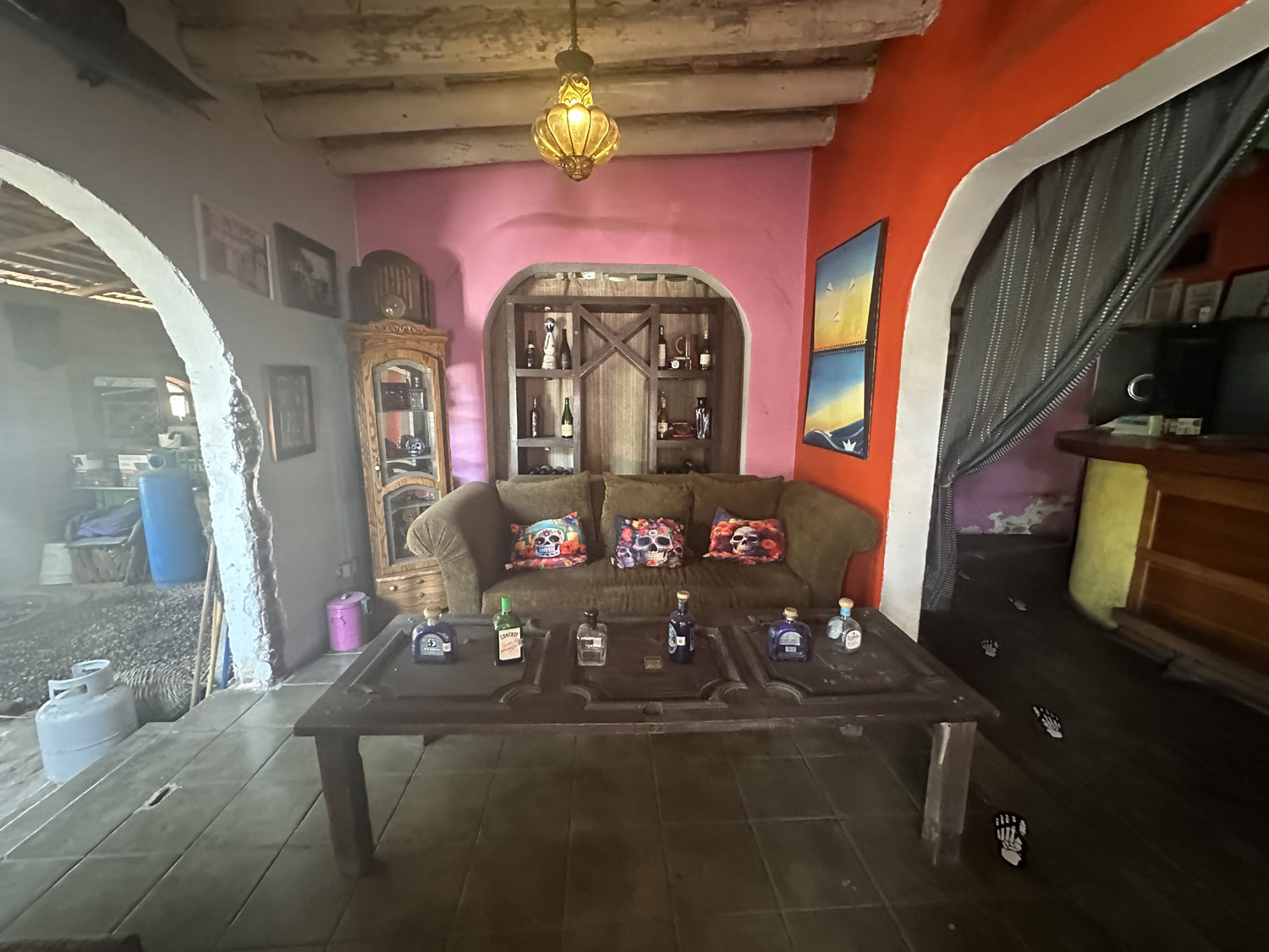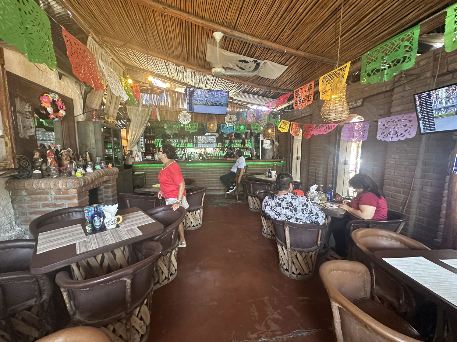 Located on Colegio Militar across from the park and Pizzeria Romantica in Todos Santos is The Catrina Cantina. This small Mexican restaurant has seating both inside and outside. There is a side room in what appears to be the original space that includes a couch and table and a bar. The inside is decorated with colorful banners, Mexican artwork, and small Day of the Dead sculptures. There are a number of small TVs to show sports. The menu has appetizers, snacks, salads, fajitas, steaks, pasta and specialties – shrimp, ribs, chicken.