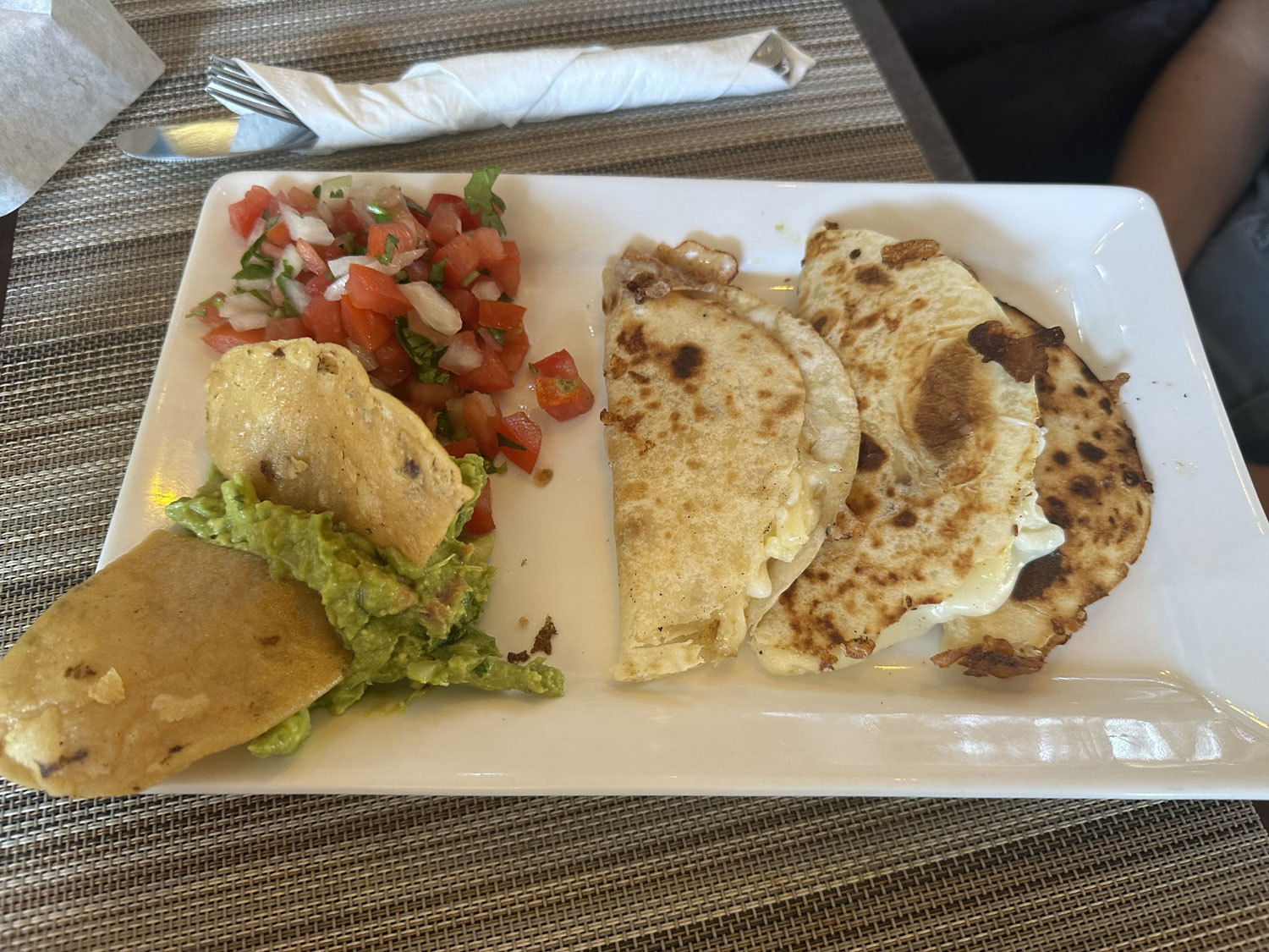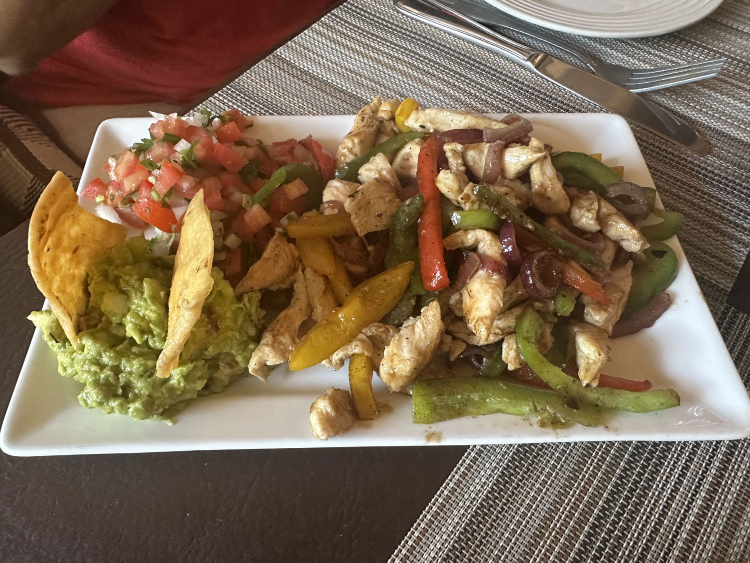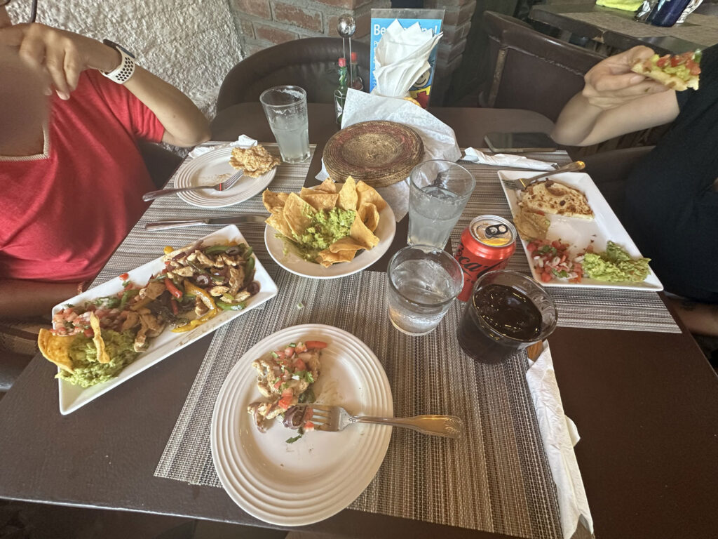 We decided to start our meal with guacamole and chips. The guacamole had tomato and onion mixed in and was very good. For our main lunch items, our daughter Chava ordered vegetarian Quesadillas that were severed with guacamole and Pico de Gallo. Beth and I shared chicken fajitas. The platter of fajitas with both corn and flour tortillas was piled high with chicken and lots of vegetables – green and red peppers, onions, and also came with guacamole and Pico de Gallo. The flavor of the chicken and vegetables was one of the best that I have ever had in Los Cabos.