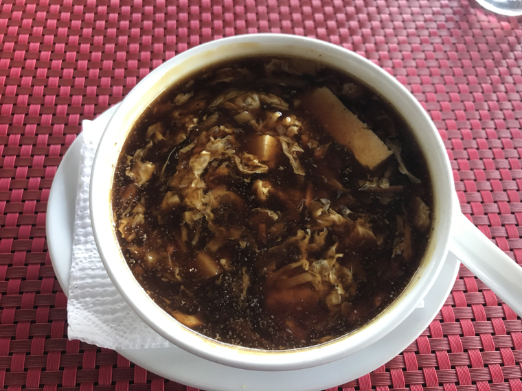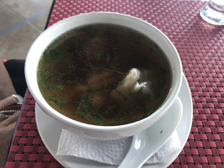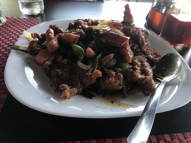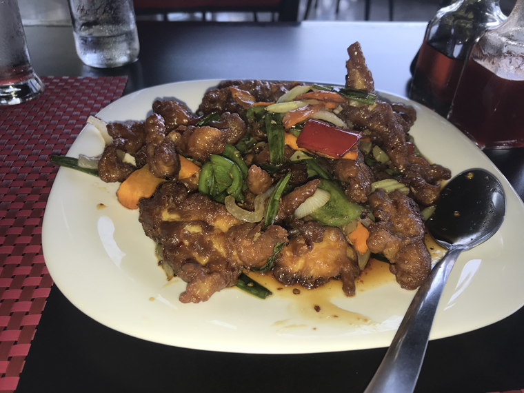 We ordered soup to start – Hot and Sour for me and Wonton for Beth. Potstickers as an appetizer and the Crispy Chicken with steamed rice as the entrée to share. To protect the food from the server each item was delivered underneath a plastic cover (like the top of a cake plate). As in our past experiences, the food was great and the service was excellent. It was so good that we got an order for BBQ Fried Rice to take with us for another meal.