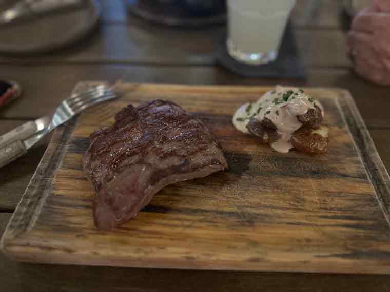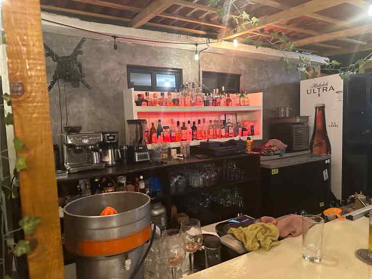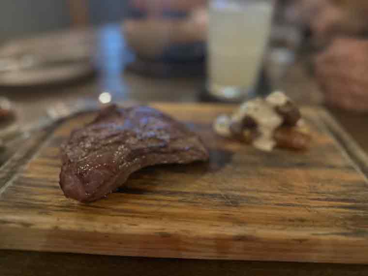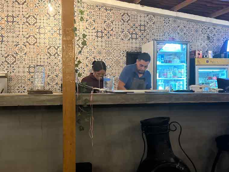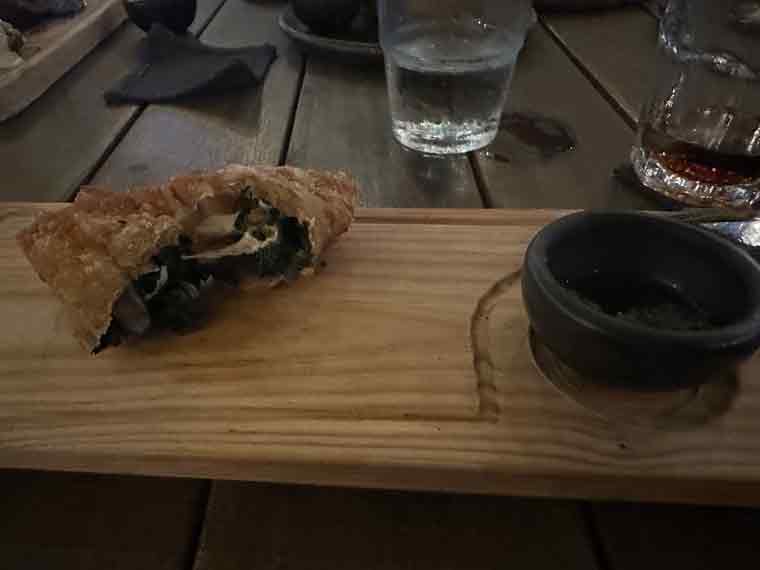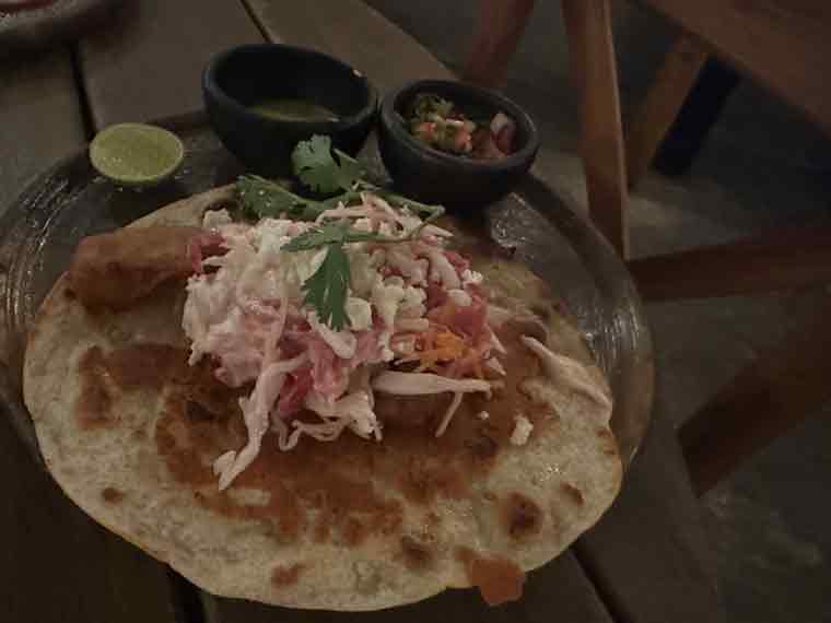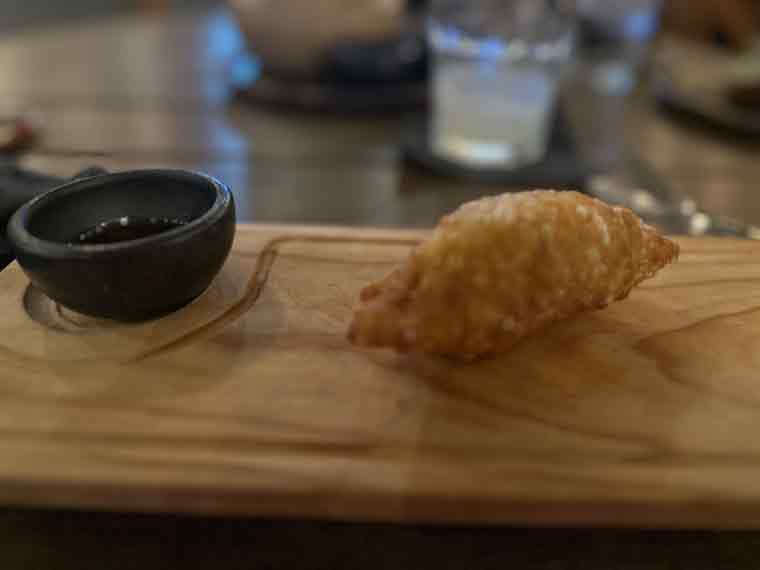 Entering the outdoor dining area, there is a bar with stools on the right and the kitchen on the left. Tables and umbrellas (for the afternoon) provide seating at about eight tables and a long bench along the kitchen bar. The combined lunch and dinner menus allow diners to choose from tacos, empanadas, tostadas, salads, pasta, meat on the grill, Argentinian sausages and sides – mac & cheese, French fries and grilled vegetables. There are also three different desserts.