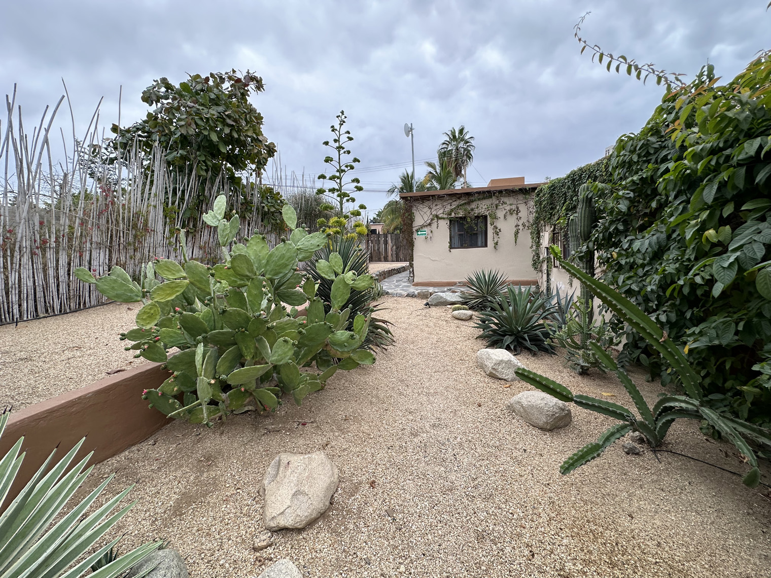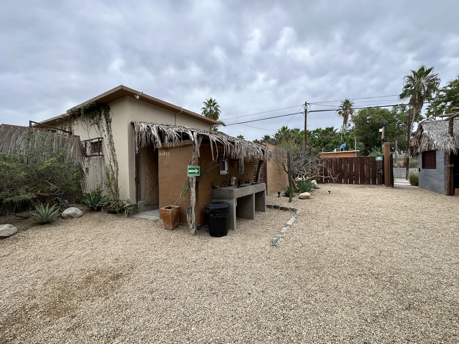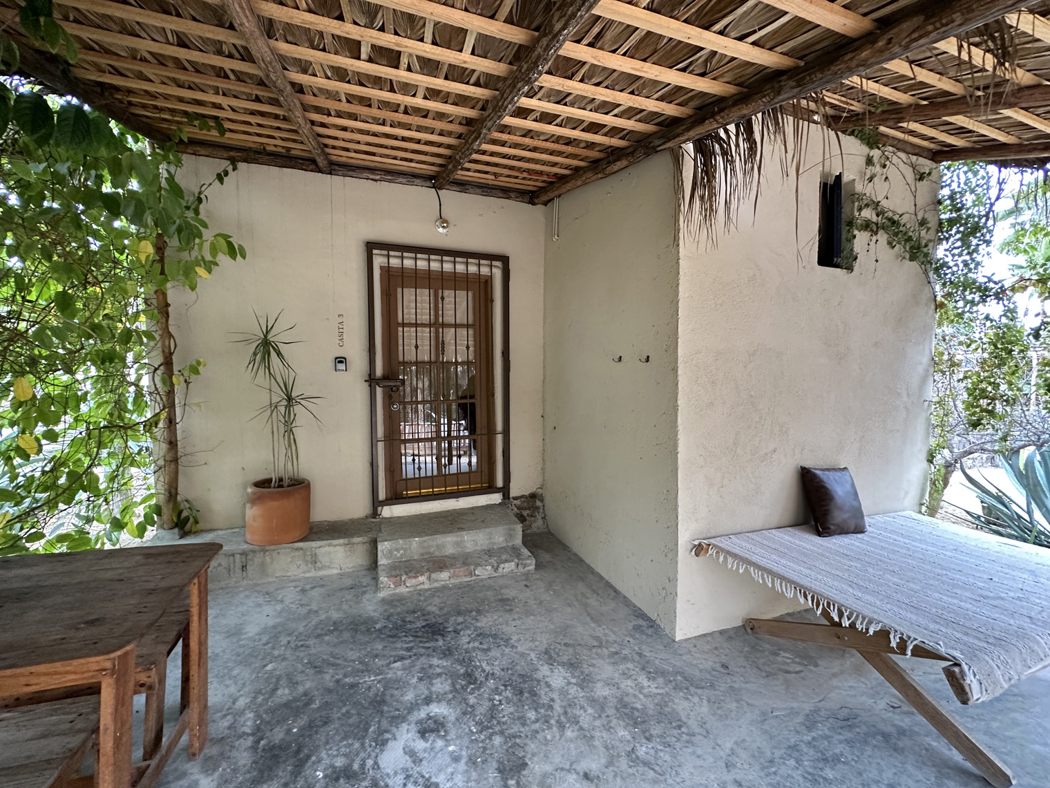 Both Santi and Mariela are photographers and so they started a blog about Todos Santos and its businesses and wrote stories about the local places they found. After a while, they decided rather than covering other businesses it was time to start their own. After a very short time, they had found a very large lot, overgrown with a palm grove and three casitas that had been built by the two previous owners. The bought it and in April 2020, just as COVID got underway, they took possession. The property needed a lot of renovation and so they parked their RV on the side of the lot and got to work. There are two two-bedroom casitas and one studio casita on the property. The clean them up, renovated where necessary, painted and went to work on the property. The first thing that they needed to do was clean up the palm grove that was completely overgrown. Some additional landscaping was added to provide a privacy area for the guests of the casitas. Guests check in digitally; are given codes for the main gate and for the lock box on their unit. I was able to tour one of the two-bedroom casitas. It was very large with a big kitchen, combined living, and dining room and the two bedrooms, each with their own bath. The furniture, artwork and details made the place even more comfortable.