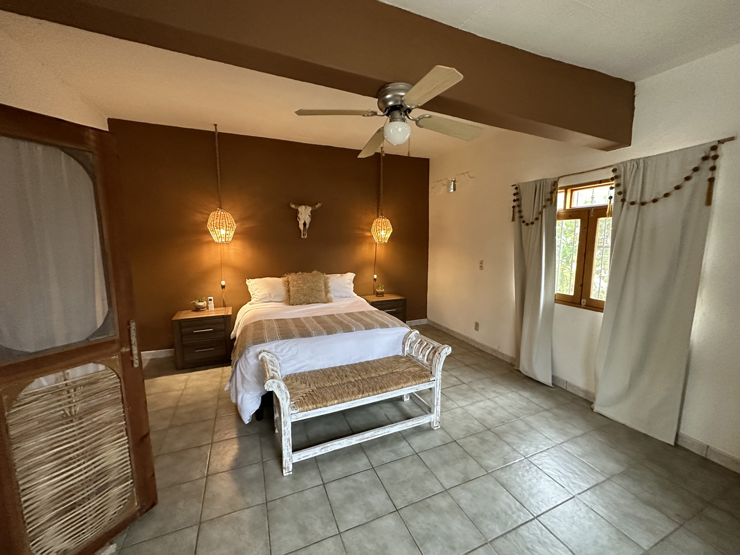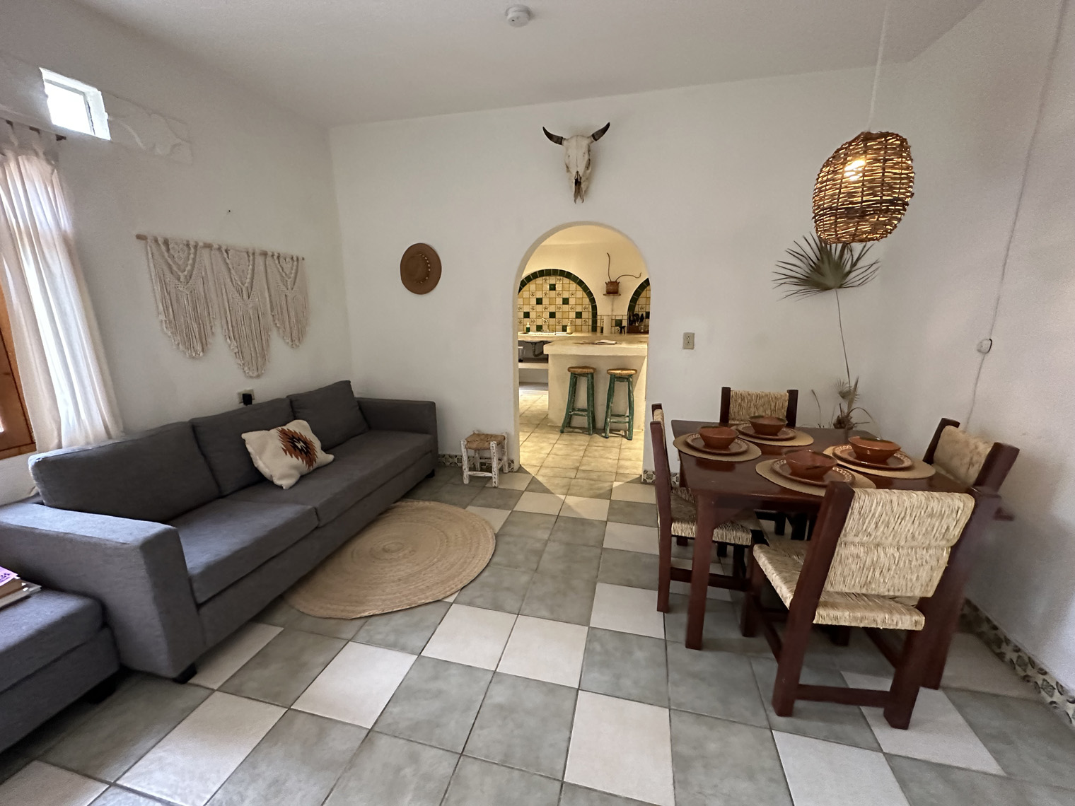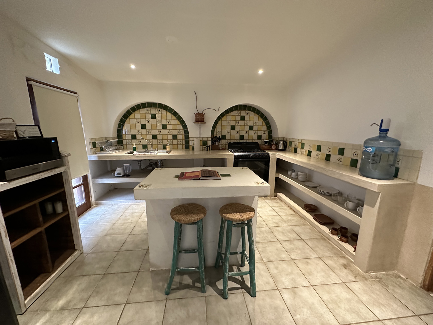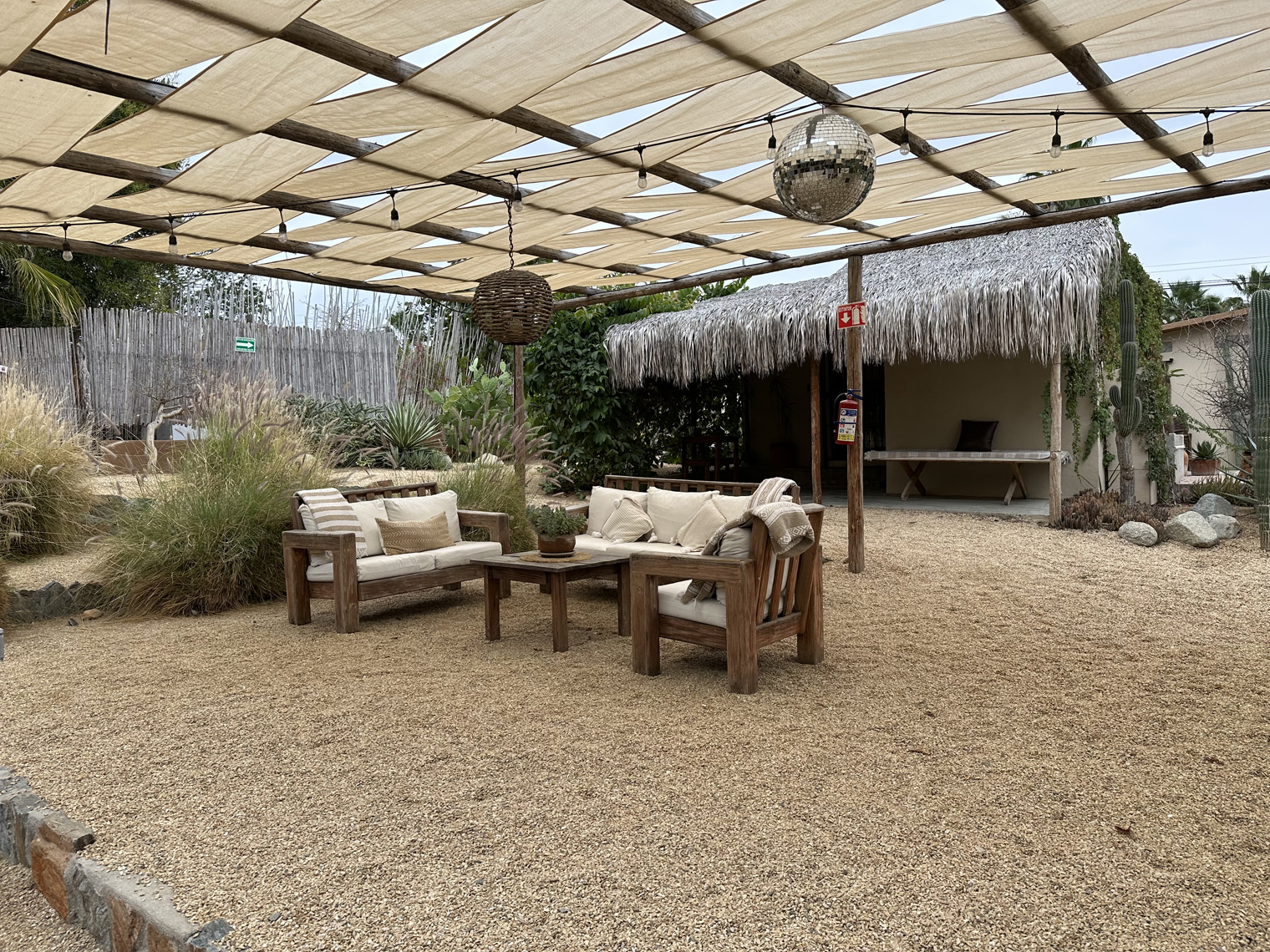 Both Santi and Mariela are photographers and so they started a blog about Todos Santos and its businesses and wrote stories about the local places they found. After a while, they decided rather than covering other businesses it was time to start their own. After a very short time, they had found a very large lot, overgrown with a palm grove and three casitas that had been built by the two previous owners. The bought it and in April 2020, just as COVID got underway, they took possession. The property needed a lot of renovation and so they parked their RV on the side of the lot and got to work. There are two two-bedroom casitas and one studio casita on the property. The clean them up, renovated where necessary, painted and went to work on the property. The first thing that they needed to do was clean up the palm grove that was completely overgrown. Some additional landscaping was added to provide a privacy area for the guests of the casitas. Guests check in digitally; are given codes for the main gate and for the lock box on their unit. I was able to tour one of the two-bedroom casitas. It was very large with a big kitchen, combined living, and dining room and the two bedrooms, each with their own bath. The furniture, artwork and details made the place even more comfortable.