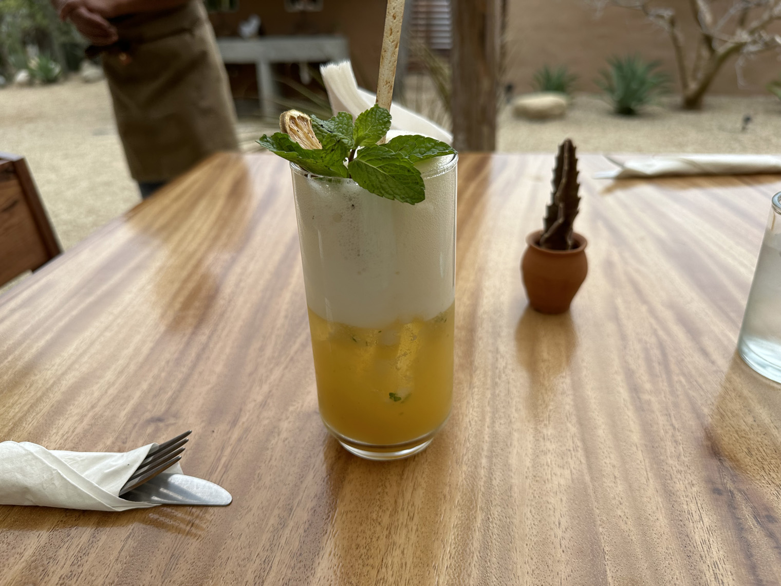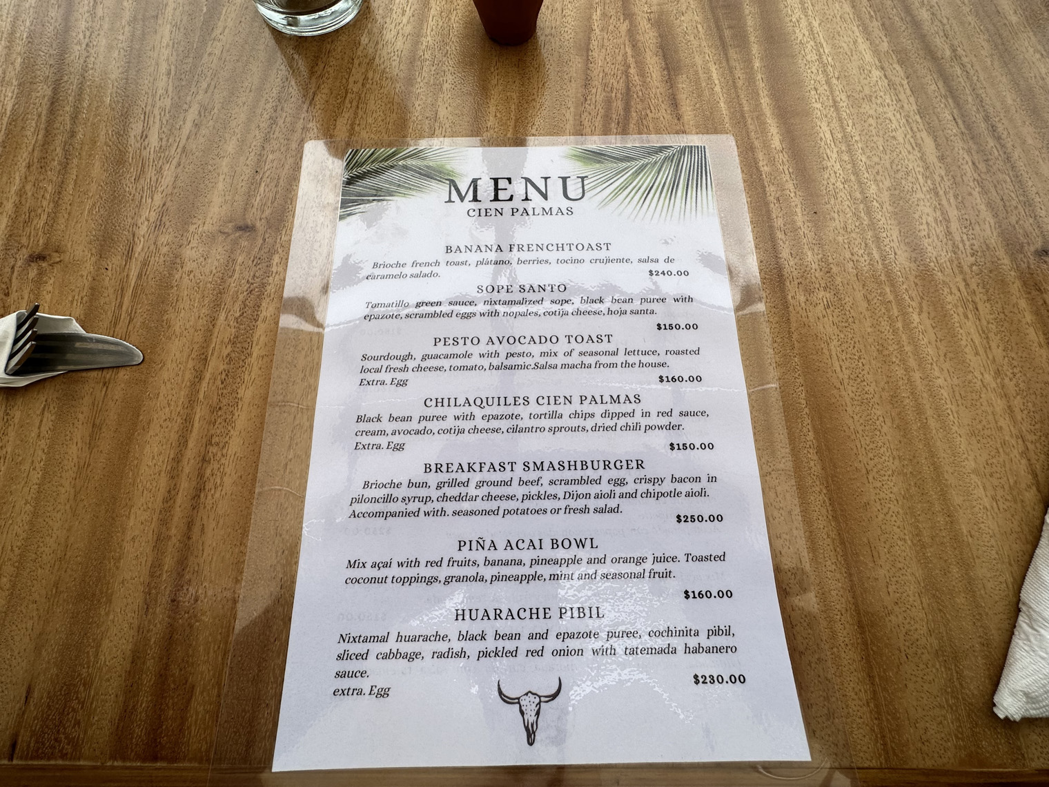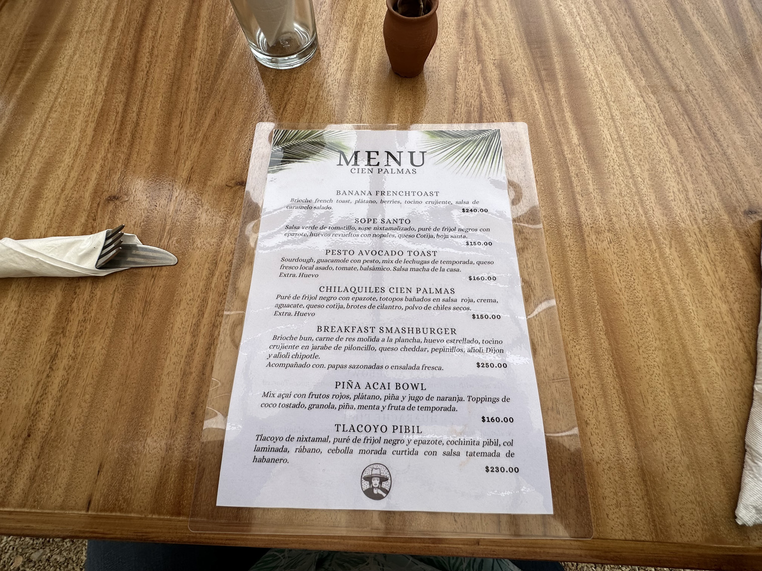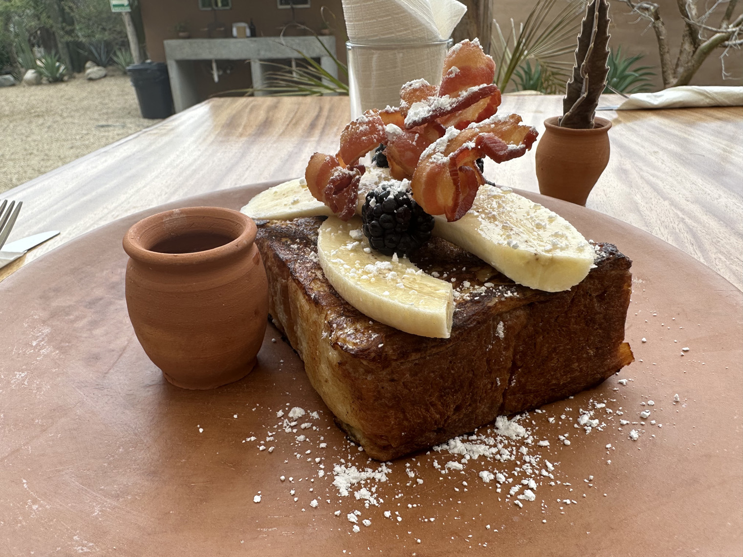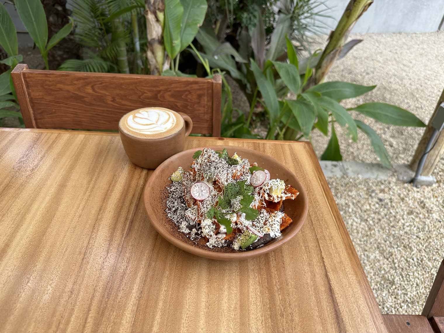 Gustavo at La Tinajas Winery and Raul Monroy had both highly recommended Cien Palmas. Raul described a Thursday night event with a DJ attended by about 300 people from the local community with great drinks and tacos. I visited about noon and so, I had the opportunity to sample the brunch menu. The top item on the menu was Banana French Toast. I had to try that. Santi said that he would also like me to try a more traditional Mexican dish – the Sopa Santos. Felipe asked me what I would like to drink. My standard Coca Light was not available and so he made me a ginger-based drink with fruit juice that was amazing. While I was waiting, I watched Mariela setting up to photograph some of their menu items – a latte and chilaquiles and so I took some pictures. The presentation was amazing.