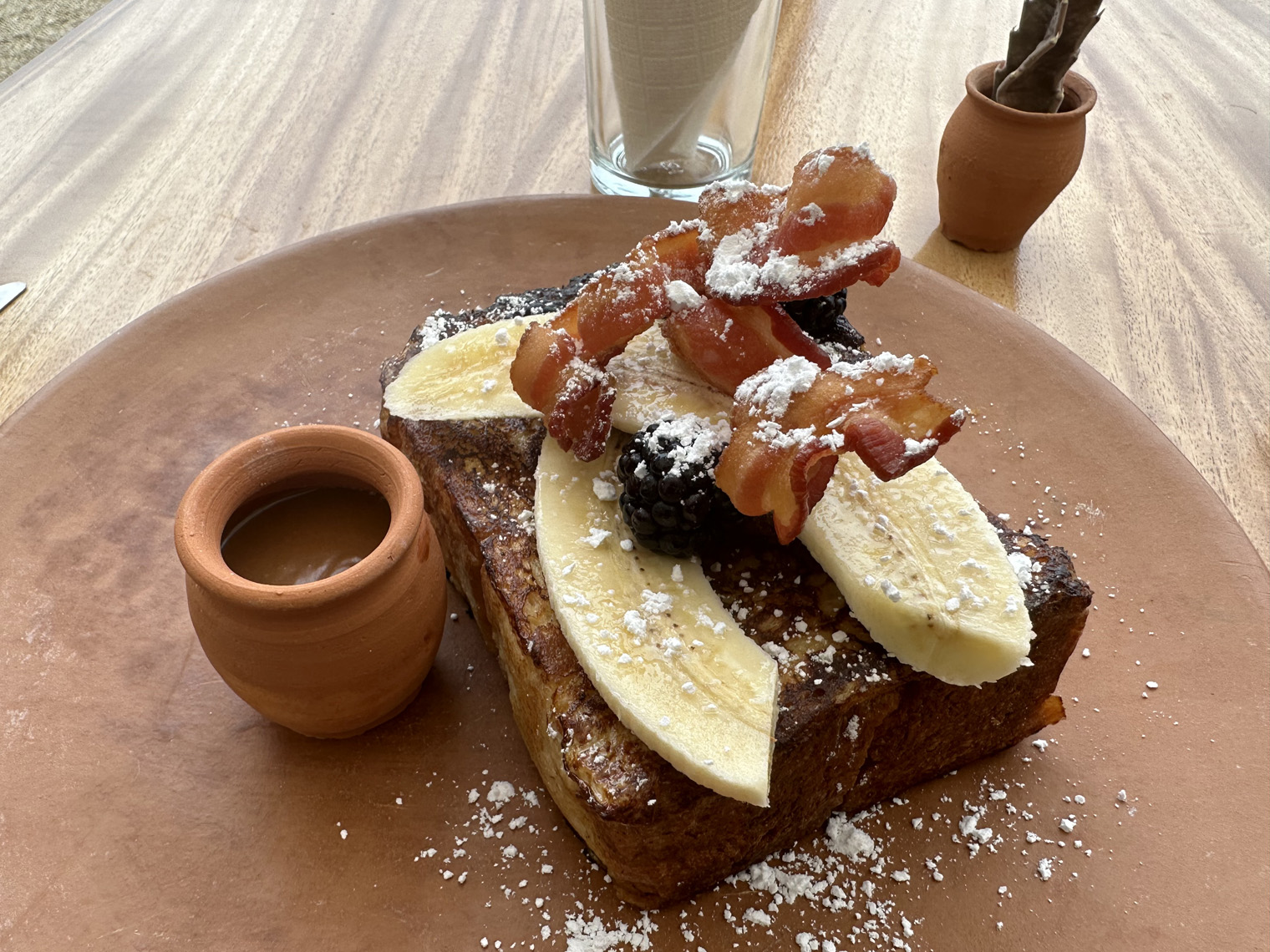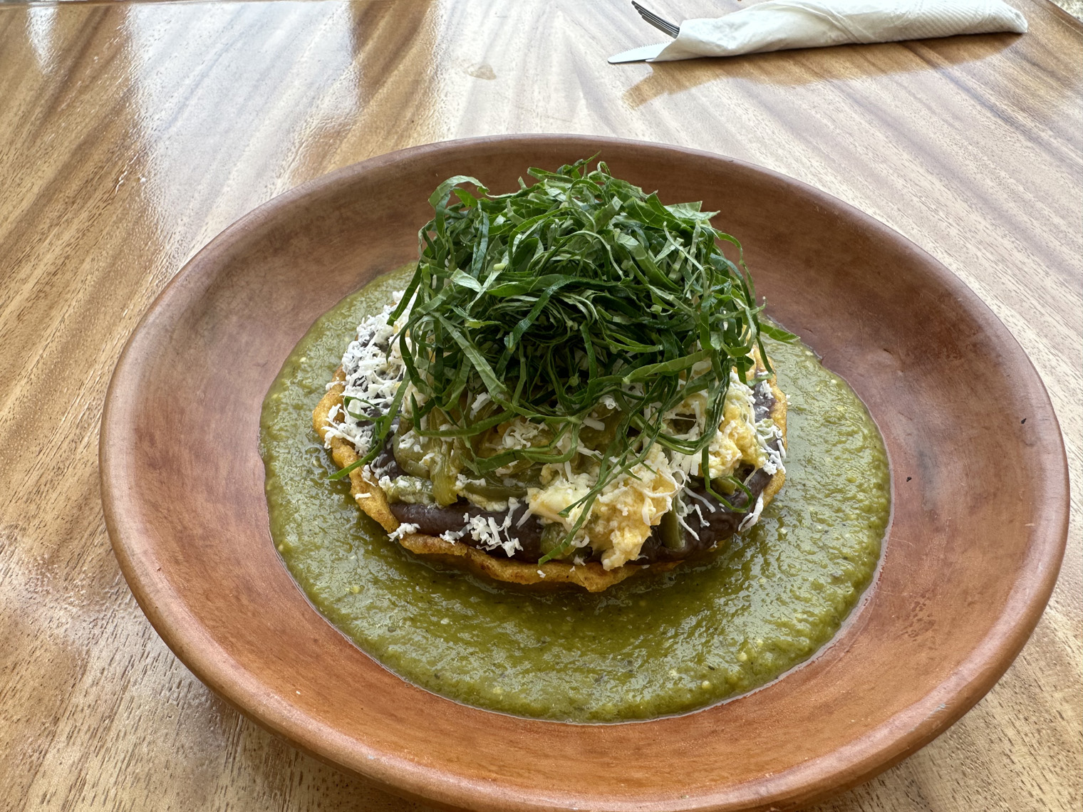My French Toast arrived and what a sight. The thick piece of bread was covered with icing sugar, two large slices of banana, bacon and some fresh fruit. It also came with a small cup of caramel sauce with a little salt. The flavors were amazing. It couldn’t stop until I finished the whole dish. The Sopa Santos was quite a contrast. The chef, Malia came out to explain it to me. A nixtomalized sope in a bed of tomatillo green sauce with a black bean purée covered with scrambled eggs with nopales and cheese and topped with a leafy green hoja santo. I was so full that I couldn’t finish it but again the flavors were amazing.