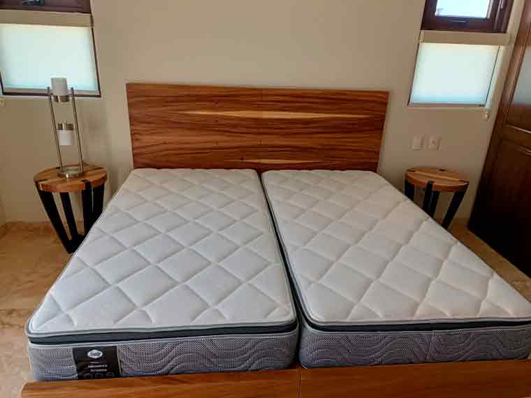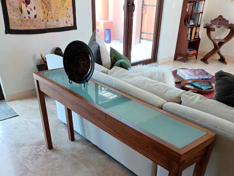 The latest person to use him was Cindy one of our neighbors in Pueblo Campestre Phase 2. She asked Carlos to build two single beds that could be combined into a king size bed or used separately, with two end tables as nightstands. For the living room she was a unique bureau, console table with a frosted glass top for behind the couch and a full wall unit and entertainment center covering the whole end wall of the living room. Delivering and installing the furniture was easy. For the installation of the wall unit, Carlos brought the entertainment center in six pieces and installed them to look like they were built in place. They also installed the mount for the flat screen television and the television itself. With shelves, drawers and the television, the wall unit adds tremendous functionality to the room.