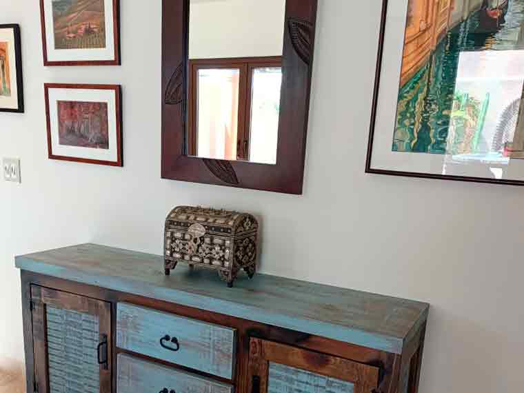 Moving into a new townhouse requires a lot of thought and decisions about upgrades and furniture. We were lucky early on to learn about Carmat Carpinteria in La Paz. We visited Carlos Ochoa in his large shop in La Paz, where it was clear that he was building a lot of large kitchen and bedroom installations for house. Since we engaged Carlos to do our living room wall unit, island, desk, bar stools, outdoor bench, side tables and a mirror and drawer for the entry several of our neighbors have hired him to create things for them.