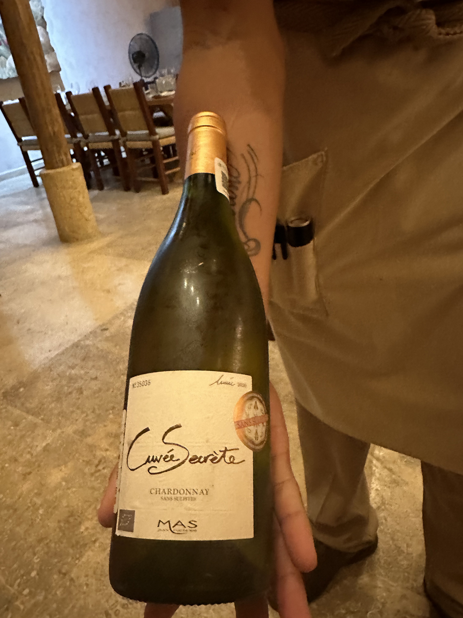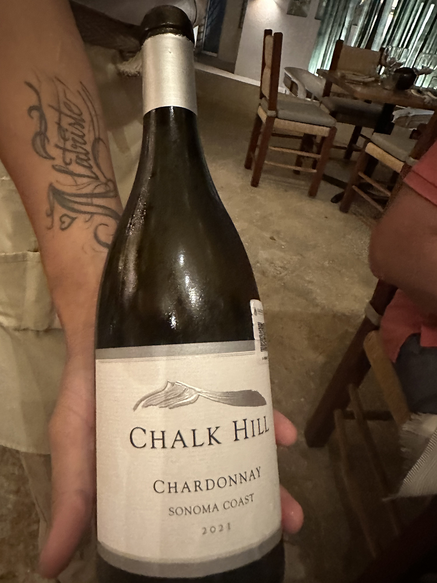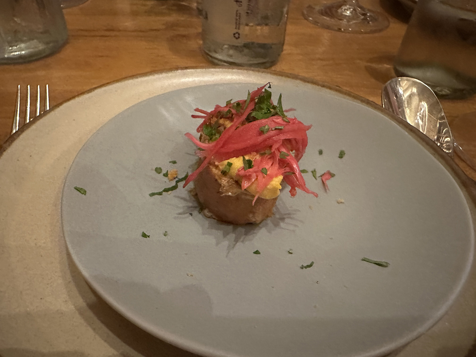There are two servers that provide service to every table. We were offered the menus, ordered a bottle of good Chalk Hill California Chardonnay and some water as we each studied the menu. Each of us was present with an amuse bouche compliments of the restaurant – a small piece of fresh bread with a fish paste, beets, onions and greens as garnishes. It went great with our Chardonnay.