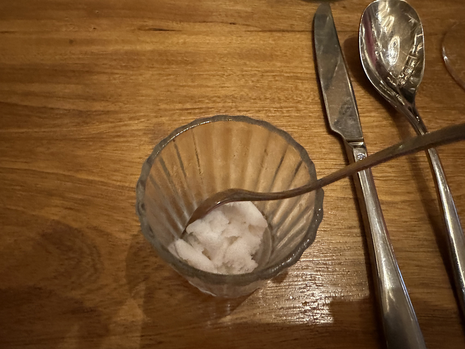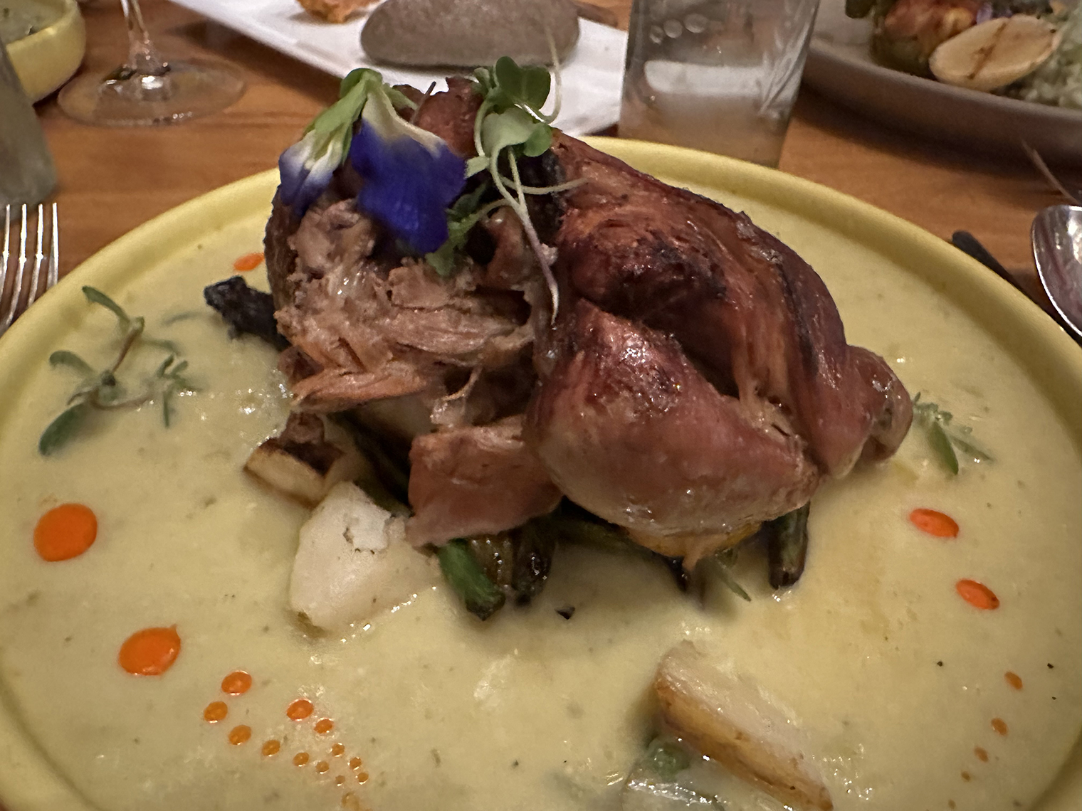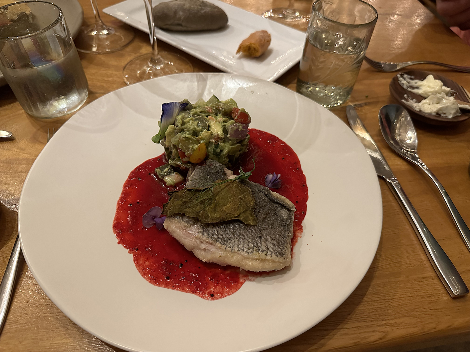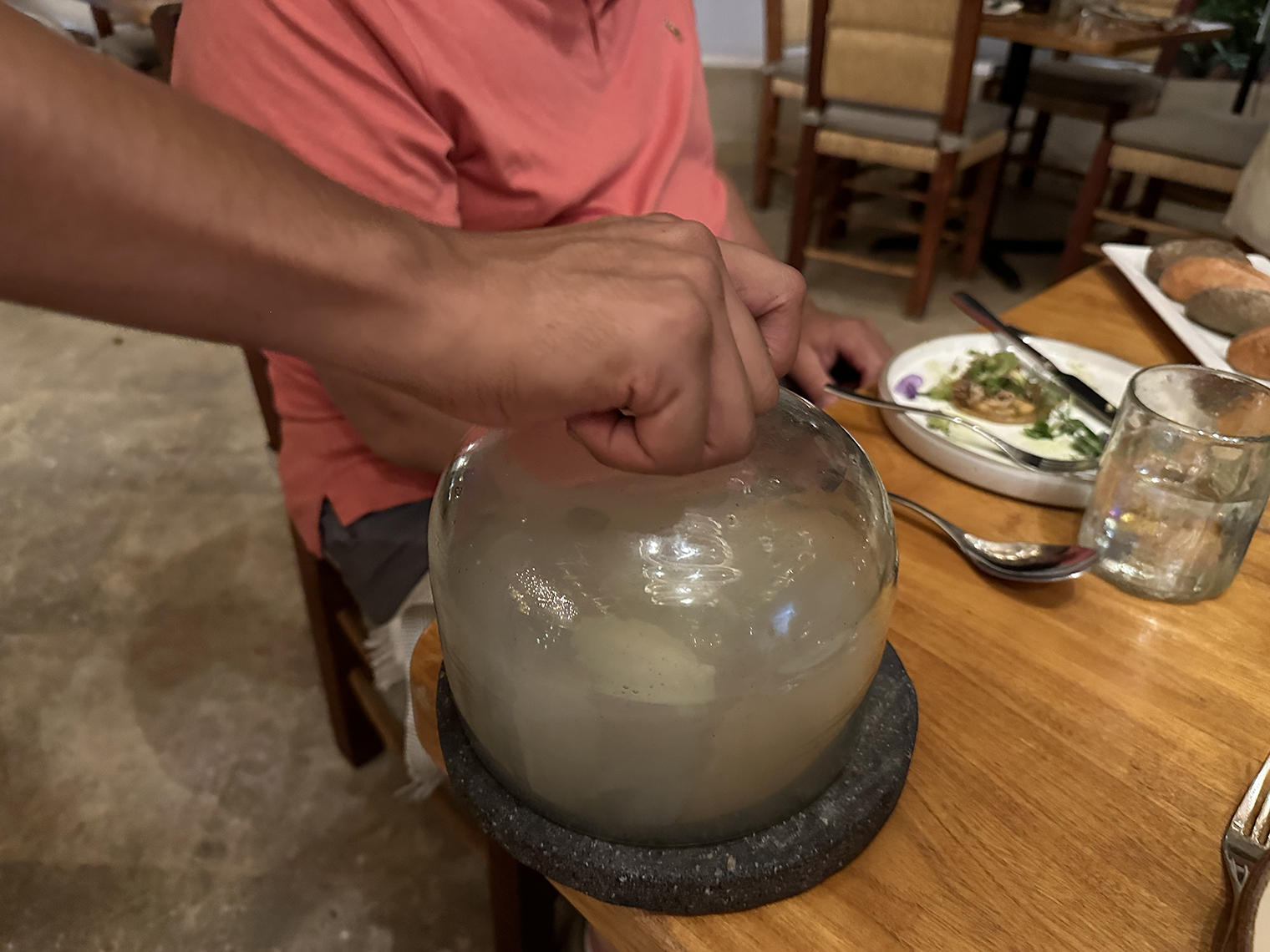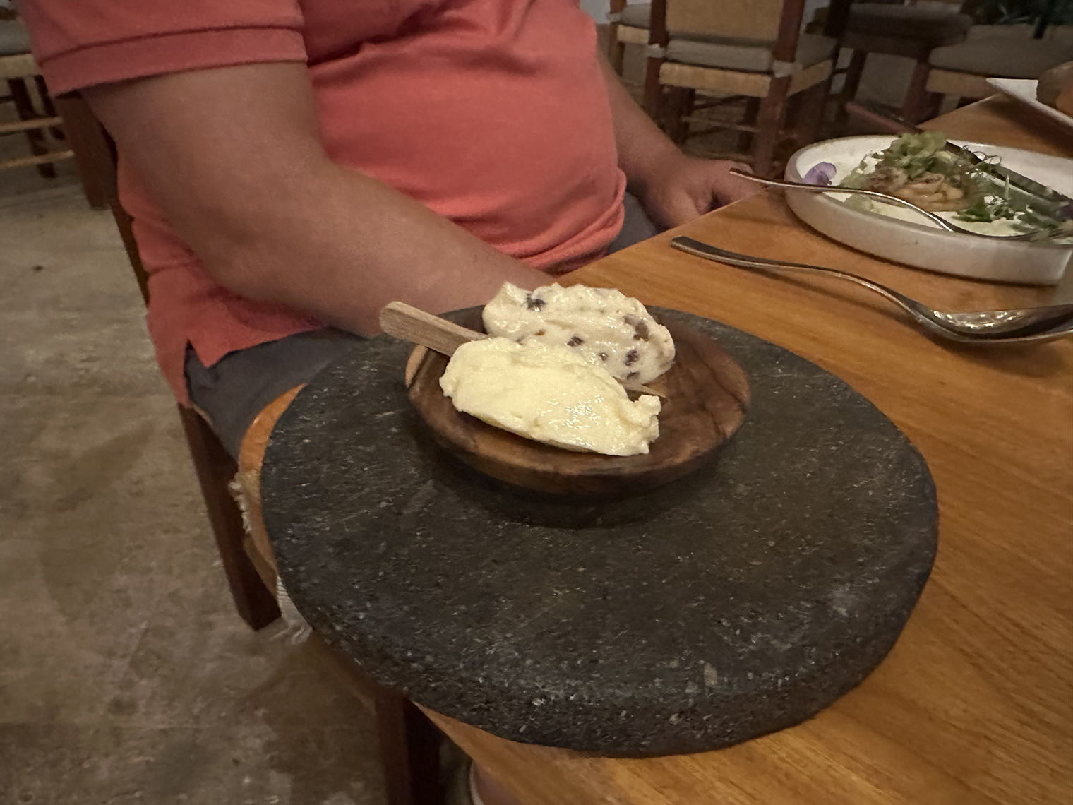 With our appetizers we were served two different types of freshly baked rolls and two organic butters – one with mushrooms – that were presented in a dome covered plate chilled with the freezing air coming off as the glass dome was removed. Between courses, we had a coconut sorbet to cleanse our palates.