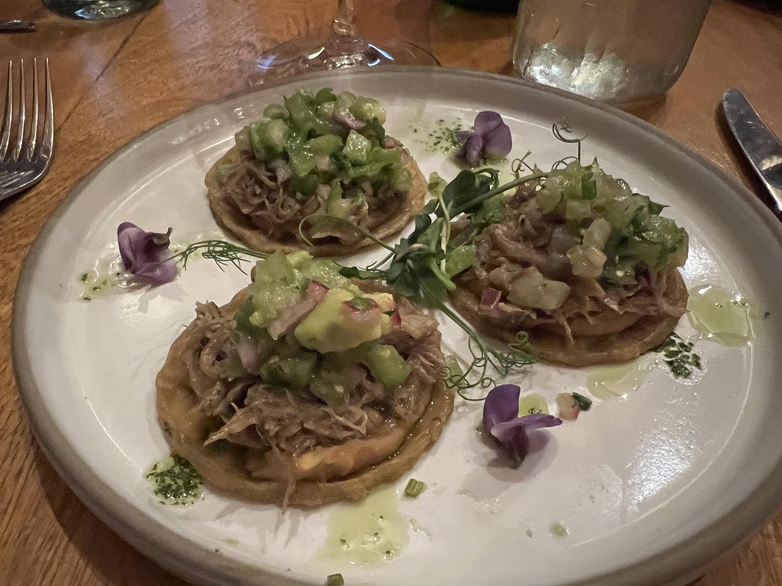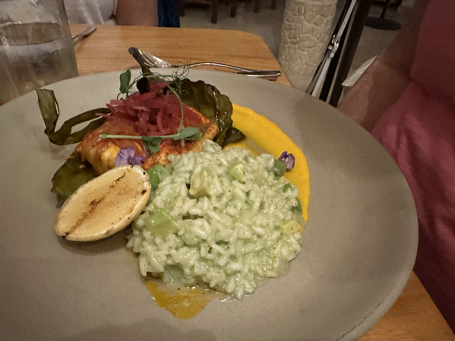 The main courses were equally impressive. Both Mike and I ordered the pork shank. Beth selected the catch of the day in a potato crust with citrus salad of xoconostle, cactus, tomato, avocado with acuyo oil and a sour pitahaya sauce with mint essence on a nopal chip. Michele similarly went for fish with the catch of the day in red axiote rub, baked in banana leaf with carrot puree with citrus and cold smoked habanero, roasted xnipec and risotto with pepper leaf.