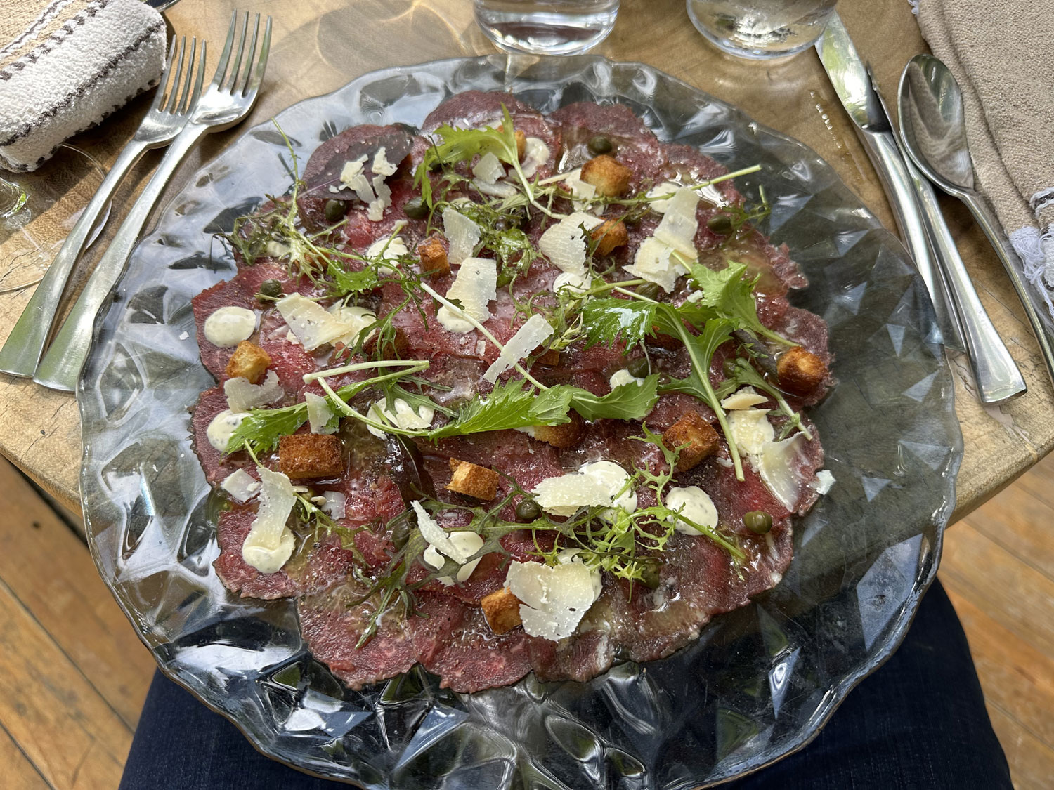 When Sharon arrived, our server gave us the menu and asked if we would like anything to drink. I was a special lunch and so I ordered a glass of Chardonnay and Sharon joined me. They served us a H Head High Chardonnay, which it turns out is from Sonoma County, California where my favorite Chardonnays are from. At the same time, we were provided with an eggplant amuse bouche with crispy crackers and bread. Not generally, an eggplant fan, I was extremely pleased with the flavor of this little treat. For lunch, I ordered the beef carpaccio, which was served with truffle mayo, capers, lemon, olive oil, and French fries. It was amazing and portion was so large that asked for about half to go. Sharon had the Catch of the Day, which was sea bass and was served with potatoes, a stack of vegetable and olives. She said that it was excellent. As our meal was ending, we had the chance to meet the chef – Aurelian Legeay – to learn more about the restaurant – a place where Sharon would really like to perform.
