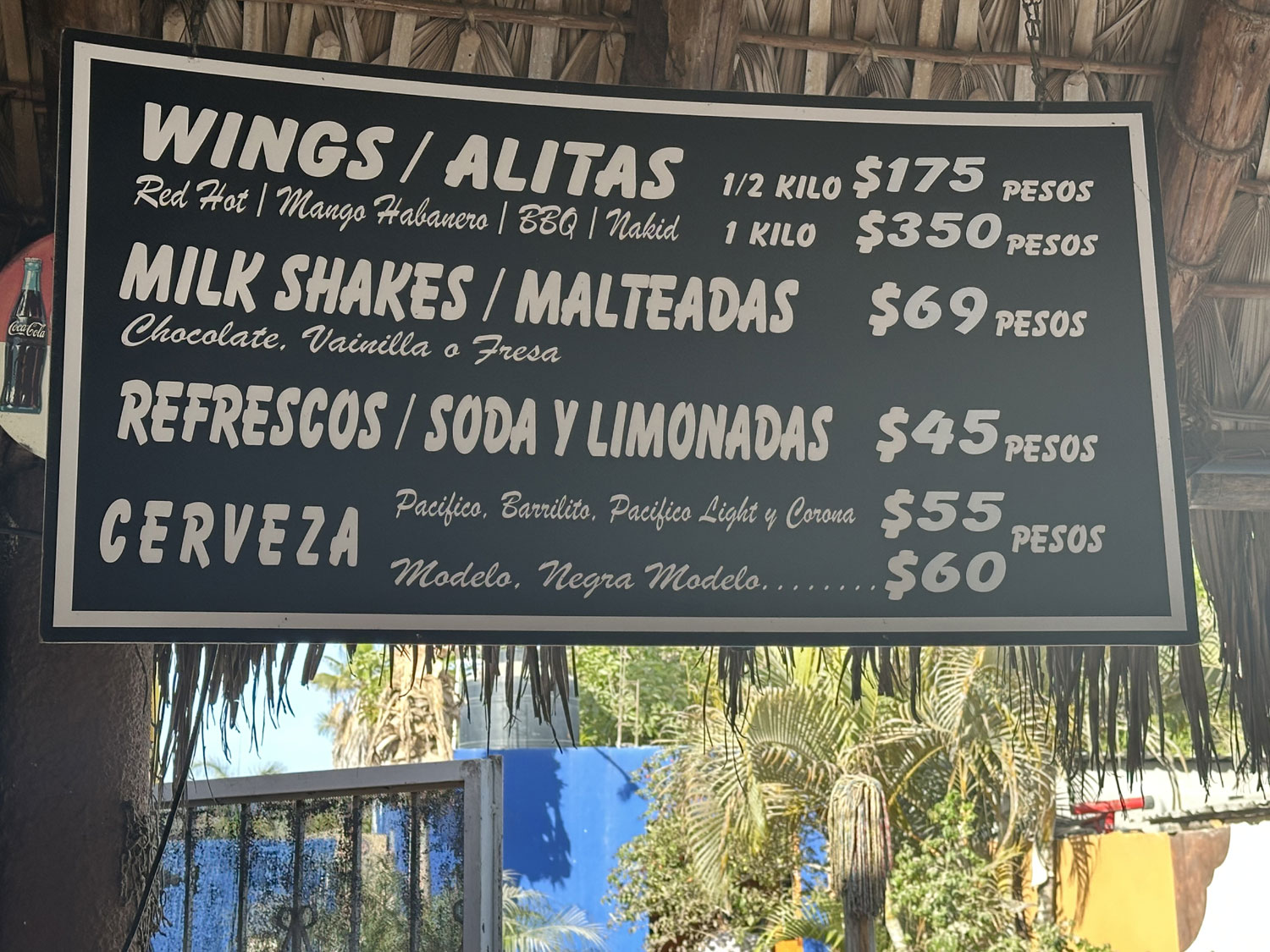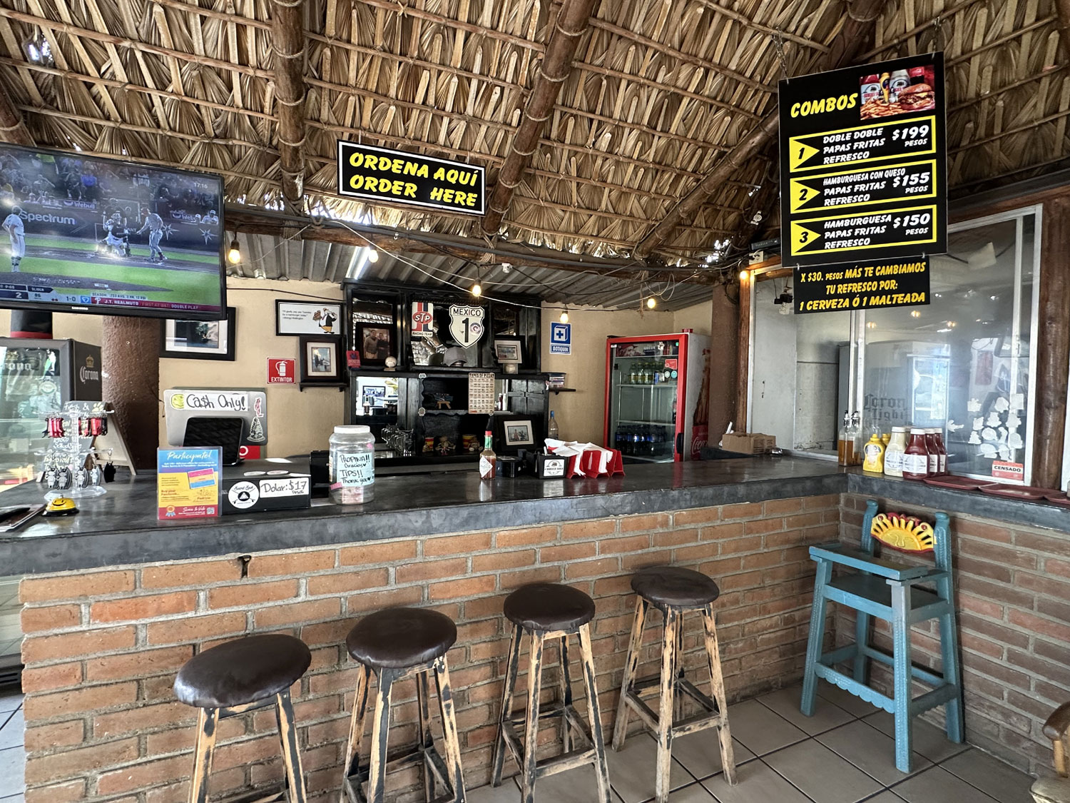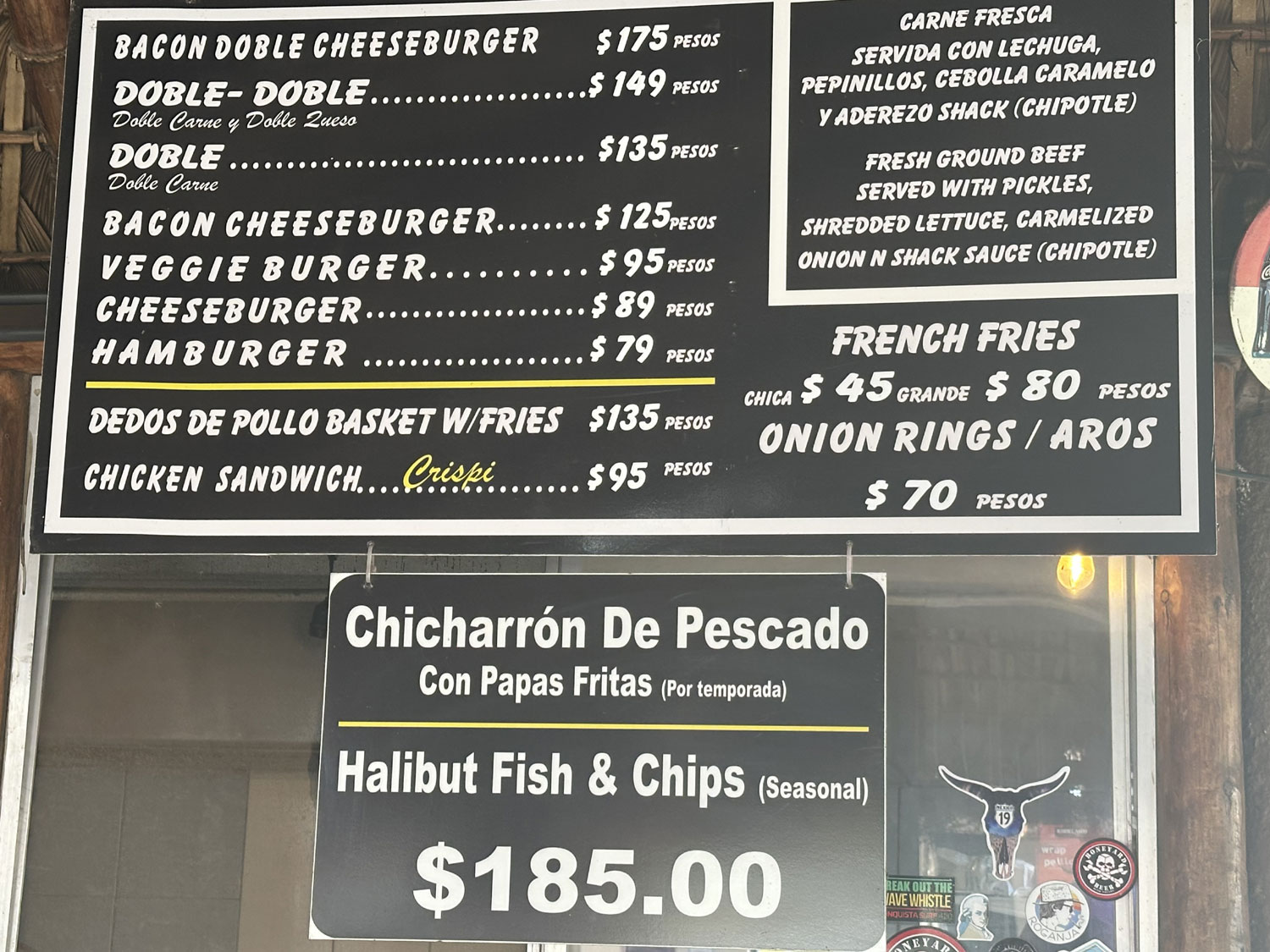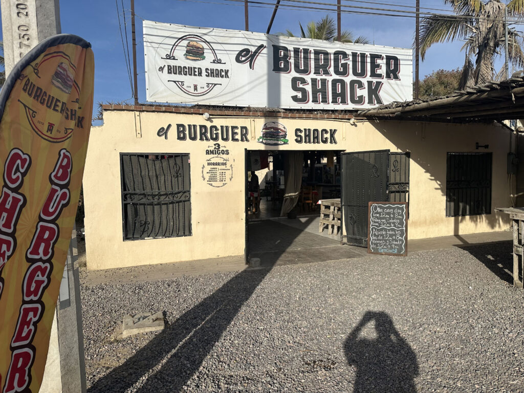 Driving from Cabo San Lucas to Todos Santos, it is hard to miss the signs announcing how far it is to El Burguer Shack, which has locations in Pescadero and Todos Santos. We decided to stop for lunch at the Pescadero location just after the main intersection on the right. The menu is posted on the wall, and you order at the counter. The menu includes hamburgers, double and double-double burgers, cheeseburgers, bacon cheeseburgers, chicken burgers, veggie burgers, chicken wings, fish and chips, French fries, and onion rings. Milkshakes, sodas and beer are available for drinks. There are also combos of burgers, fries, and a drink available.