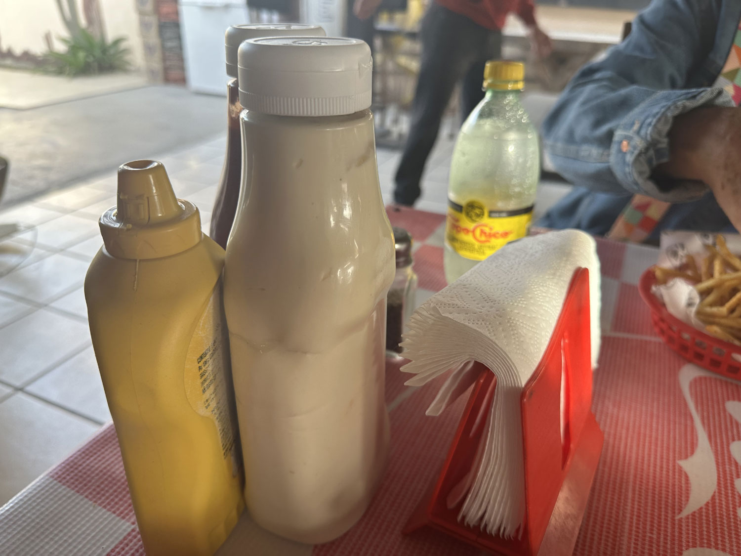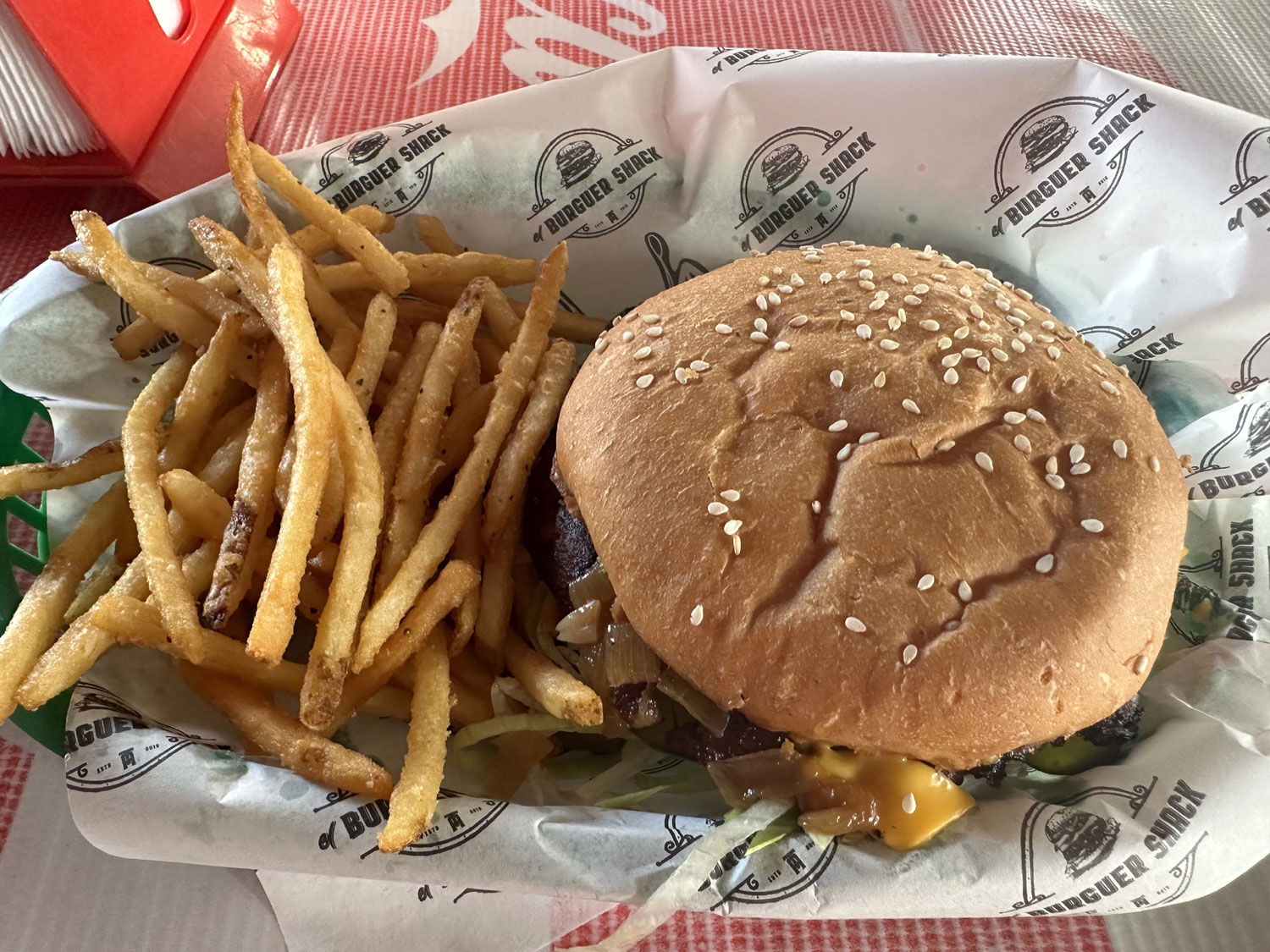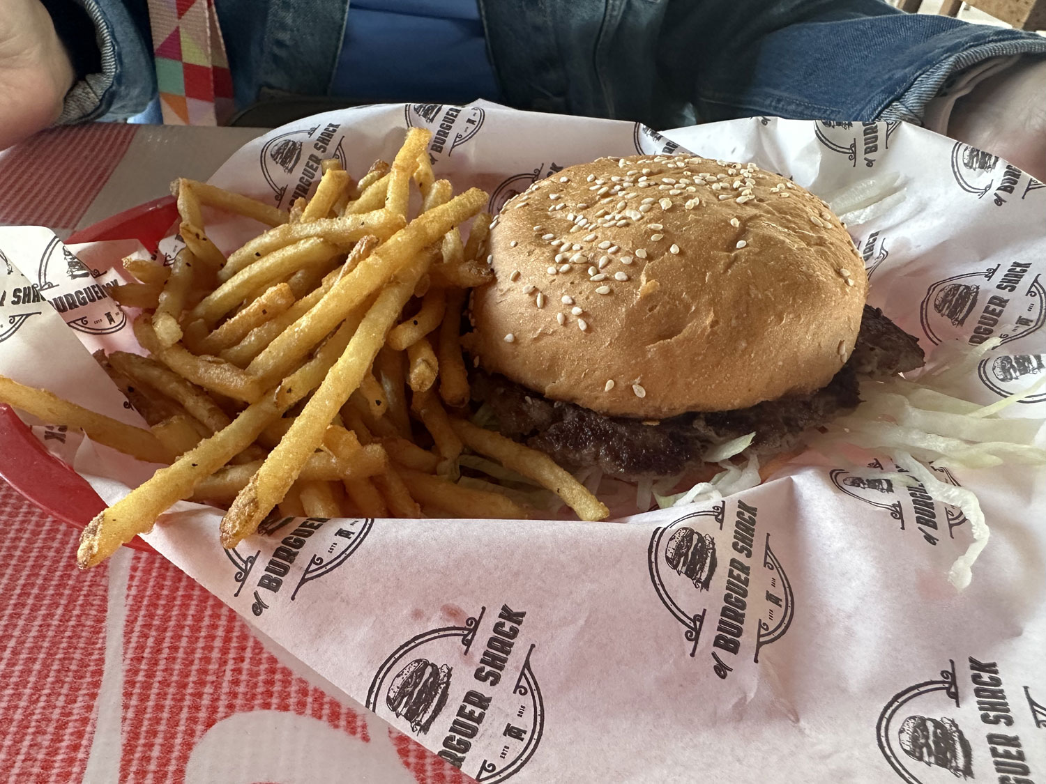 Beth orders the burger, fries and Topo Chico combo and I chose the cheese burger combo with diet Coke. We sat at a table and the food was delivered very quickly, along with ketchup, mayonnaise, and mustards. The hamburgers were like smashburgers – thin – with caramelized onions, lettuce, and tomatoes, and in my case a slice of cheese. They were excellent – a look of flavor. The French fries were thin cut, crispy, and also very good.