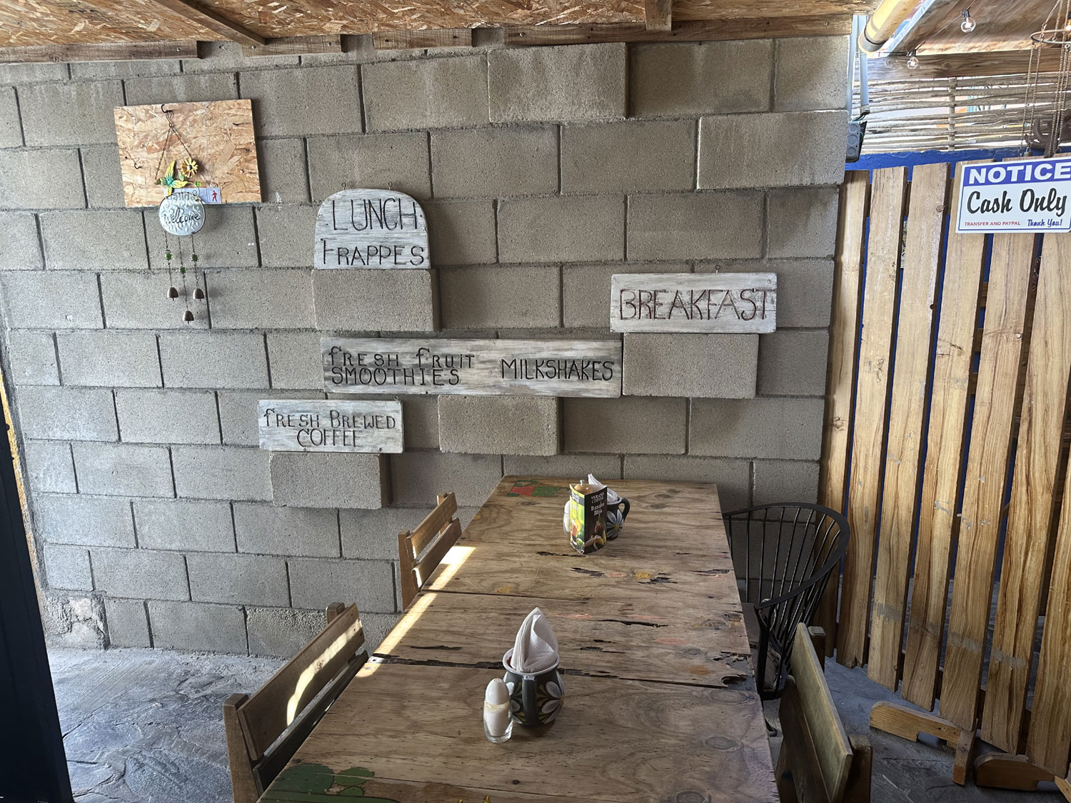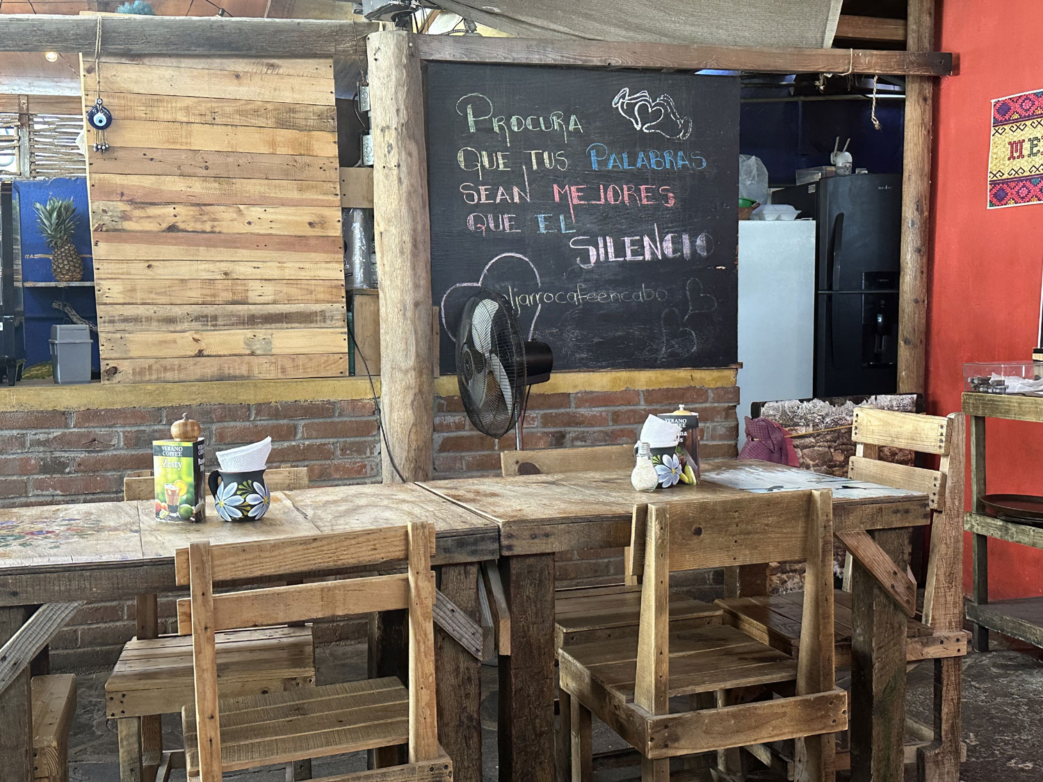 Located on the corner between Hotel Me Cabo and Hotel Casa Dorada in the Medano area of Cabo San Lucas is a small cafe – El Jarro Cafe and Grill. This rustic restaurant includes a bar at the front on the right and a small interior dining room with simple wooden tables and chairs. This Mexican restaurant offers both breakfast and lunch (open from 7:00 am to 3:00 pm). For breakfast, diners have a choice of traditional Mexican fare – chilaquiles, burritos, Huevos Rancheros or Divorcada, Mexican Omelets, or more American-style breakfasts – omelets, pancakes, French toast, egg and cheese sandwich, crepes or fruit salad. For lunch, all of the standard Mexican dishes are available – tacos, fajitas, quesadillas, enchiladas, combos and vegetarian options. Beverages focus on a full range of coffees, smoothies, fruit juices and even milkshakes.