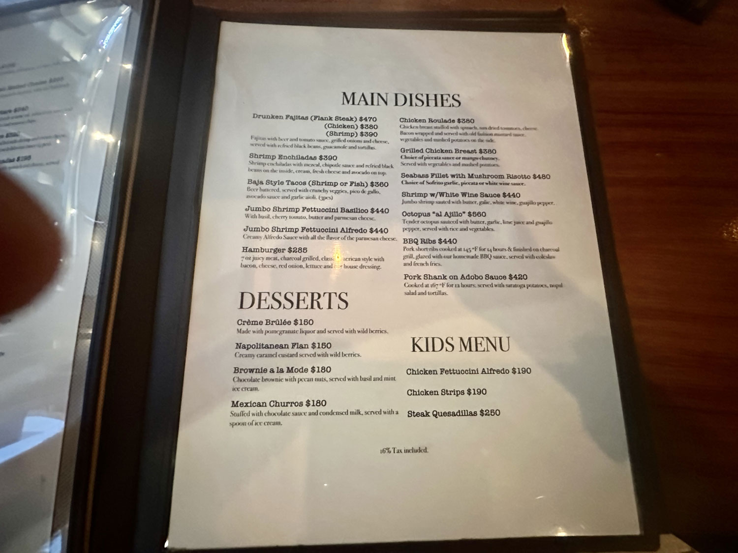 We thoroughly enjoyed the food. The service was excellent. Our server tried to convince us to have dessert but we were both full (and on low carb diets). The whole meal with our drinks was only $1,160 pesos!