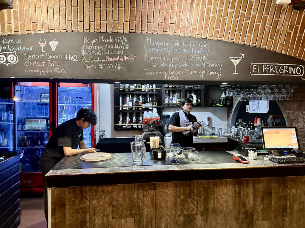 Located on the corner of Calle Zaragoza and 20th of November in Cabo San Lucas is El Peregrino Restaurant Bar. With is green front, I recognized that we had driven past it many times in the past. Several people on Facebook had commented that this was one of their favorite places in Cabo San Lucas. Entering the restaurant, the dining room has about 10 tables seating two to eight people. On the right side inside the door is the kitchen and then the bar serving the restaurant. Blackboards list the daily specials – reduced priced items from the menu – and all of the drink specials above the bar.