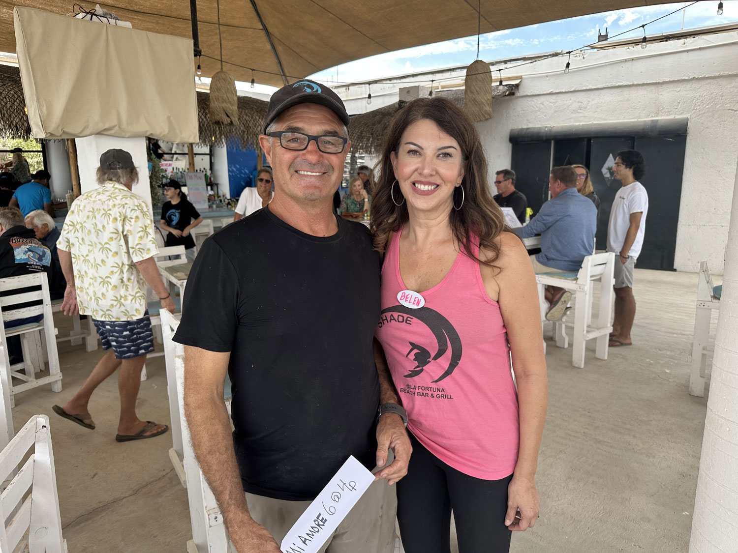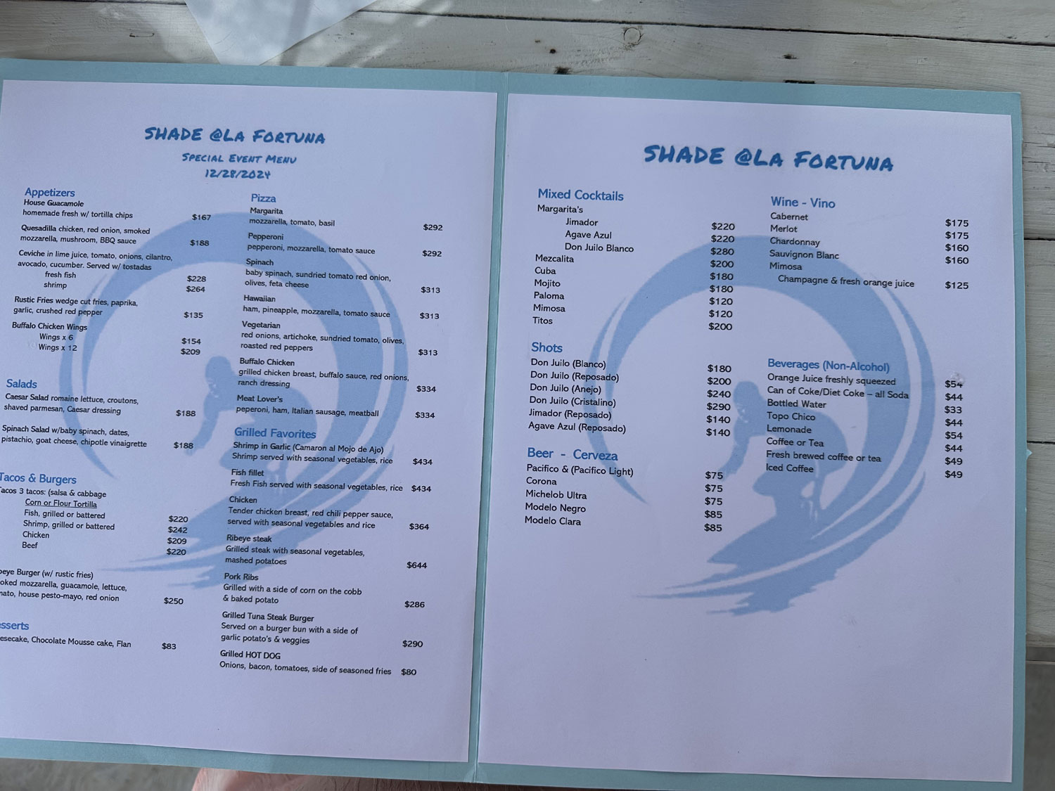 We made a 3:30 reservation at Shade in La Fortuna to have a late lunch and enjoy Extra Large Perform. As the restaurant was completely booked, Marcus and Belen, the owners had put signs on each table with the name of guest. We asked our neighbor Tracy to join us for the afternoon. Shade has outdoor dining under a fabric roof, a special area for the stage for live performances, seating at the bar and outside with a fire pit. We found our table and later were greeted by Marcus and Belen and offered the special menu for the day.