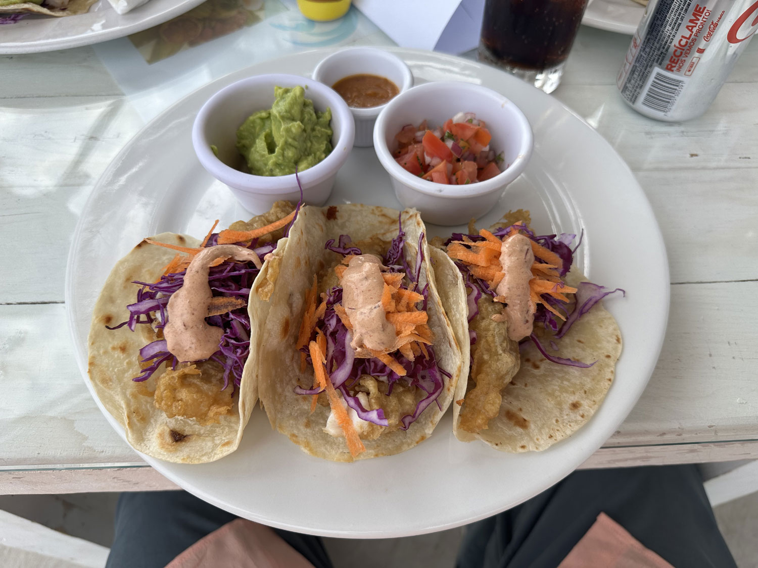 We were all in the mood for fresh tacos. The ladies ordered the battered shrimp tacos in flour tortillas, and I chose the battered fish tacos with flour tortillas. Each of the taco plates had three tacos covered with shredded cabbage and carrots with a chipotle sauce on top, and three ramekins with guacamole, Pico de Gallo, and a salsa. There was lots of fish and shrimp in each taco. The fish tacos were juicy and flaky, and Beth and Tracy said the shrimp tacos were great too.