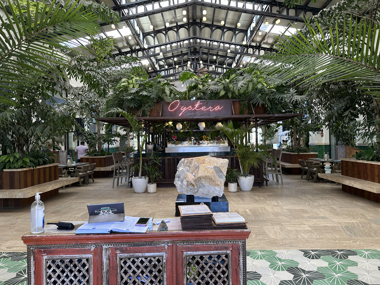 Oystera has been open two years this April (2023). Starting at the entry to Oystera, Abe said that there ideas was to create a diverse gastronomic experience for their guests. The main restaurant takes up the center of the building and has both bar and table seating in the courtyard. The bar is takes up the whole center of the space. To the left of the main entry is an antique shop. Abe explained that it will soon become an Omakase Sushi experience. With a long bar from front to back, guests will enjoy a multi-course Japanese meal planned by the chef. At the back right corner of the building where a coffee bar now stands will be a New York Style Deli and Store. Customers will be able to buy wine, bread and deli items. Abe fell in love with Katz’s Delicatessen in a recent visit to Manhattan and decided that locals and visitors to Todos Santos have the right to have a great pastrami or corn beef sandwich. In the second space on the left size is an Art Gallery, which features exhibits by different artists on a regular basis. Beside it is a Pietra Gallery, an eclectic mix of clothing, wall hangings, furniture, sculpture and other unique artwork. At the front of the building to the right of the entrance is another boutique, Gabee’s with clothing and personal accessories.