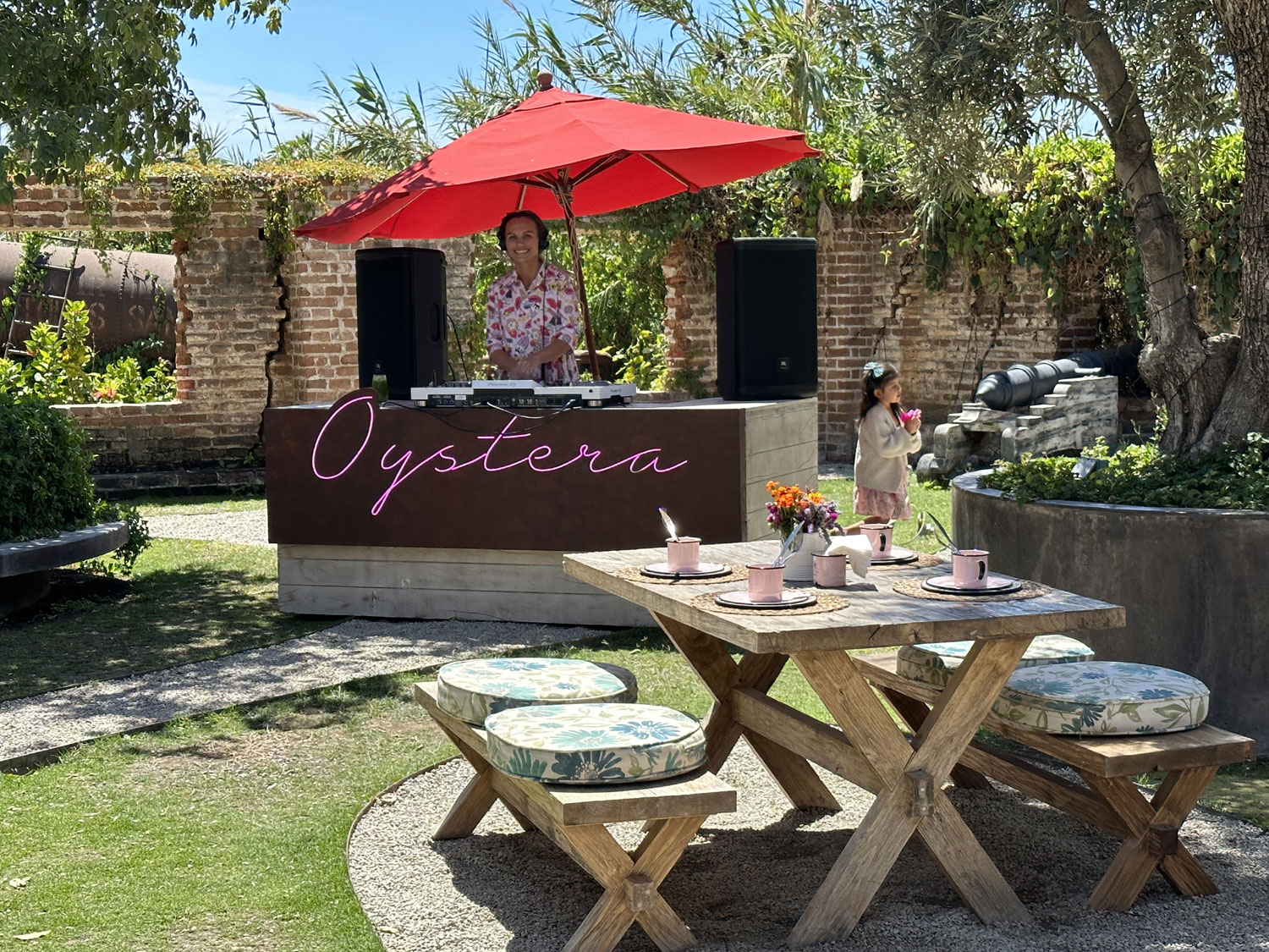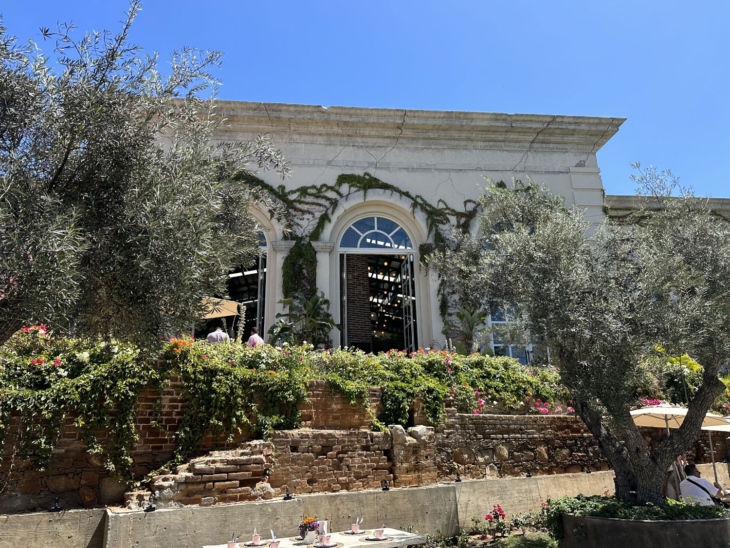 However as I mentioned, the building itself is only a small part of the property and the vision. Walking out the back, there is outside seating for the restaurant with umbrellas to protect from the sun. Down below is another garden restaurant, with a separate menu and a DJ station spinning tunes and day and evening. While these exist now, the plans are much more extensive. The second building beside the garden restaurant, which houses it’s kitchen also has a rooftop deck that will become another spot for food and drink. Walking past that building into the parking lot on the east side of the building is the first time that I got a sense of the expanse and the vision for Oystera. Across the parking lot, through a set of unique gates and down some steps is the beginning of Oystera’s wine experience. There is a wooden deck (waiting for railings), a kitchen with a wood fired oven, all looking down on their own vineyard.