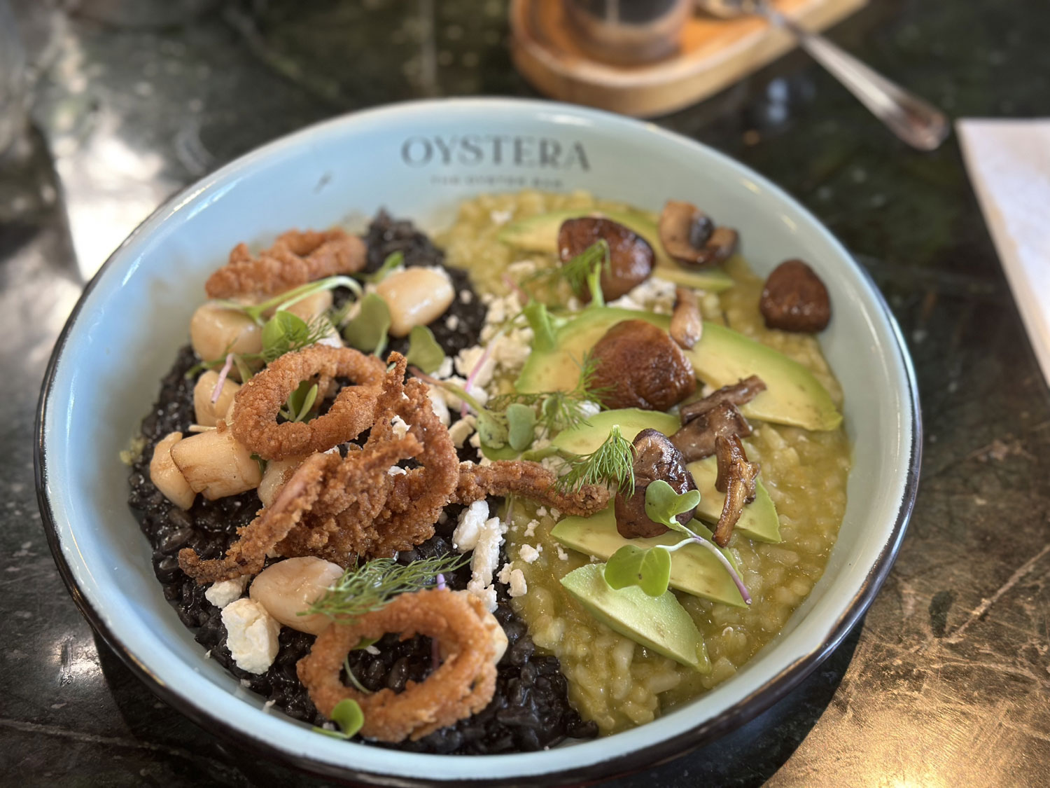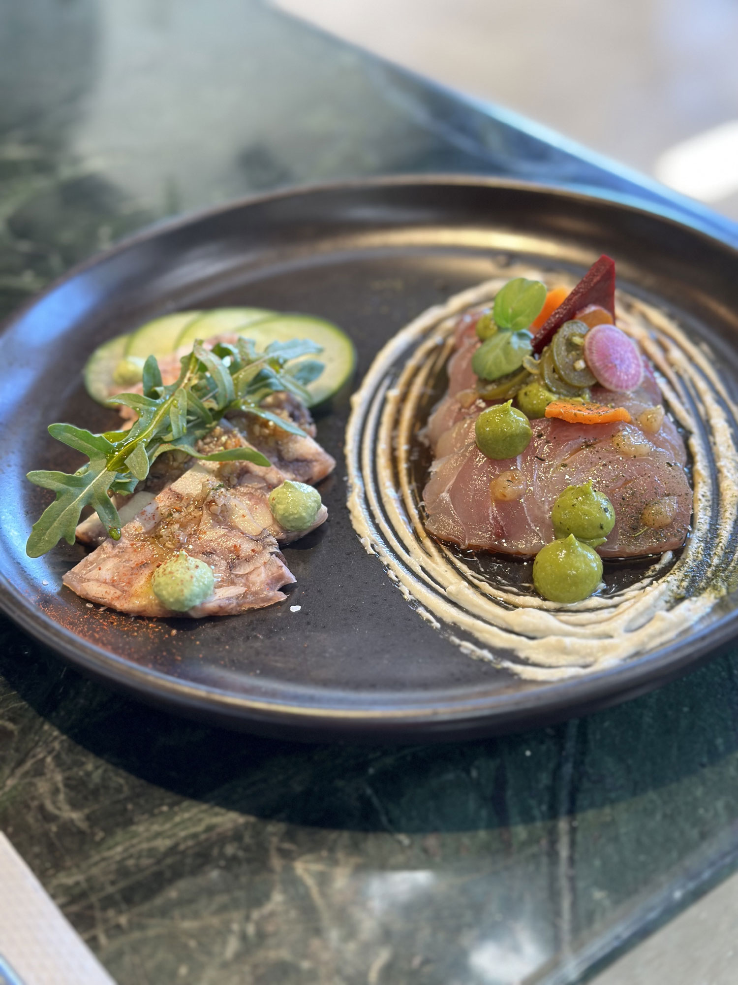The first plate was a plate with two tostadas – fresh scallops and fish fish – along with a home made habanero paste. The presentation was amazing and the flavor even more so with ponzu sauce, small balls of different chile sauce, cucumber, jalapenos, tomato, watermelon radish slices and more. The next plate also had samples of two items from their menu – the fish sashimi and octopus carpaccio. Again, the presentation was incredible and the sashimi fresh. I am not a big octopus fan but this preparation won me over. The third course featured small portions of two different risottos -avocado and mushroom and a black ink with scallops and crispy tentacles. The risotto was so good but I was full so I asked them to pack them for me to take home for dinner.
