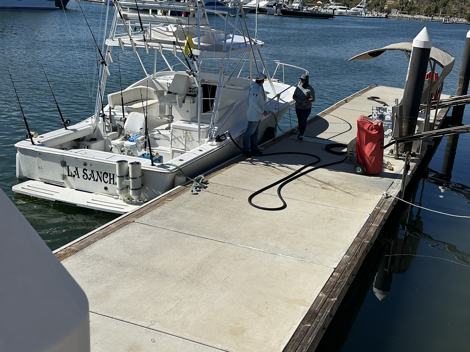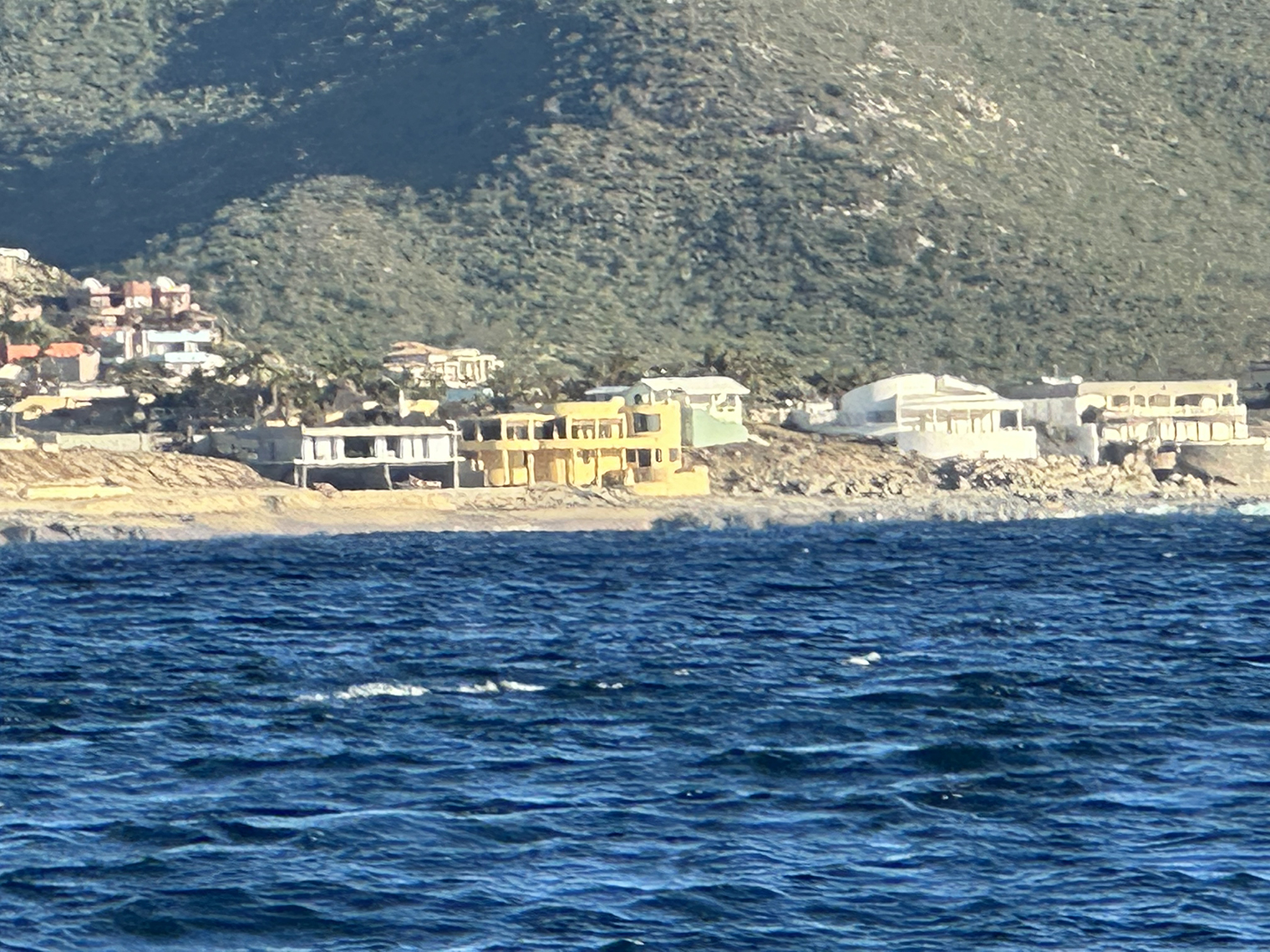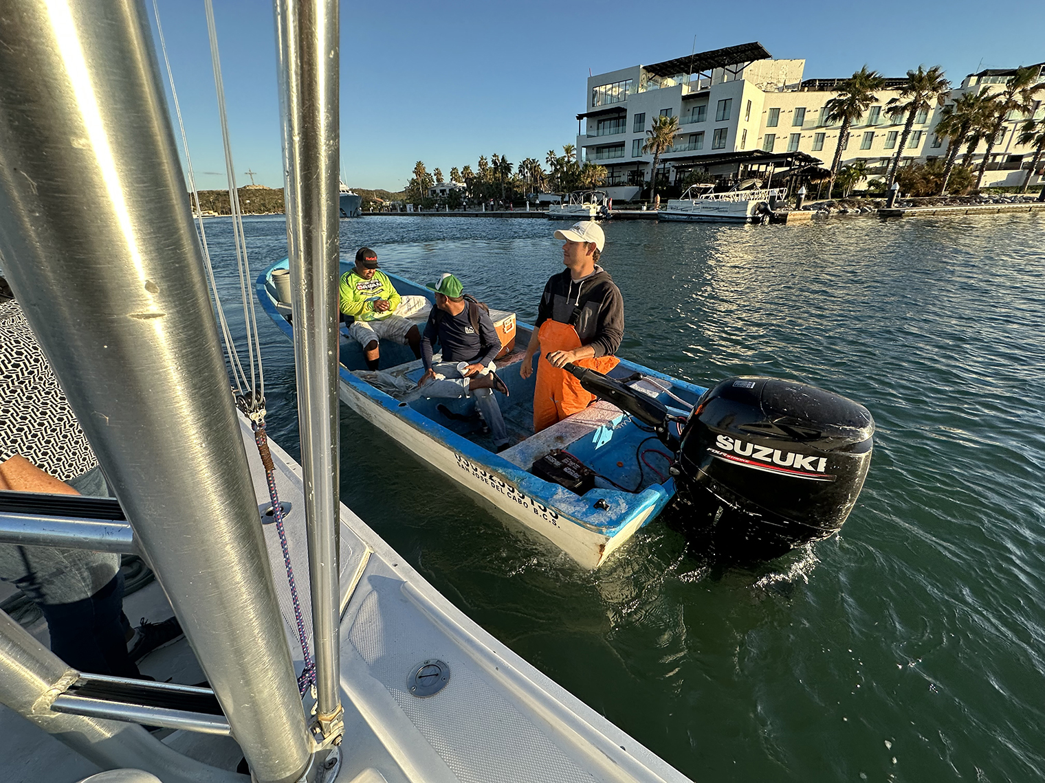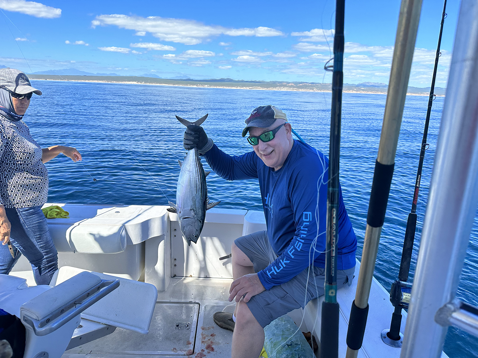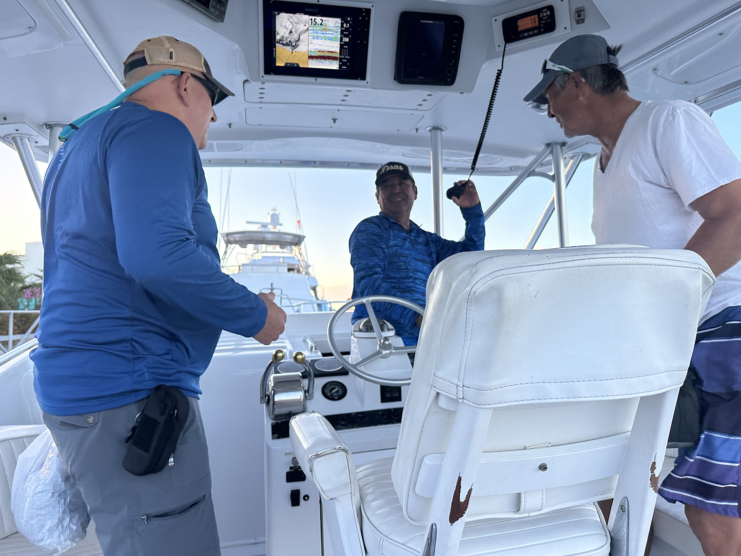 I had not been fishing for quite a while. Mike really wanted to go out to fish for tuna and dorado and so did our neighbor Walt. So Walt arranged for us to go out on La Sancha from the marina in Puerto Los Cabos with Captain Ramon and his first mate and wife Maria. Leaving the marina, we stopped while a panga pulled up alongside the boat to sell us some live bait. We headed out to the East Cape and passed our house in Zacatitos and continued on to Gordo Banks out from La Fortuna. During the first two and half hours we didn’t see much activity from the trolling as we were going. However, as it was one of the first days of the Bisbee Black and Blue, what we did see was dozens of boats traveling full out to the same area that we were going to catch their large bait fish before moving to the eastern edge of Gordo Banks to try for the big black and blue marlin.