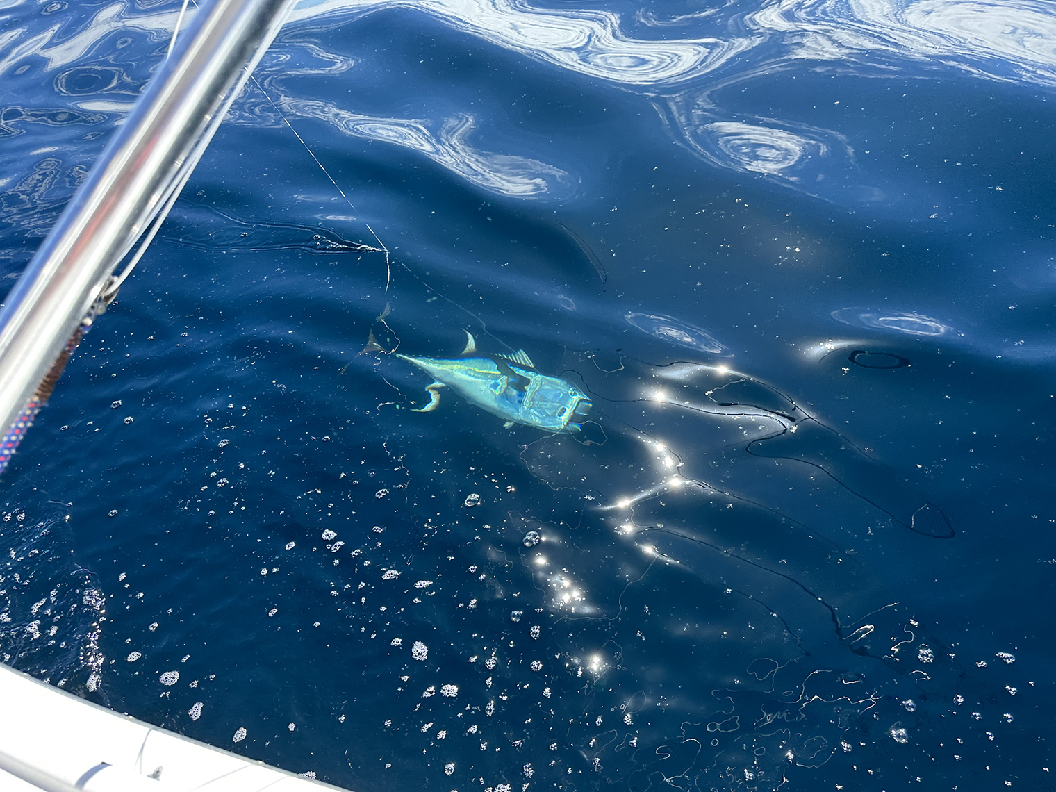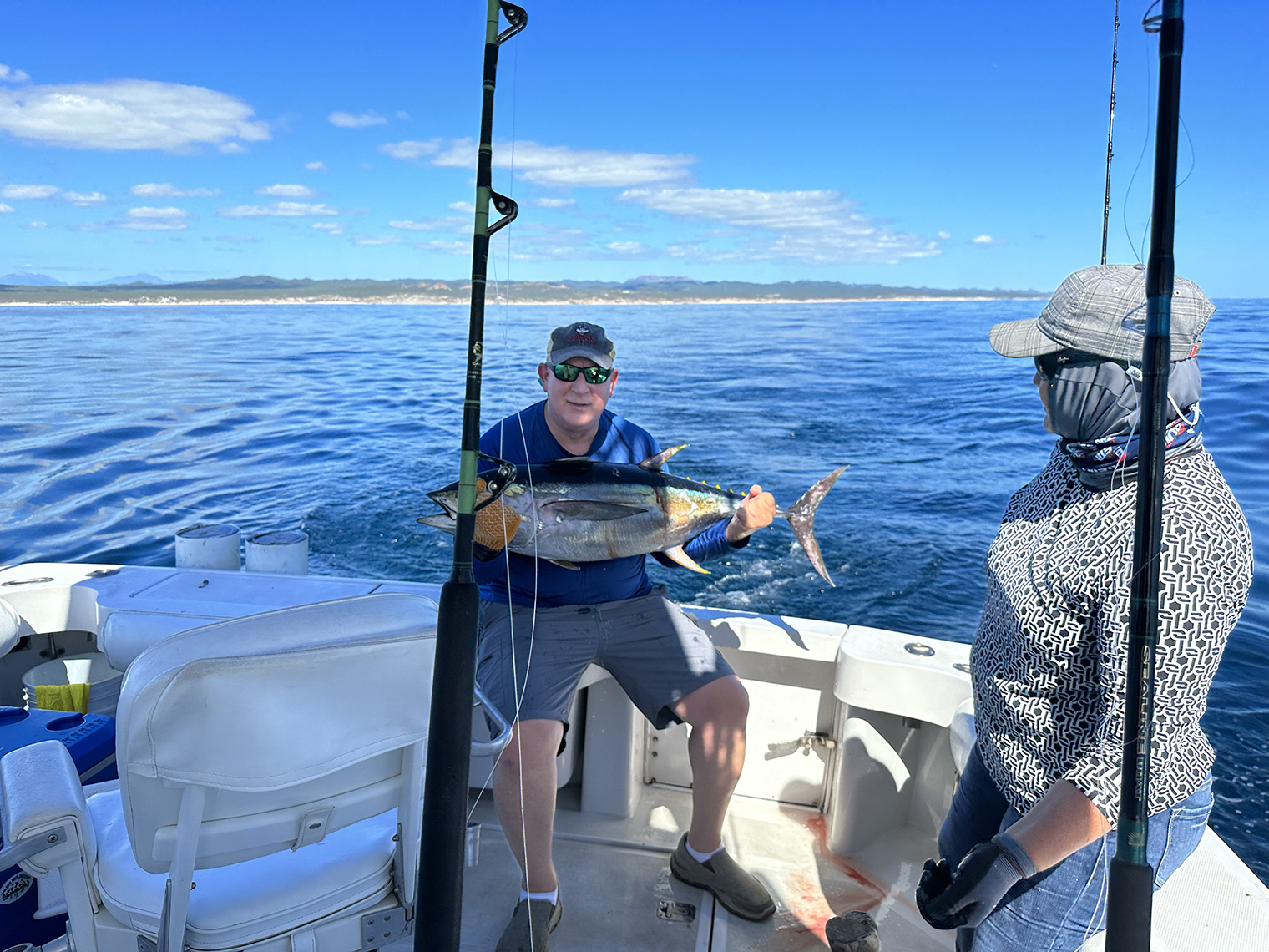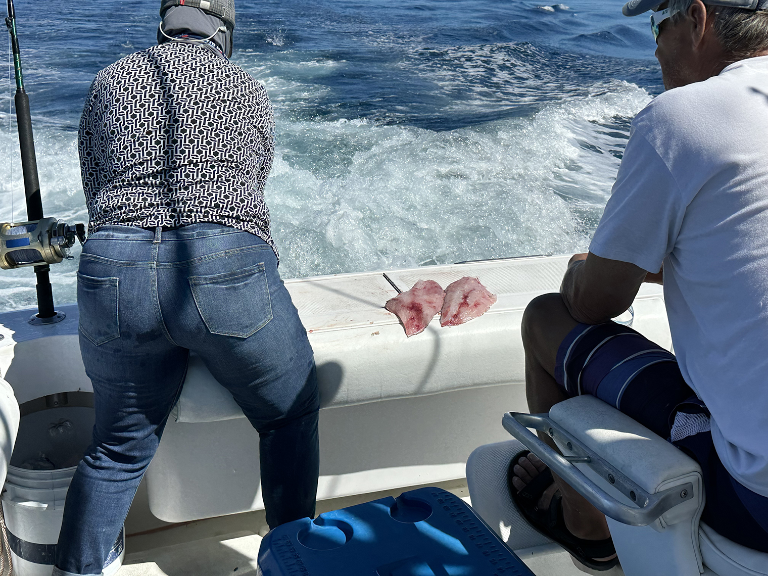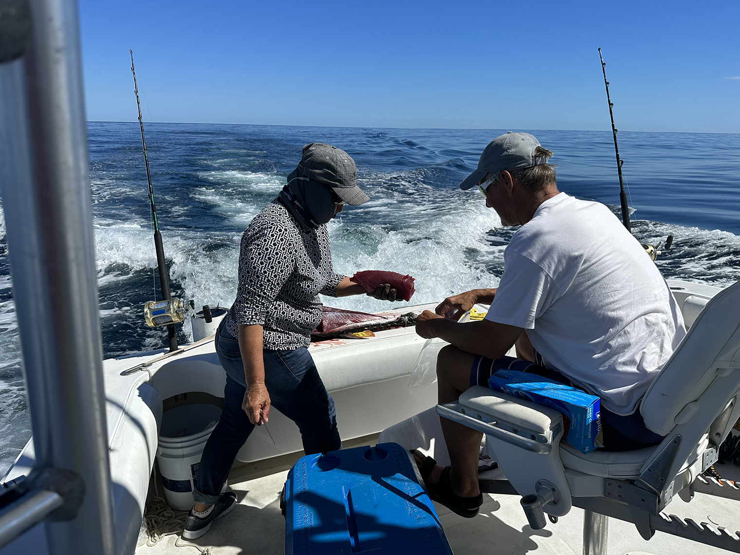 There were about 25 boats just passed us on the water when we got our first bite. The mate handed Mike the rod and the battle started. It was pretty clear early on that it was a big fish. After about 20 minutes, Mike’s arms were starting to vibrate, and he asked Walt to take over. Walt lasted about 15 minutes and Maria; the mate took the rod for a little while before handing back to Mike. This went on for about an hour and 20 minutes before we could see the fish, with every three or four feet gained resulting in the same amount being lost and the fish fought being brought to the surface. Captain Ramon had believed from early on that it was a tuna – and he was right. It turned out to be about a 50 pound Yellowfin Tuna that fought even once it was brought onto the boat.
