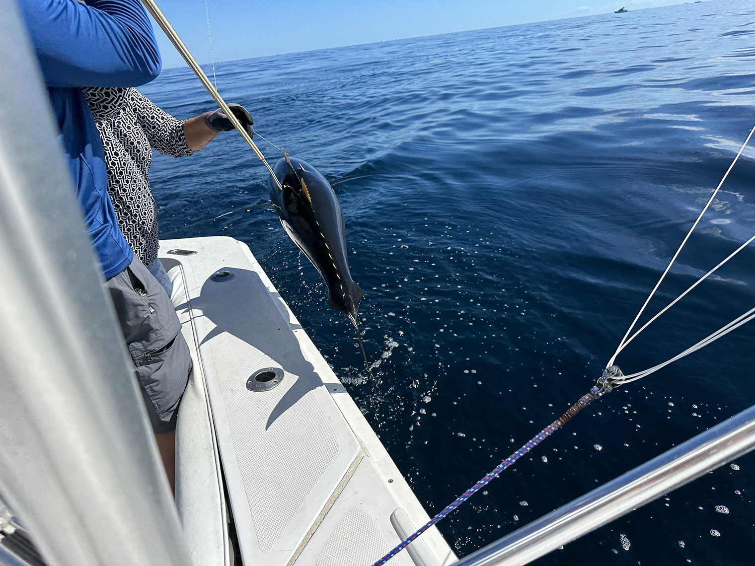 The lines were baited and reset and both Mike and Walt hoped that another fish like this would not be caught as they were both exhausted. The lines were dropped near the bottom and immediately, we started getting hits. Fortunately, none were as hard to reel in as the tuna. There were several smaller skipjack tuna that were caught and released. A fair-sized snapper and a grouper.