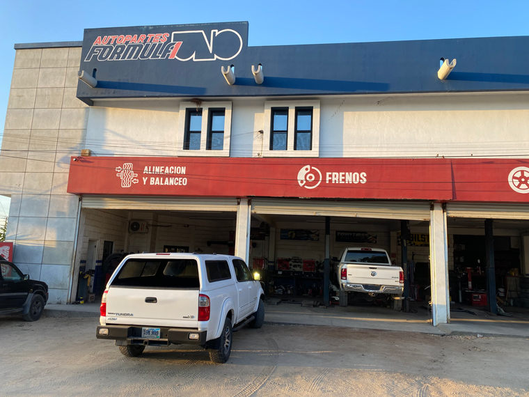 One of the challenges of living on the East Cape was the dirt roads, ruts, pot holes and topes (speed bumps) that are often hard to see. These can be very hard on a car or truck’s suspension. I noticed the front tires on my 2005 Toyota Tundra starting to wear on the outside so that I knew they were out of alignment. I stopped at a few places that advertised doing alignments and none of them actually did. I then was told by my friend Robert Ruyg that the only place to go was Formula Uno on the road to the airport across from the first Soriana location. Robert said that the father had started the business, grew it and trained his two sons to take it over. It is now one of the best places for general service in San Jose del Cabo. They do oil changes, brakes, tires, suspension work and more. It is also a full auto parts store.